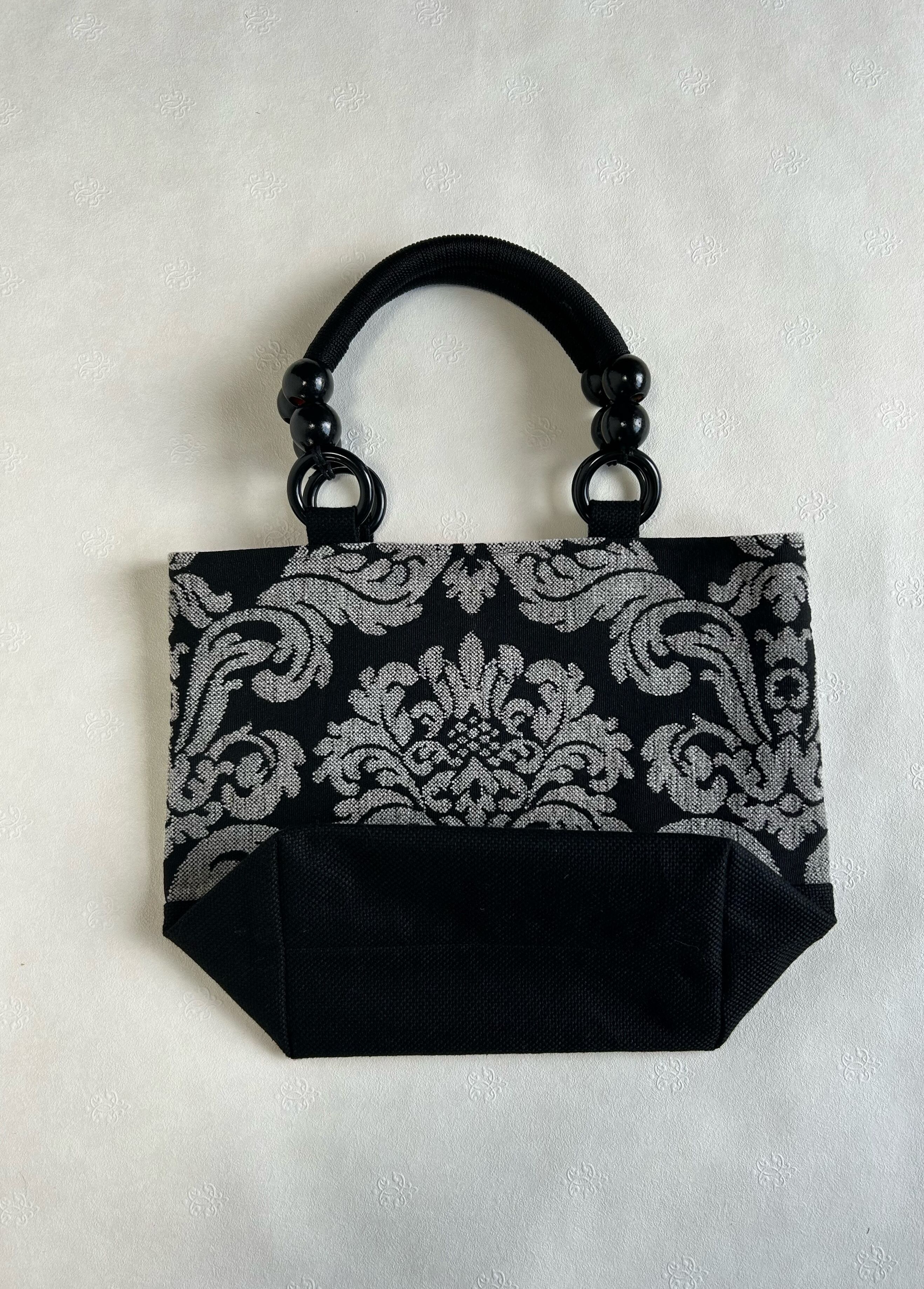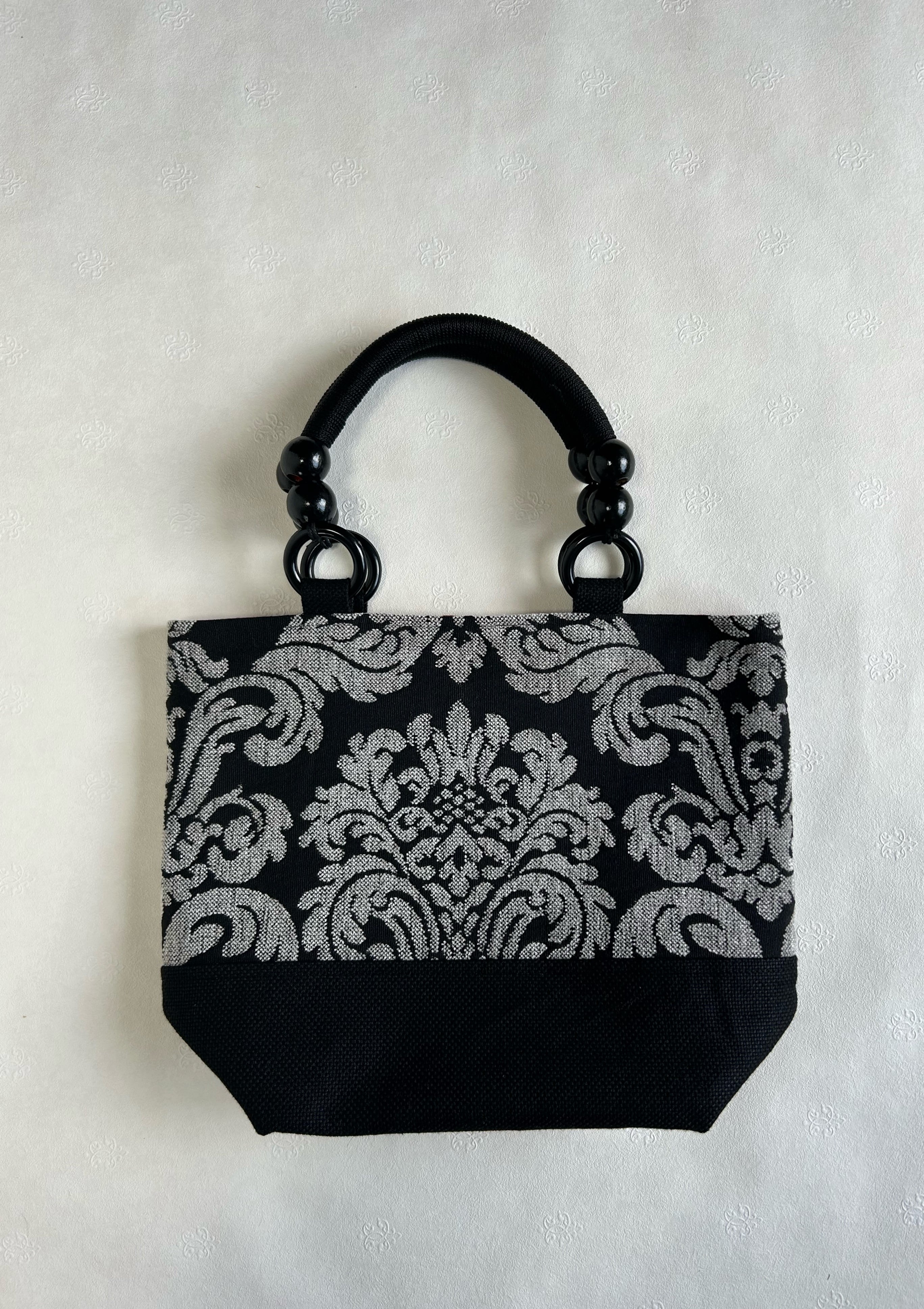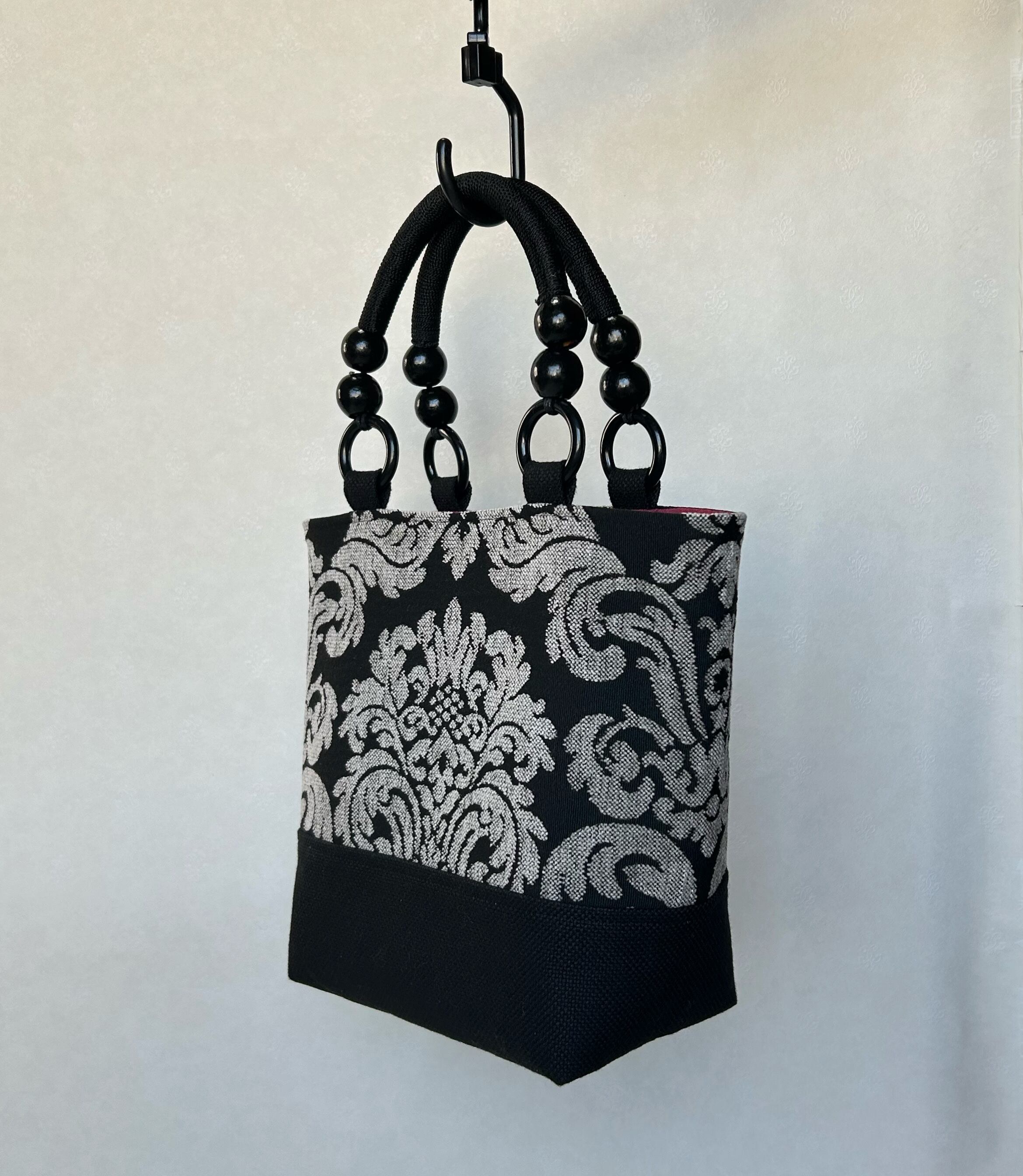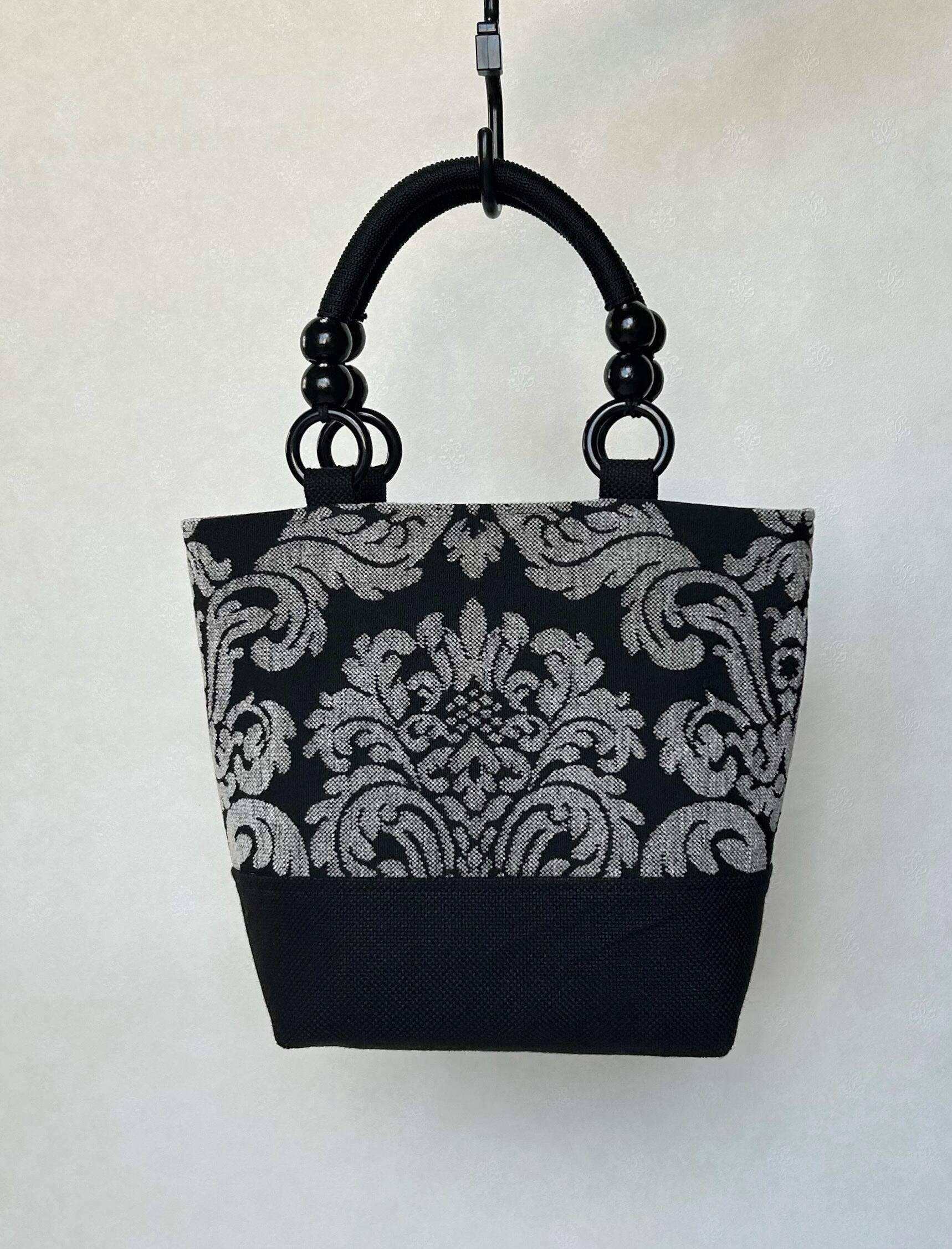 白黒ダマスク柄のツートンカラートートバッグです。モールジャガード織のしっかりした生地に芯を貼り作っているので自立します。