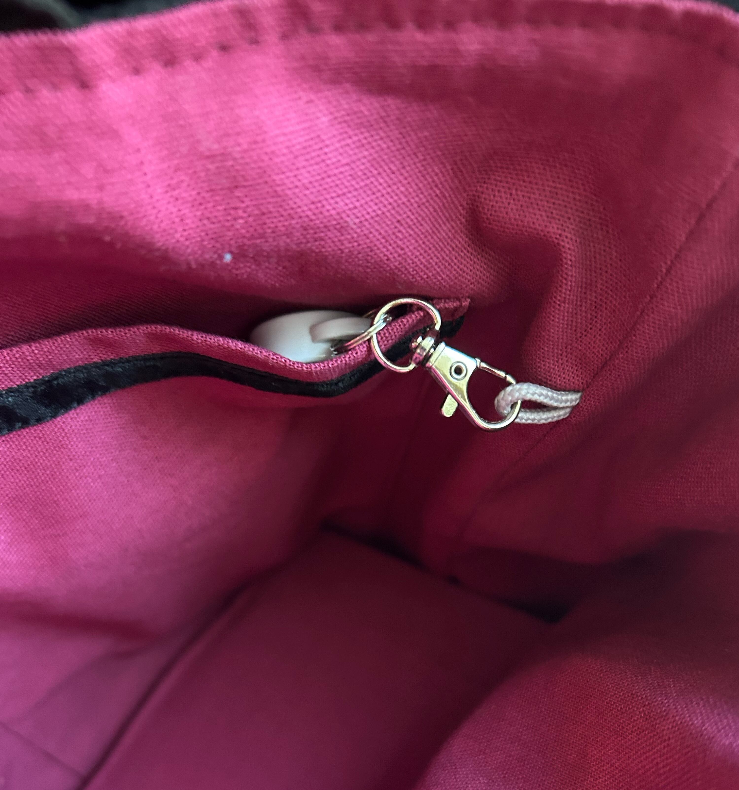 市販の木製ボール付きの持ち手を使用した上品なバックで、裏地は落ち着いた赤の綿麻生地を使っています。アクセントにもなり中が見えた時にもオシャレです。