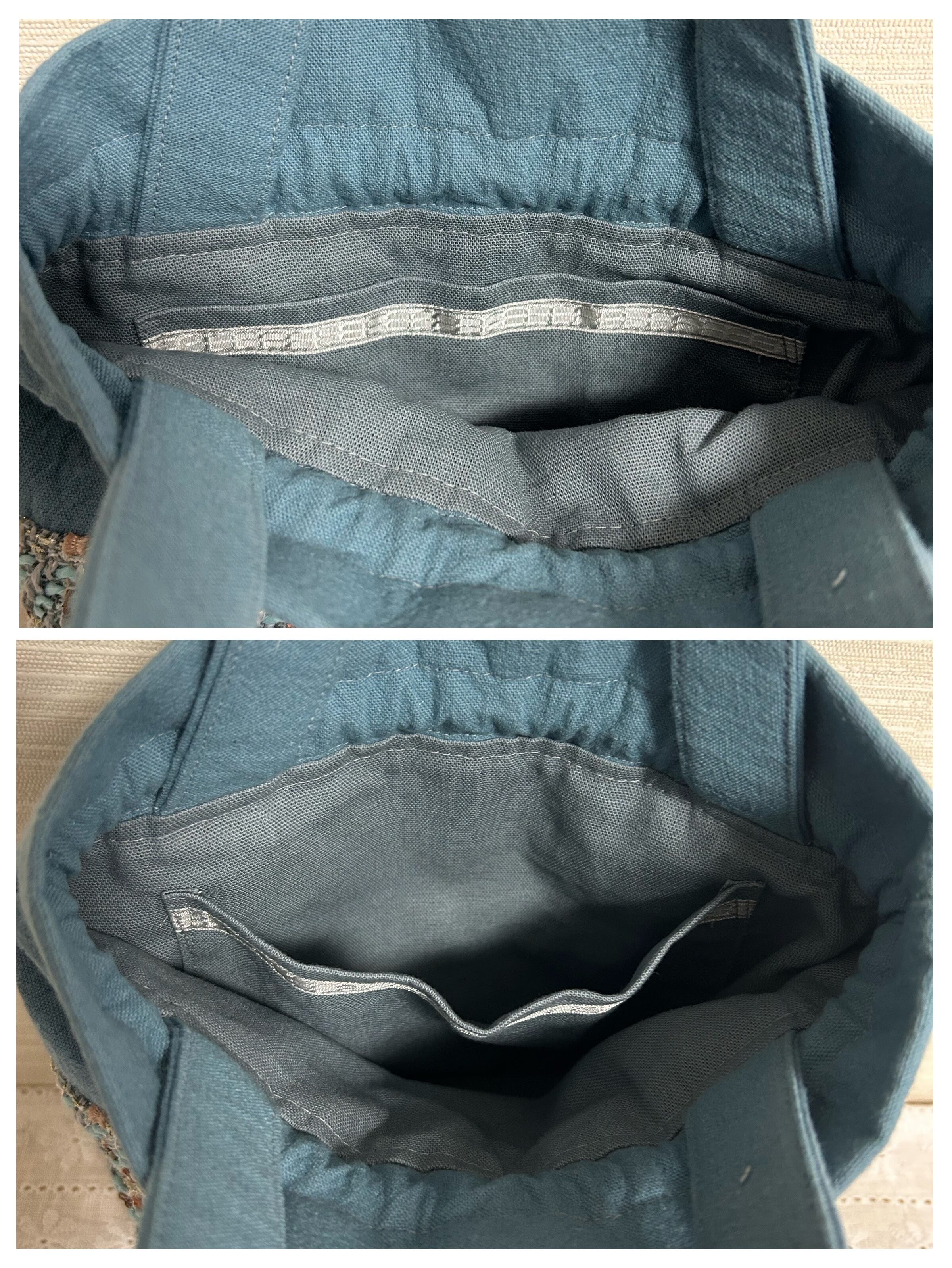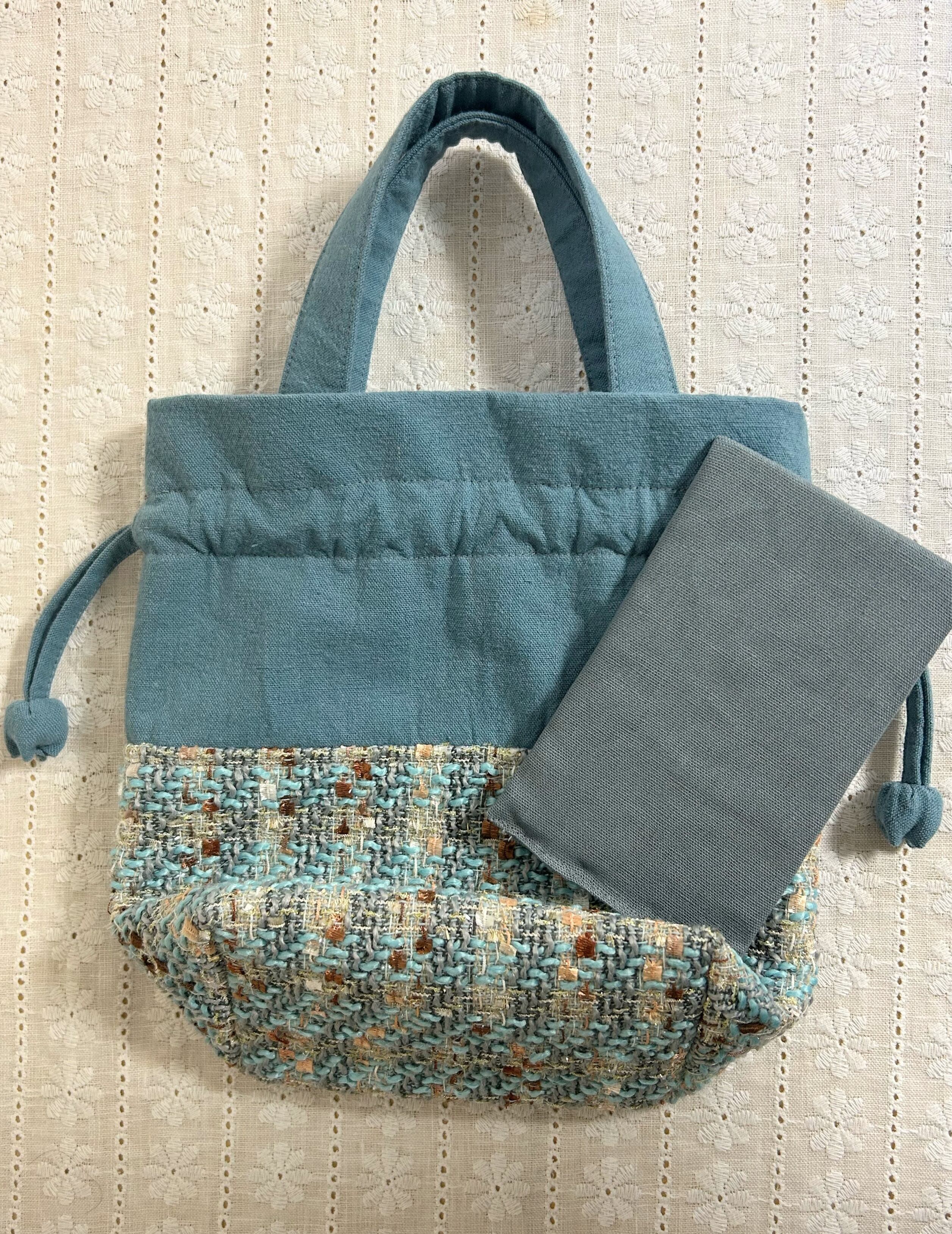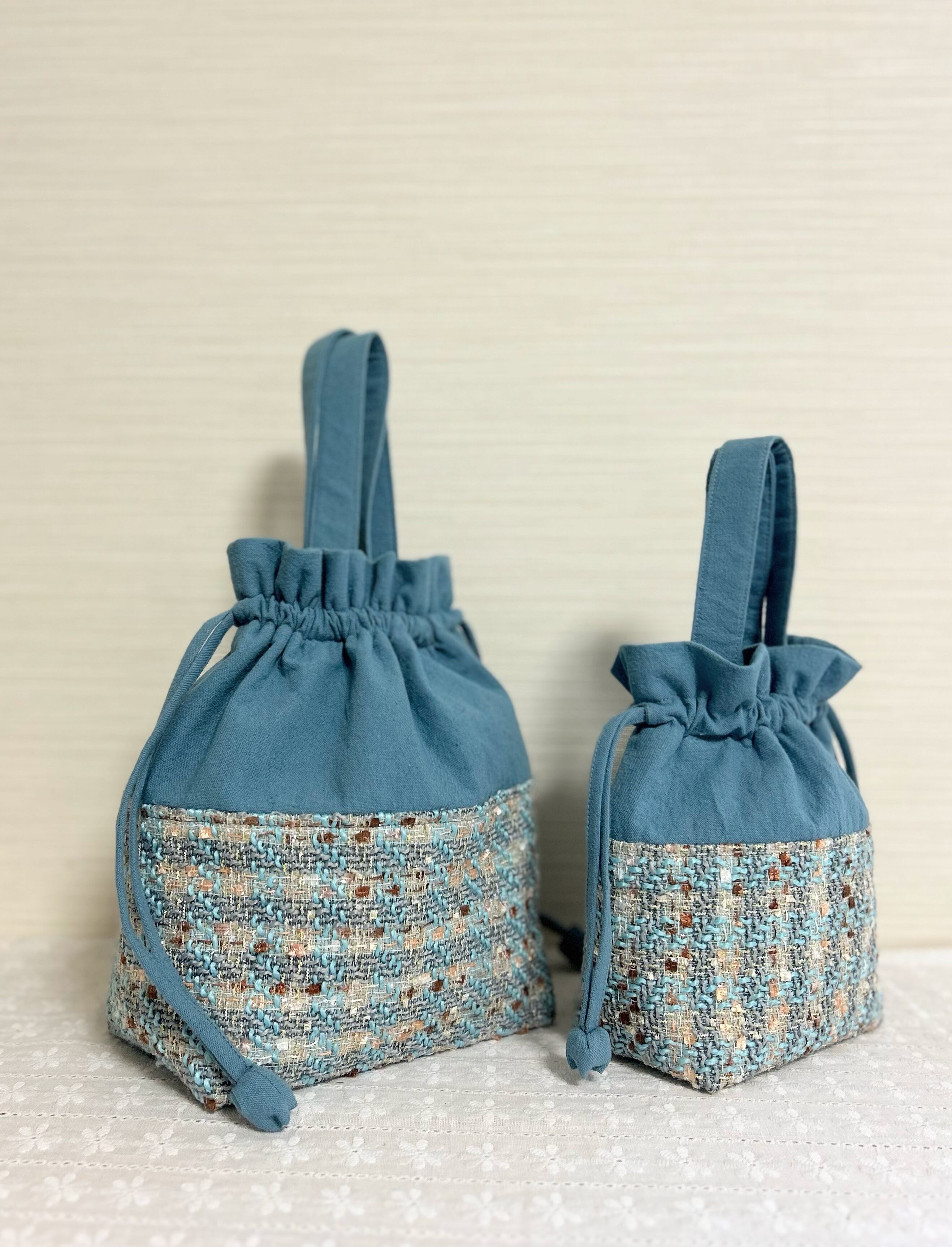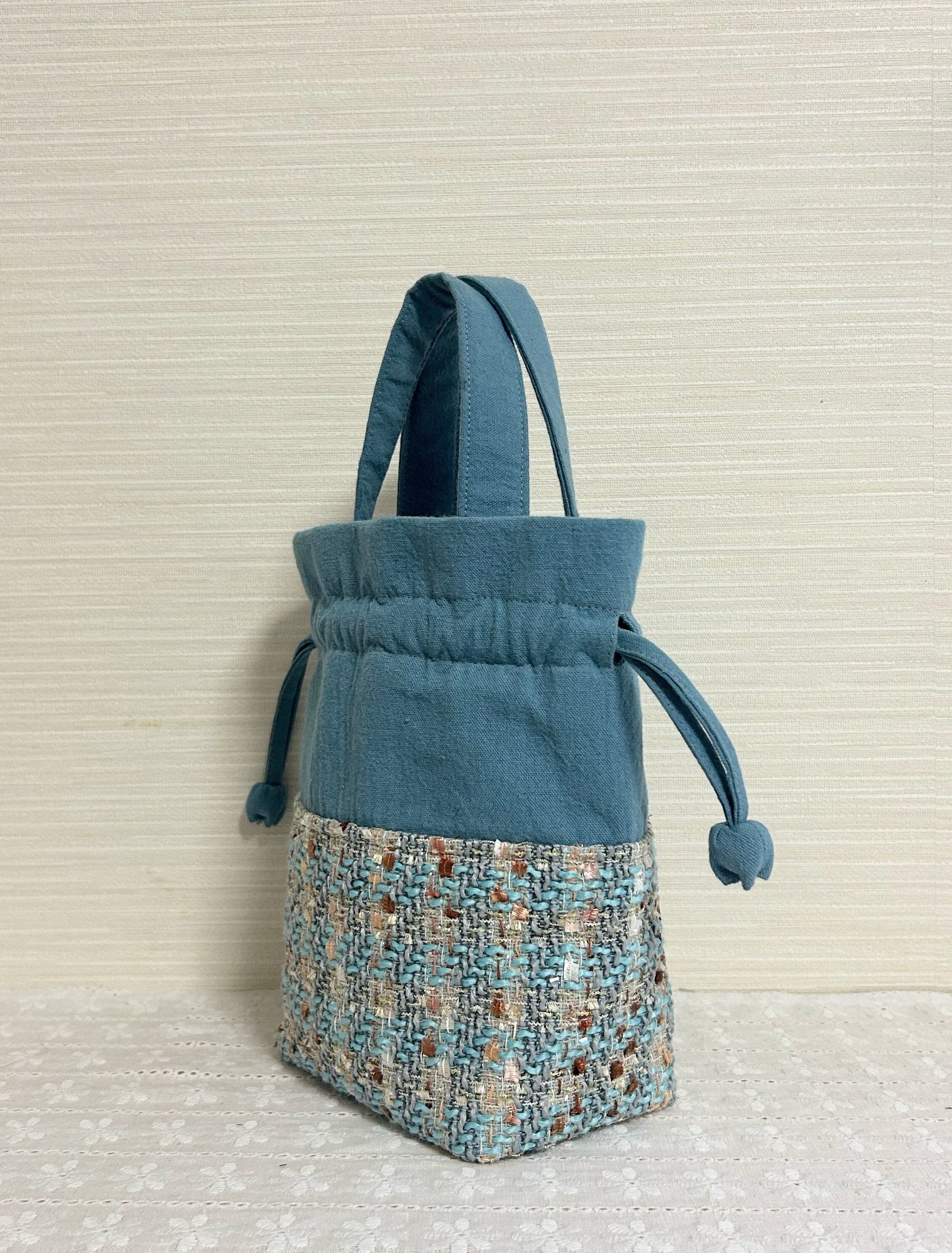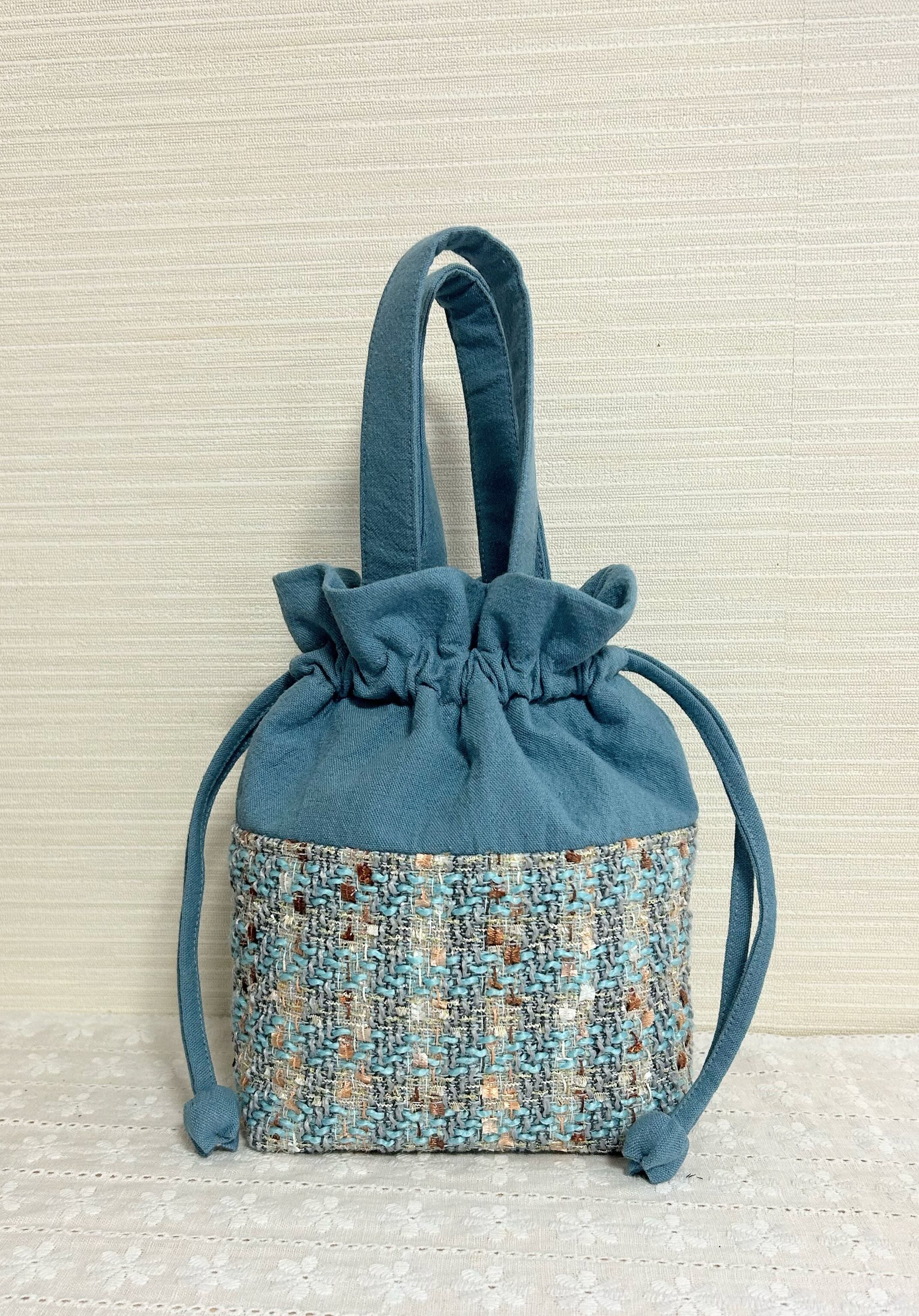優しいブルー系のツイード生地でトートバッグとしても巾着型でも使えるツーウェイバッグです。