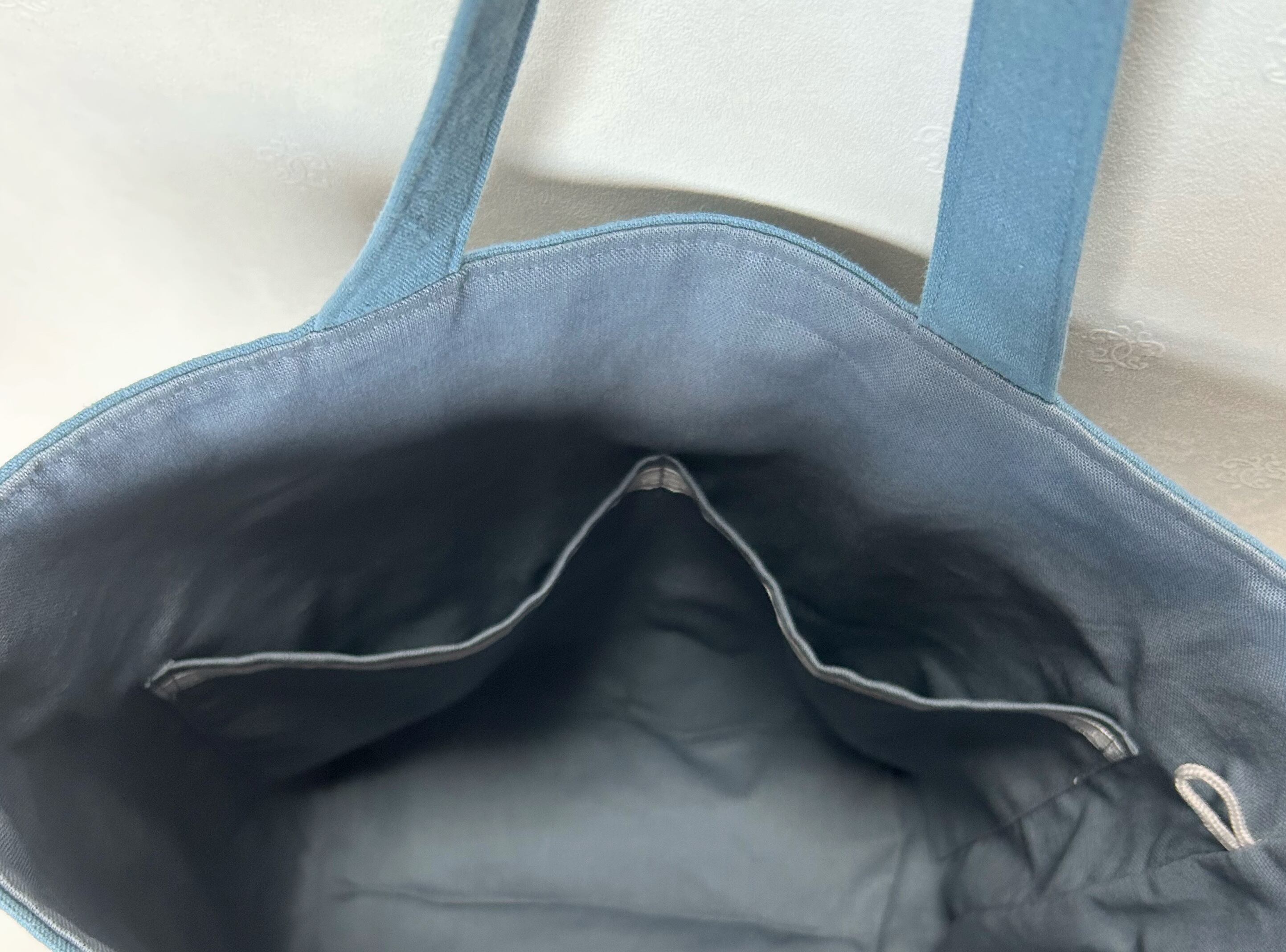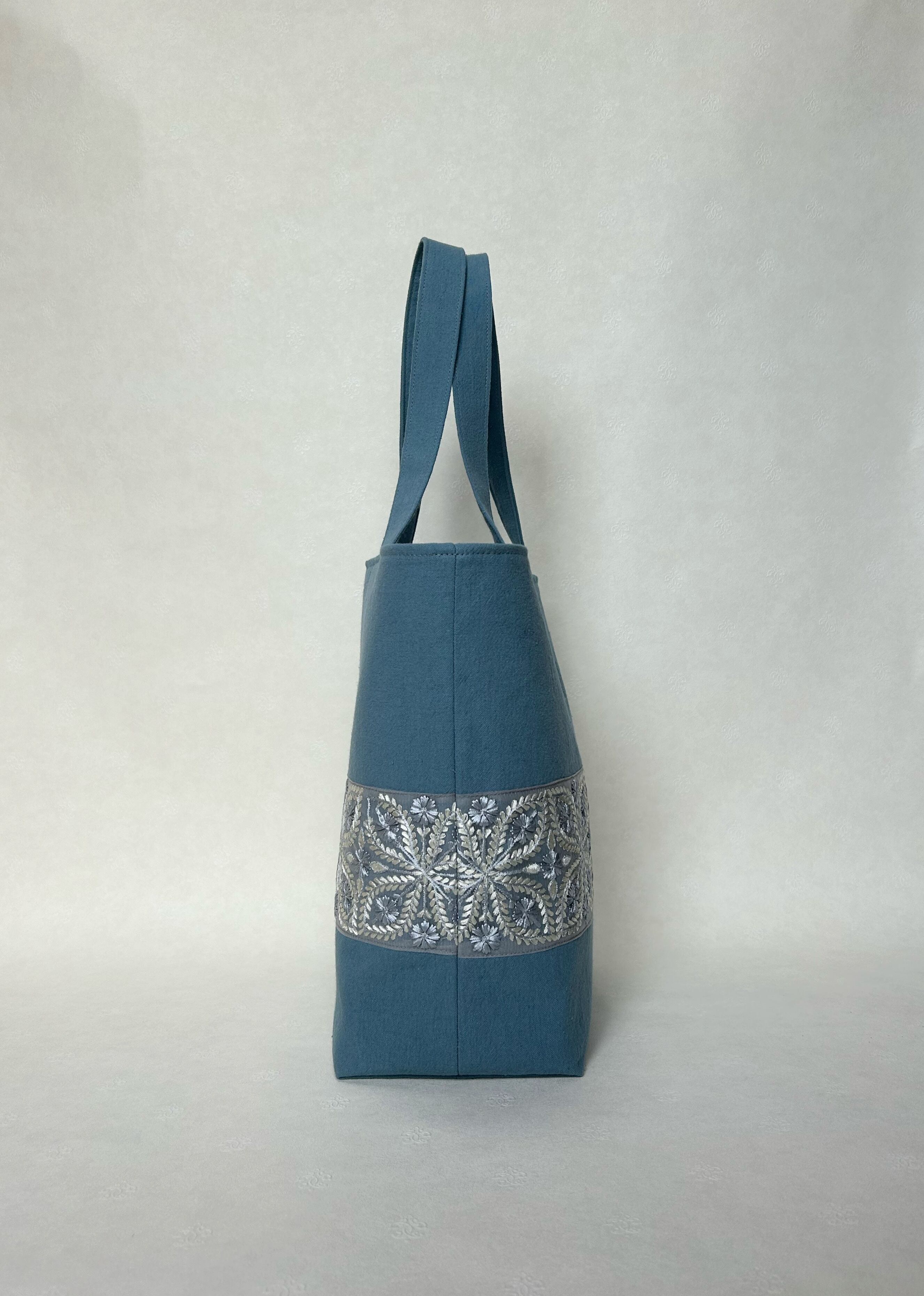 幅広ブルーグレーインド刺繍大きめトートバッグ