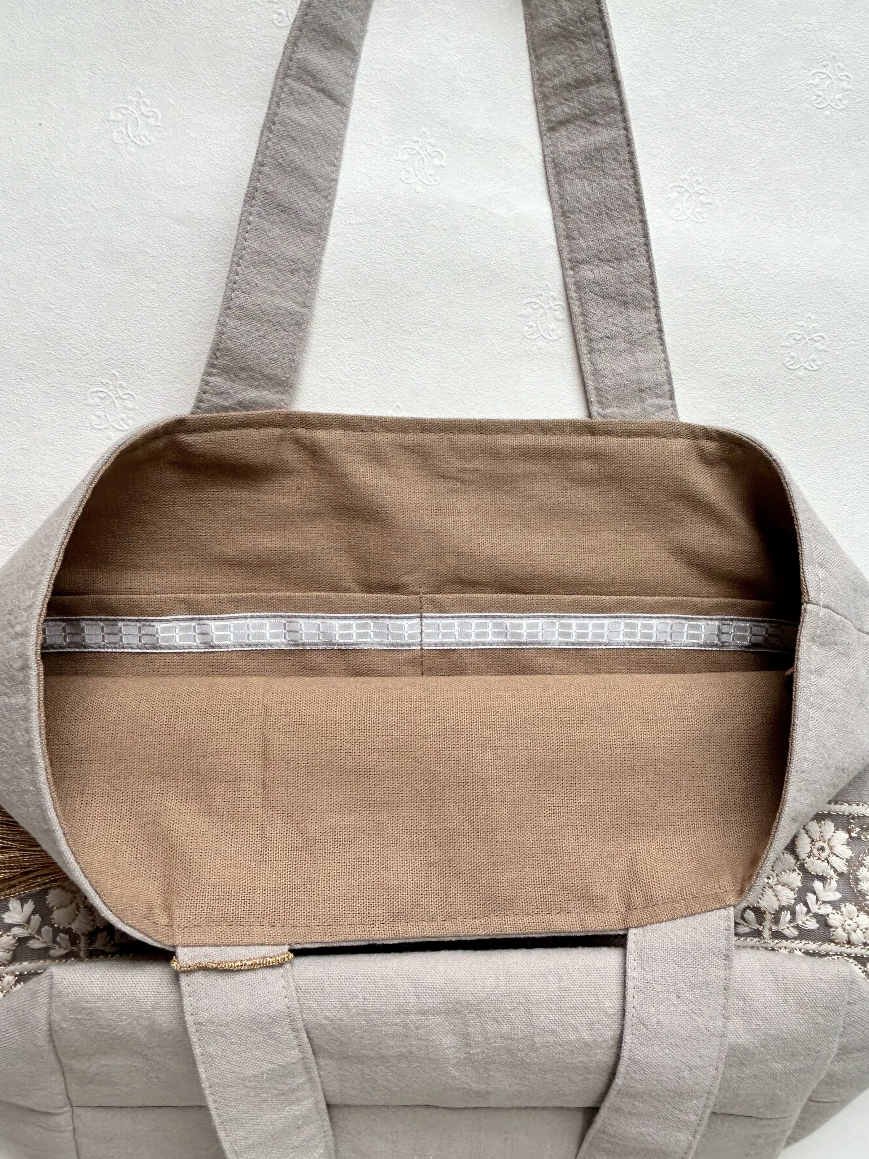 バック地にはグレージュの厚手の綿麻生地を使い刺繍との相性も良く、また金色のタッセルも合わせて落ち着きのある上品なバックになりました。