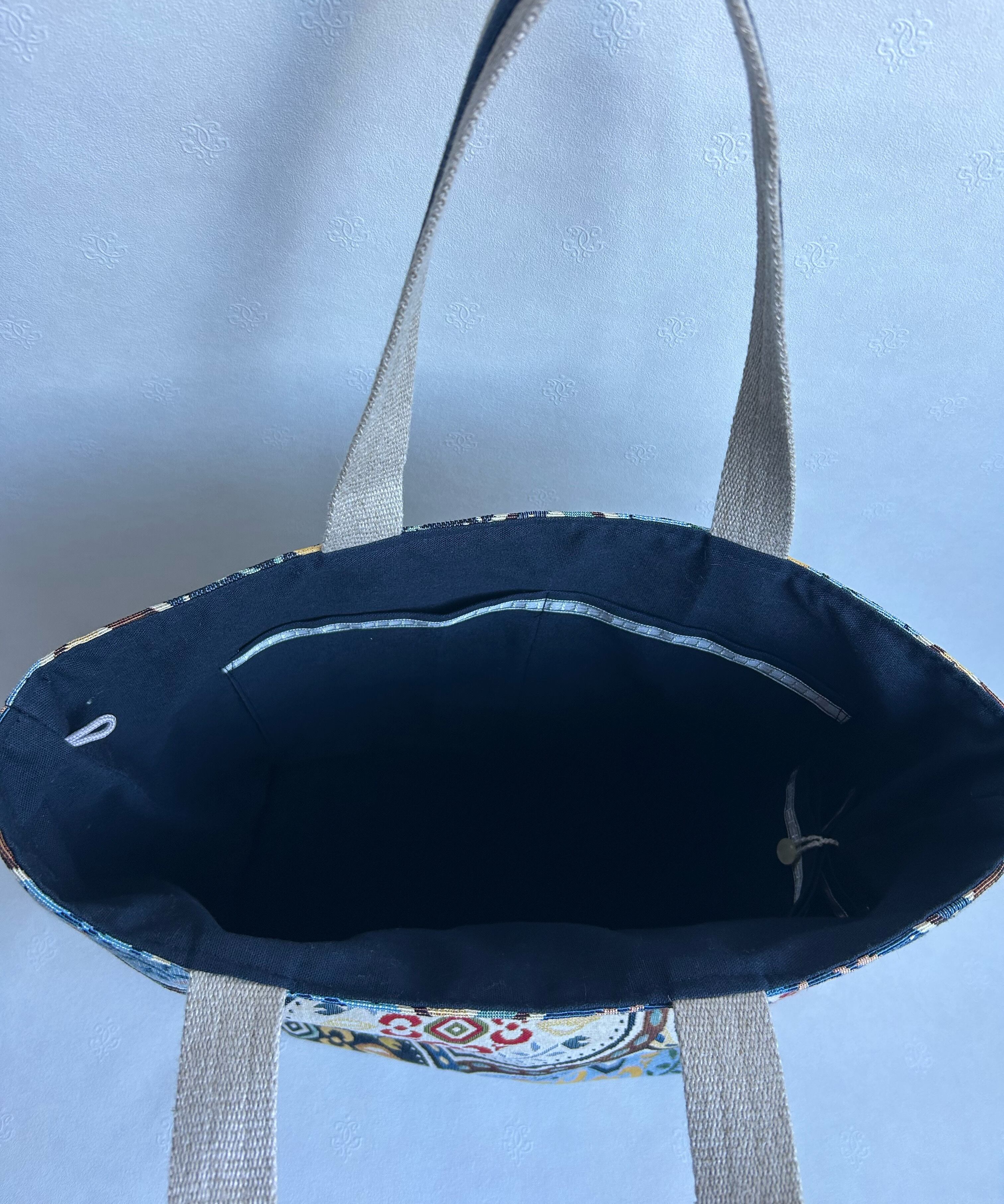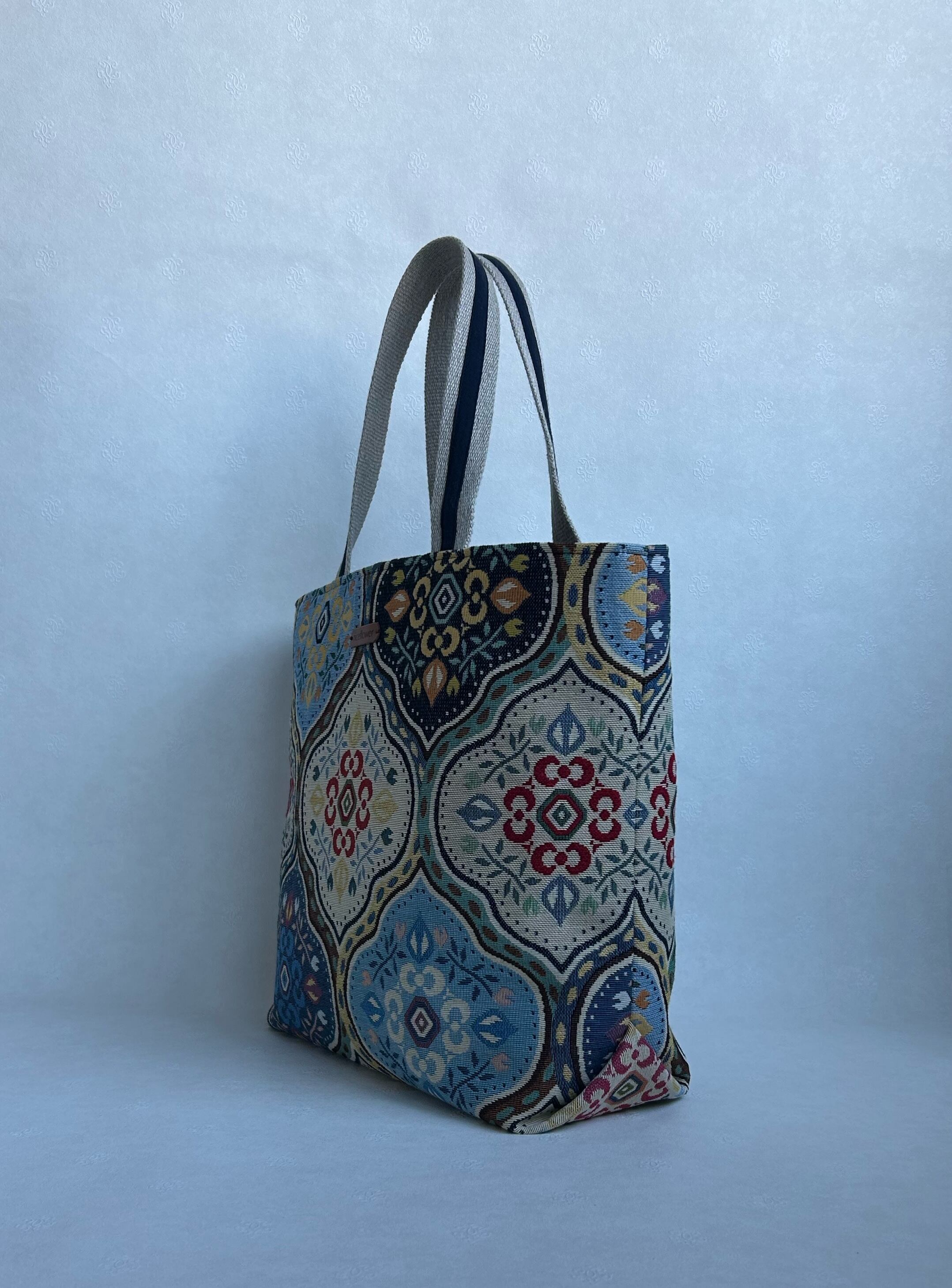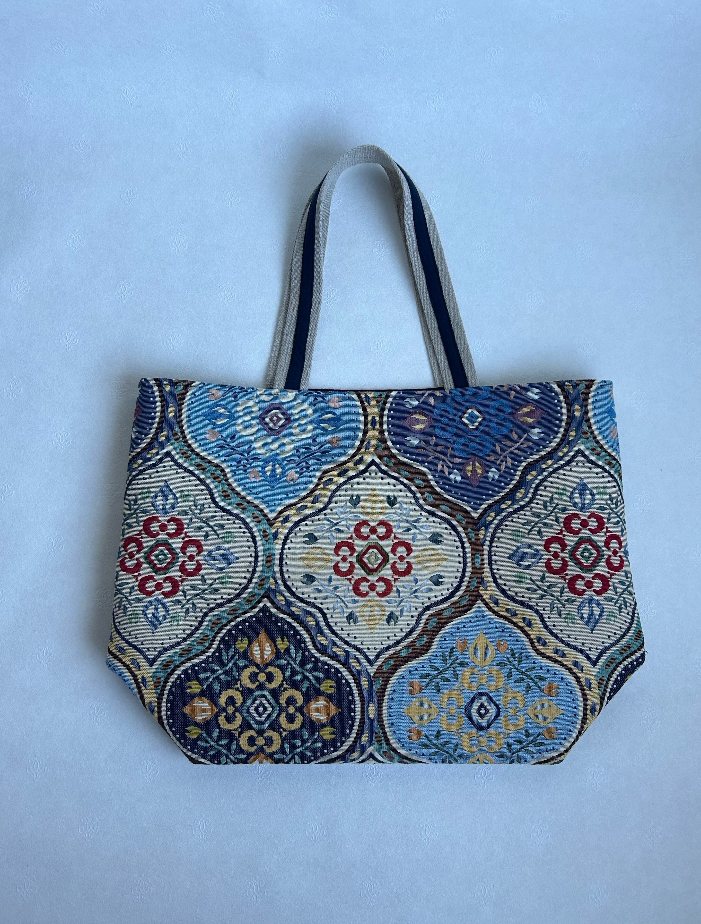 スペインのゴブラン織、モロッカン柄の美しいデザインが目を引く大きいトートバッグです。