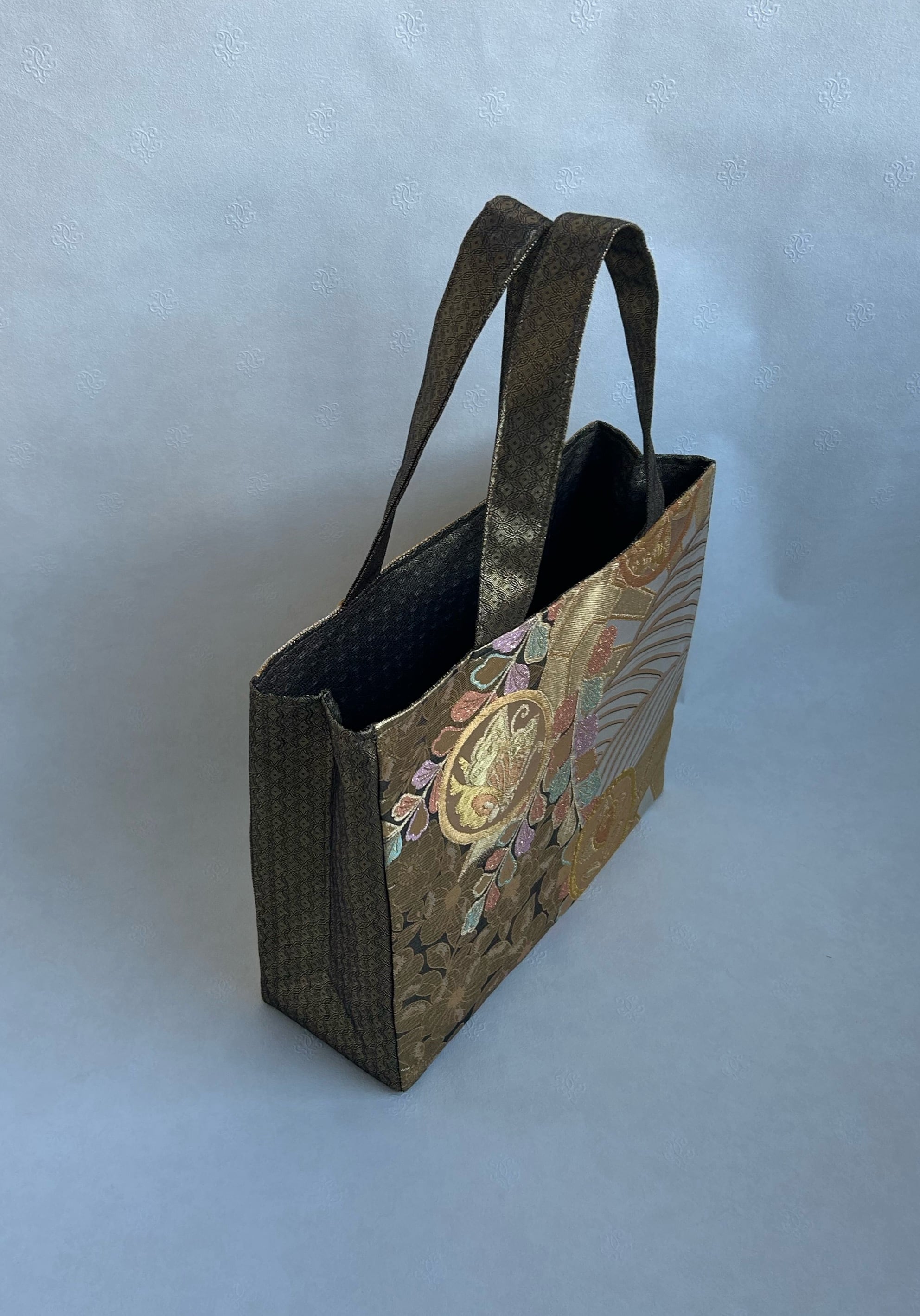 紋模様、蝶 桐の花 波 藤が織りなす美しいデザインの辻ヶ花、未使用の正絹袋帯を使用しています。芯を貼ってお作りしているのでしっかりしたバックで自立します。