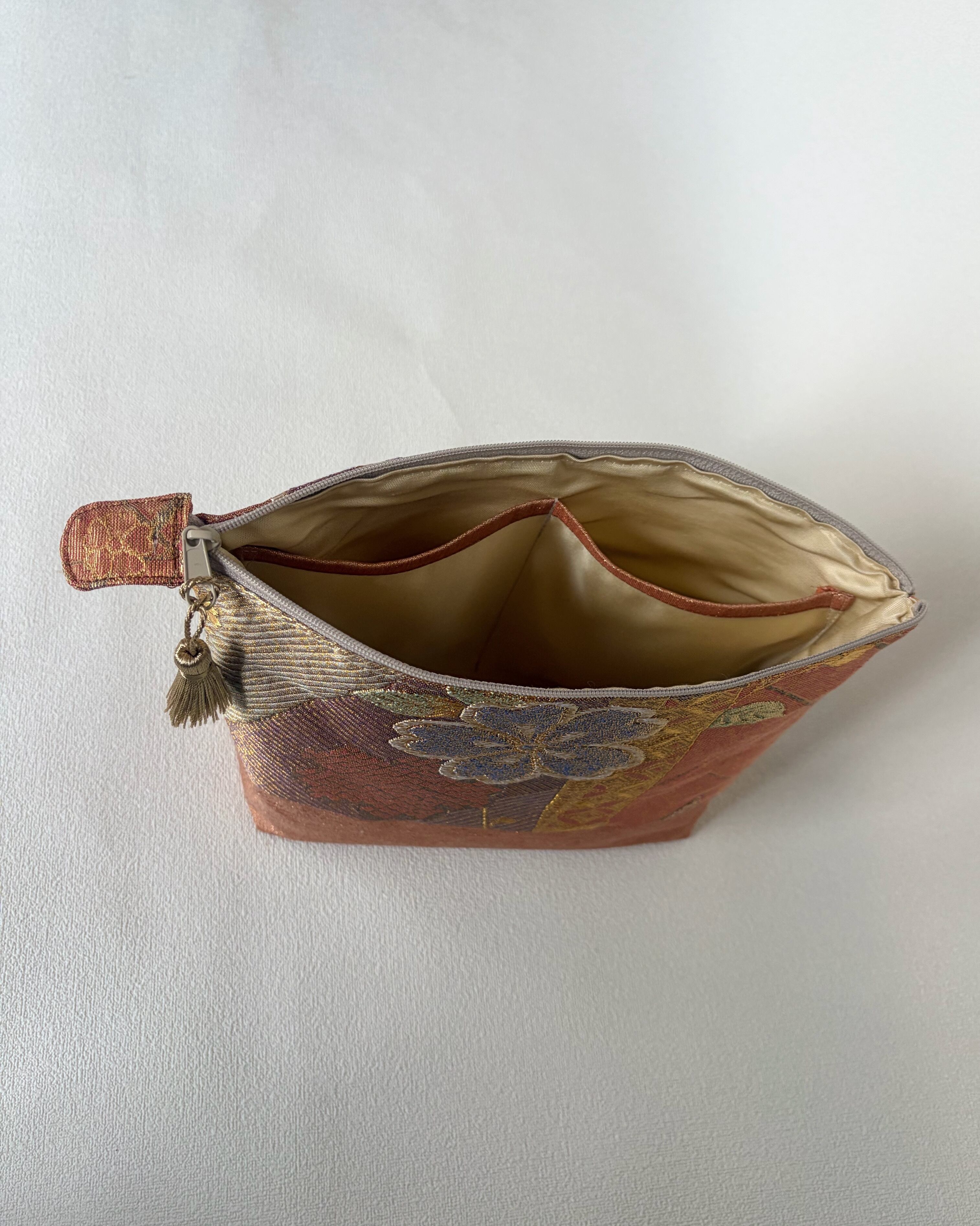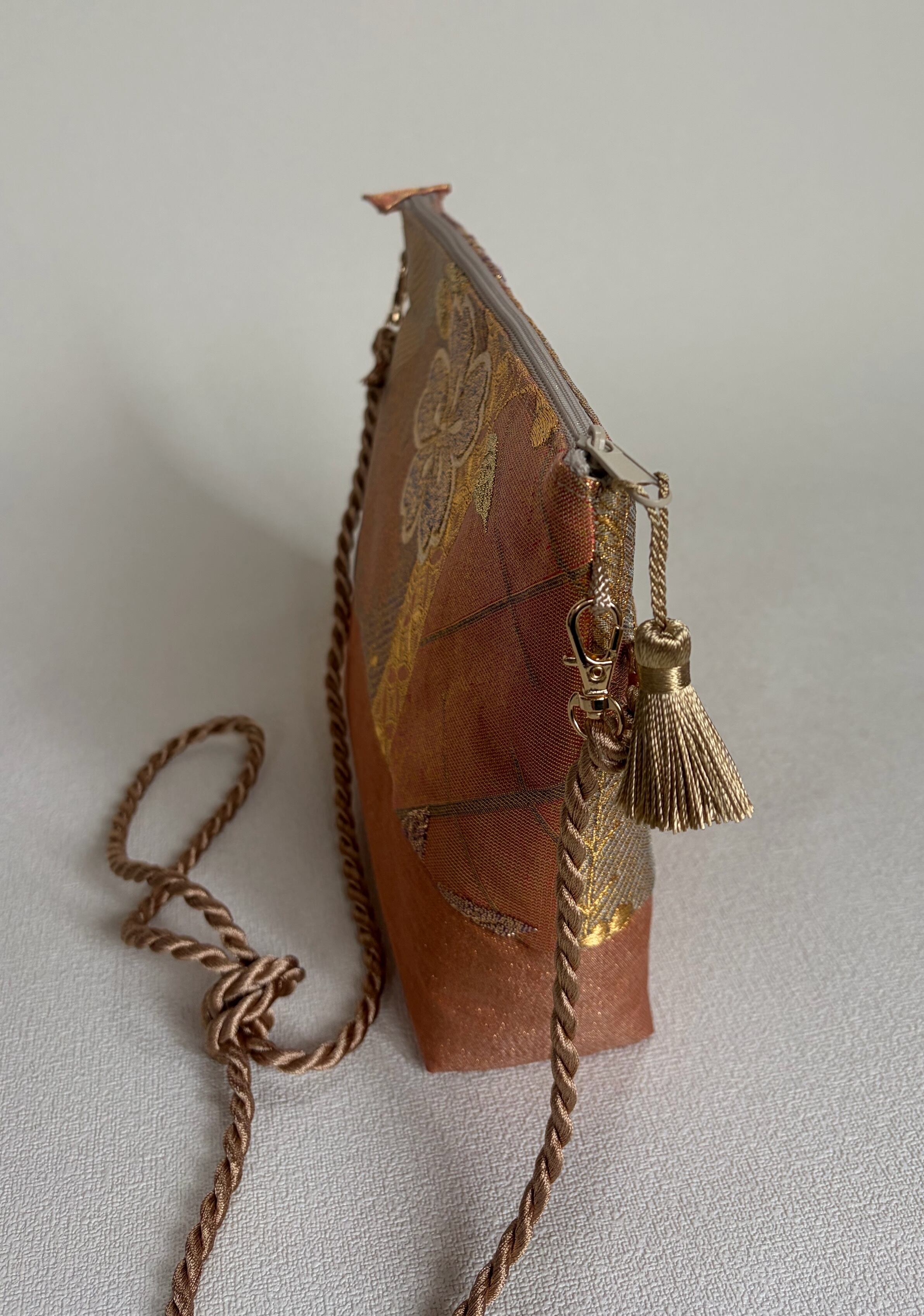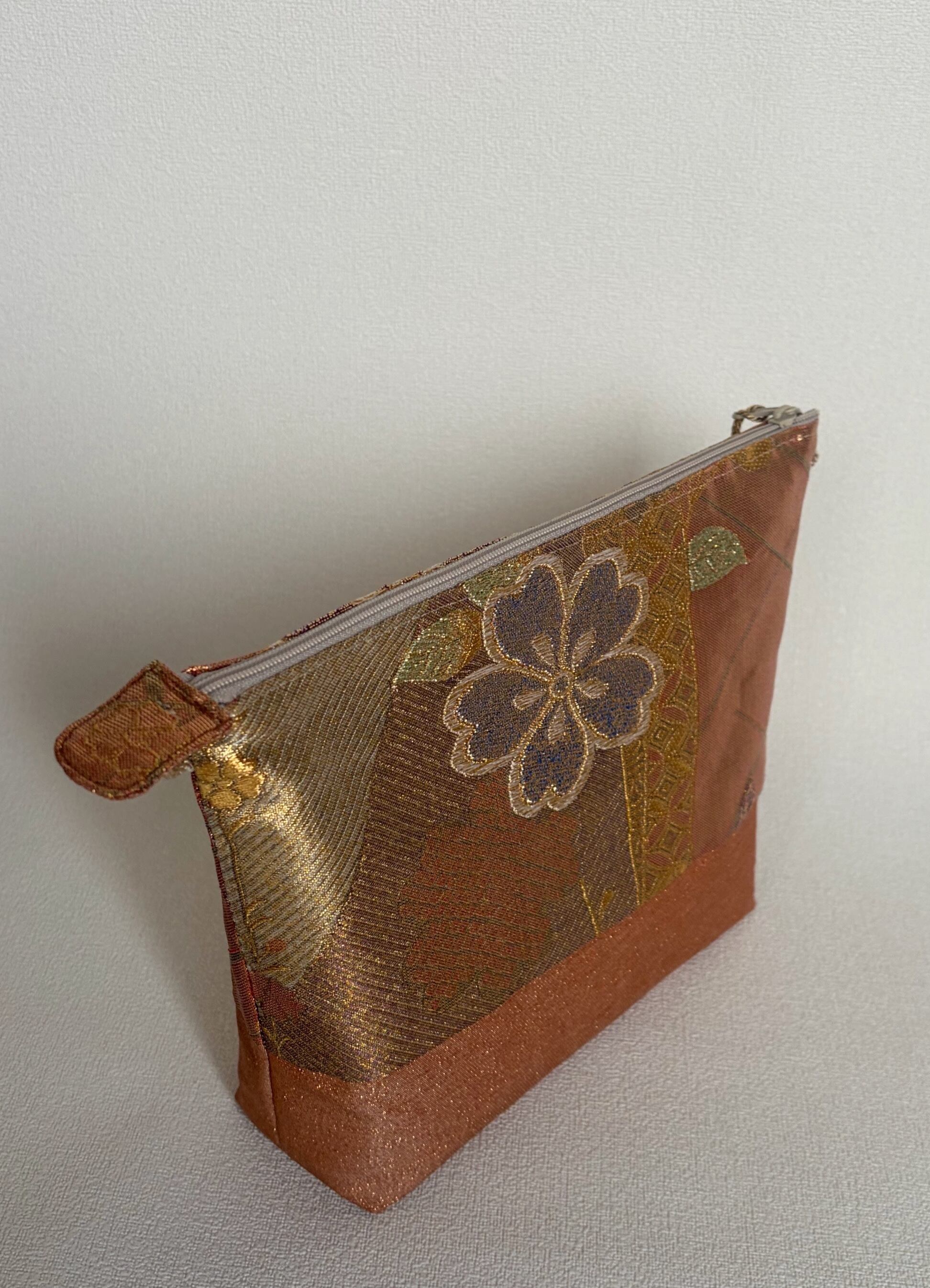 素材は正絹帯を使用しており、自然な艶感が魅力です。また、ファスナー終わりには共布でお花部分を生かしたタグを付けました。