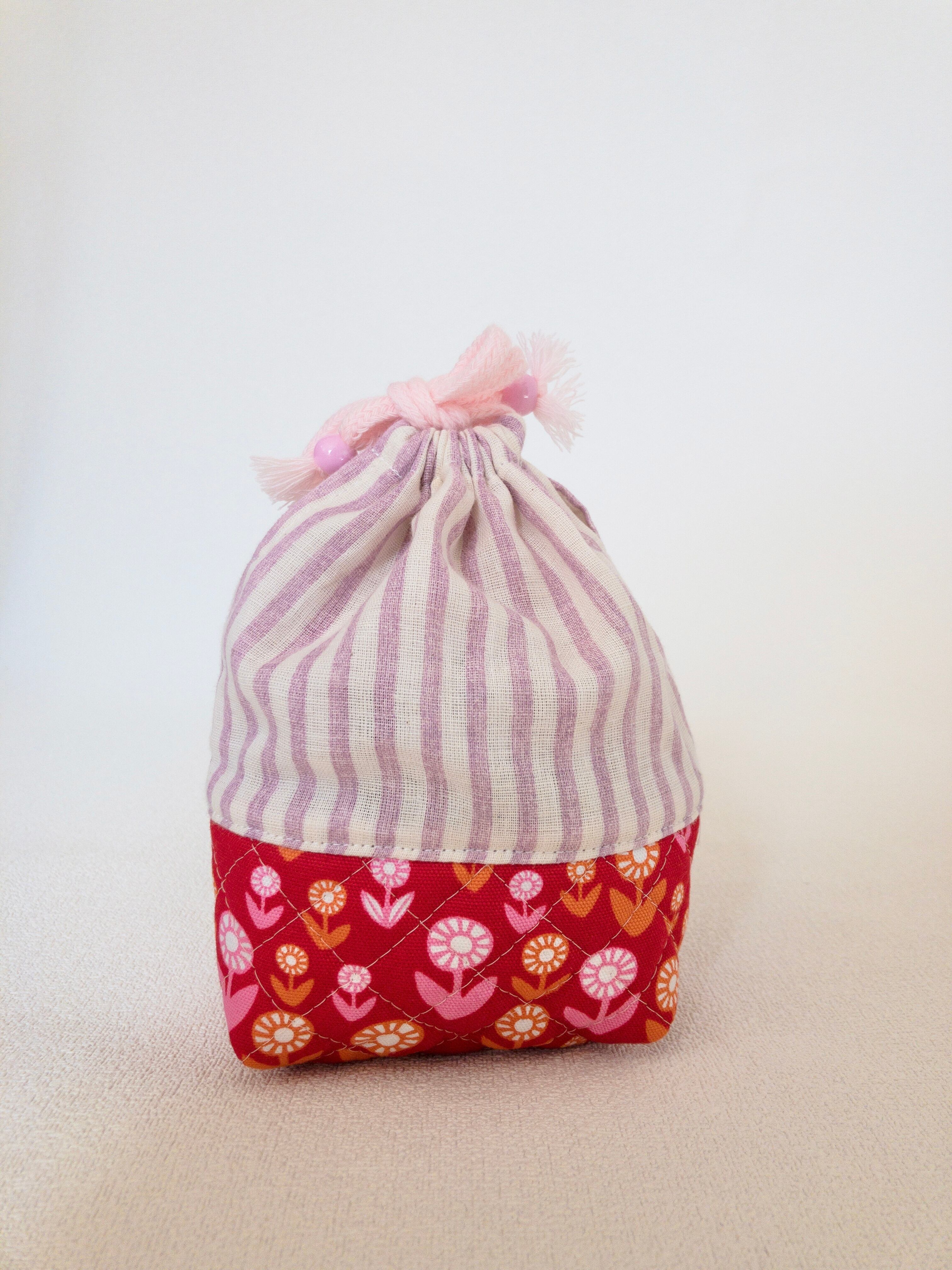 コップ袋は小さいサイズなので上部はキュッと閉めやすくする為薄い布で切り替えて作ってあります。