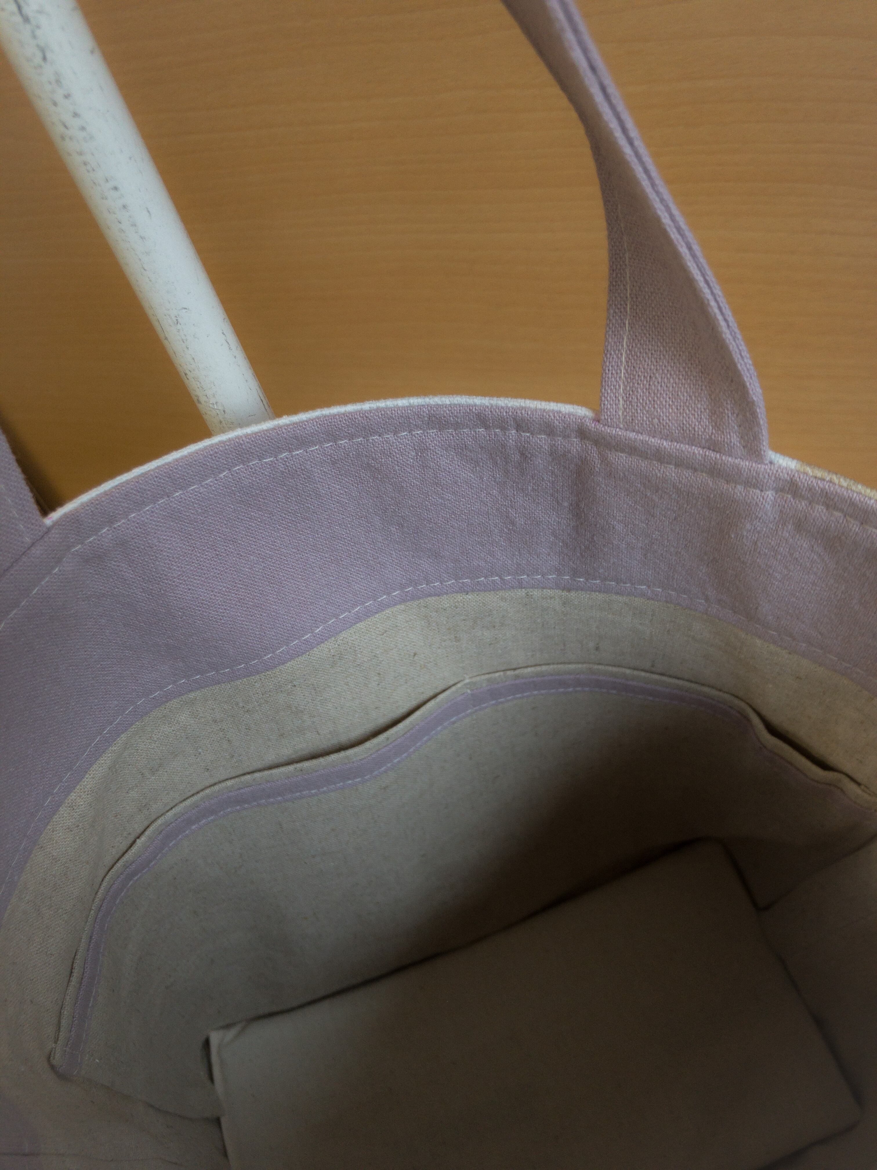 ポケット口はピンクの共布でリボンテープ作り縫い付けました。お洒落なだけで無く携帯などしまう時にもすぐに位置が分かり使い易いです。