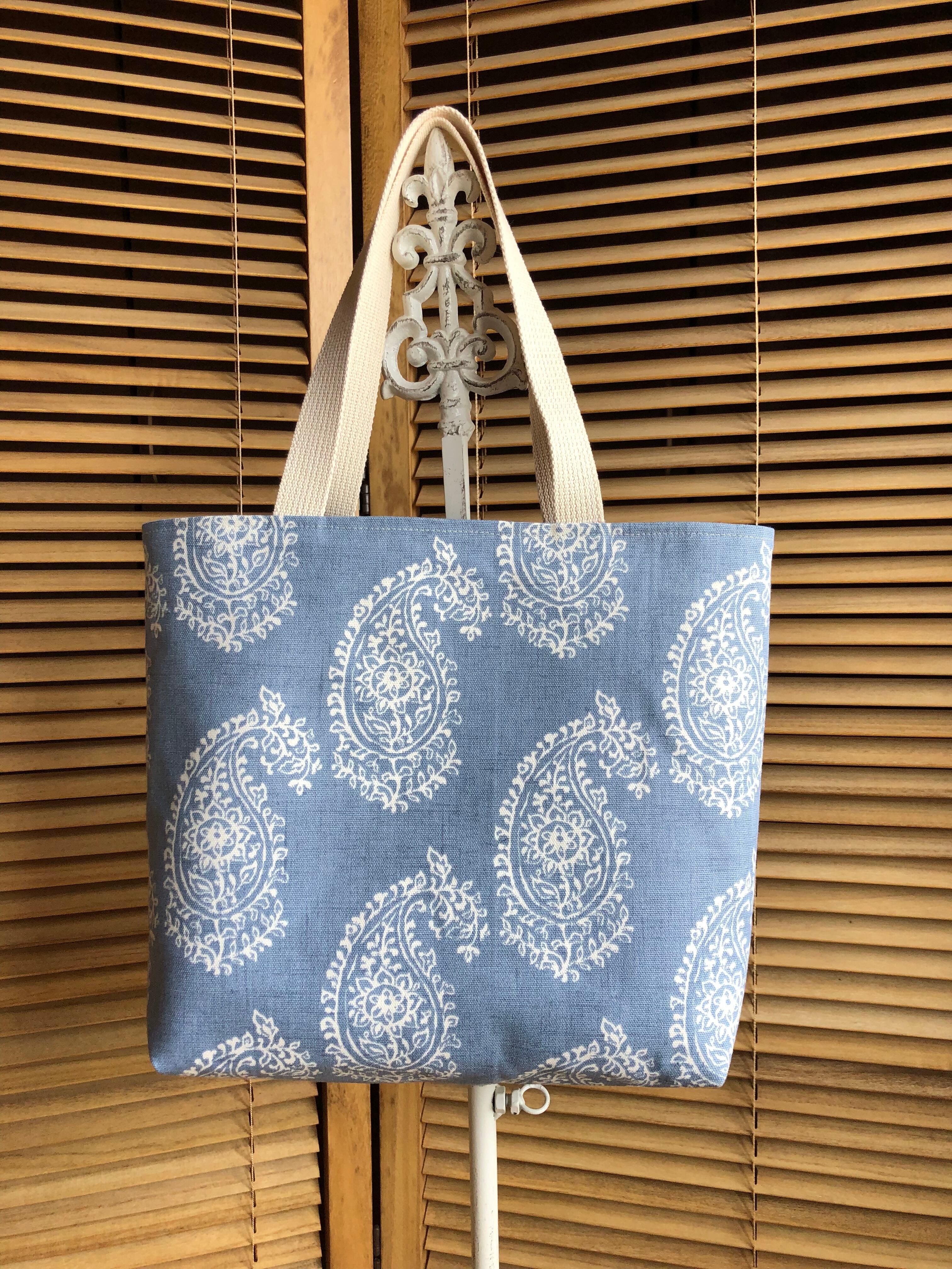 ブルー地に白のペイズリー柄で、爽やかにお使い頂けるとおもいます。