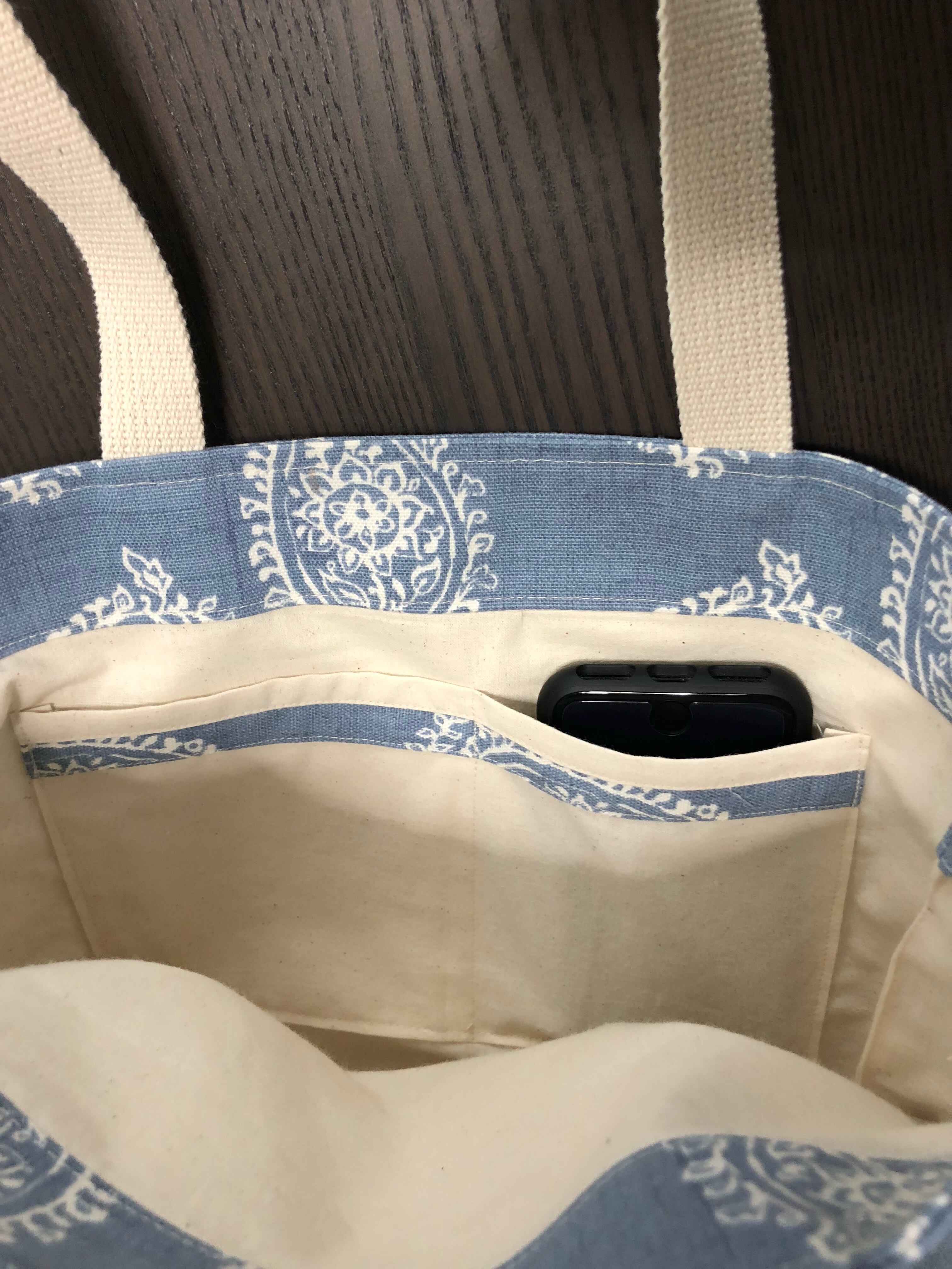 ポケット口には共布でテープを作り縫い付けました。統一感があるだけでなくポケットへの出し入れの際分かりやすく便利です。