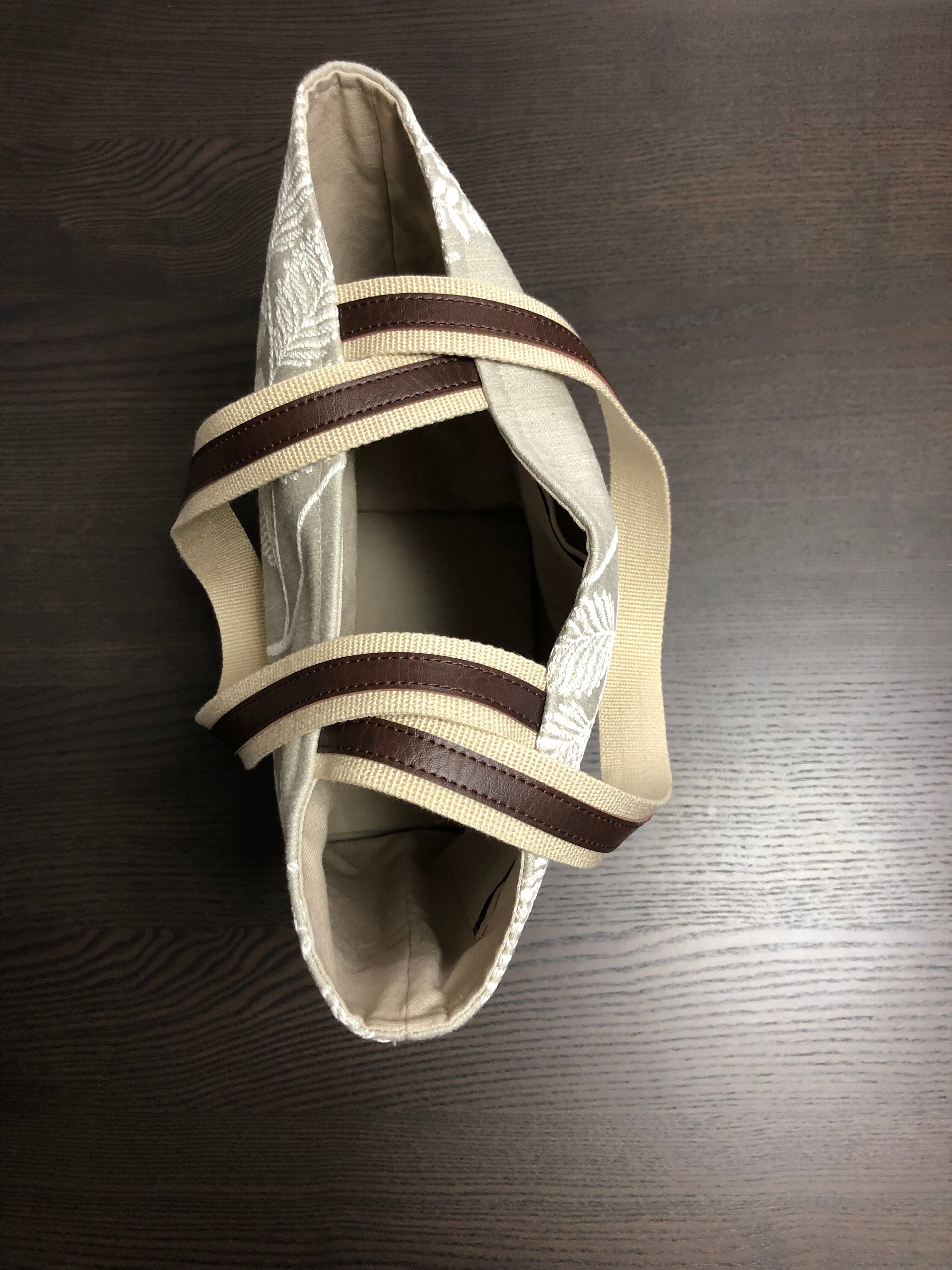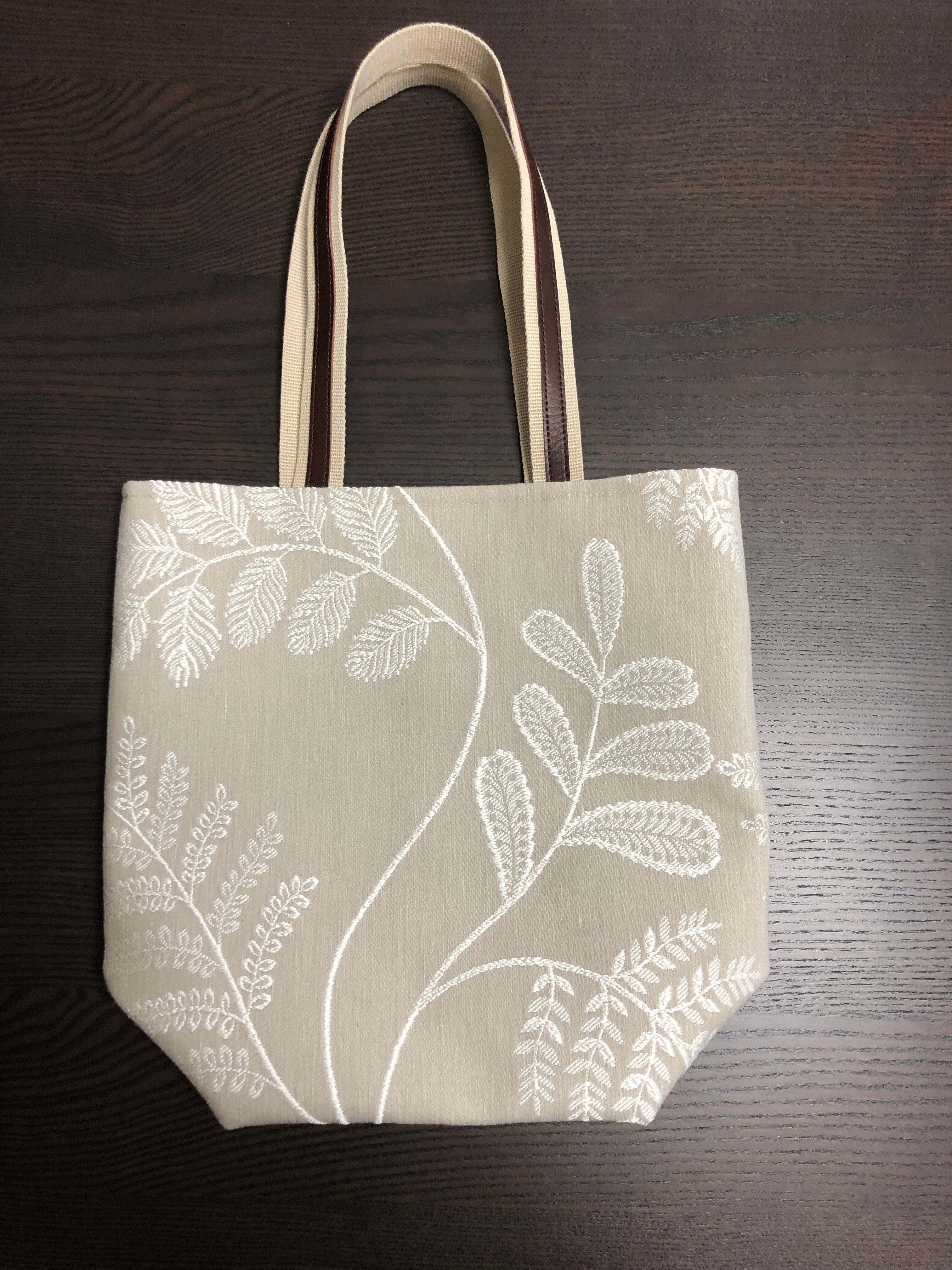表地には型崩れを防ぐためソフト芯を貼りました。裏地にも綿麻のしっかりした生地を使いました。持ち手も茶色のレザーのラインもワンポイント、ポケットの茶色のリボンテープと揃え全体的にお洒落にお使い頂けると思います。自立もします。
