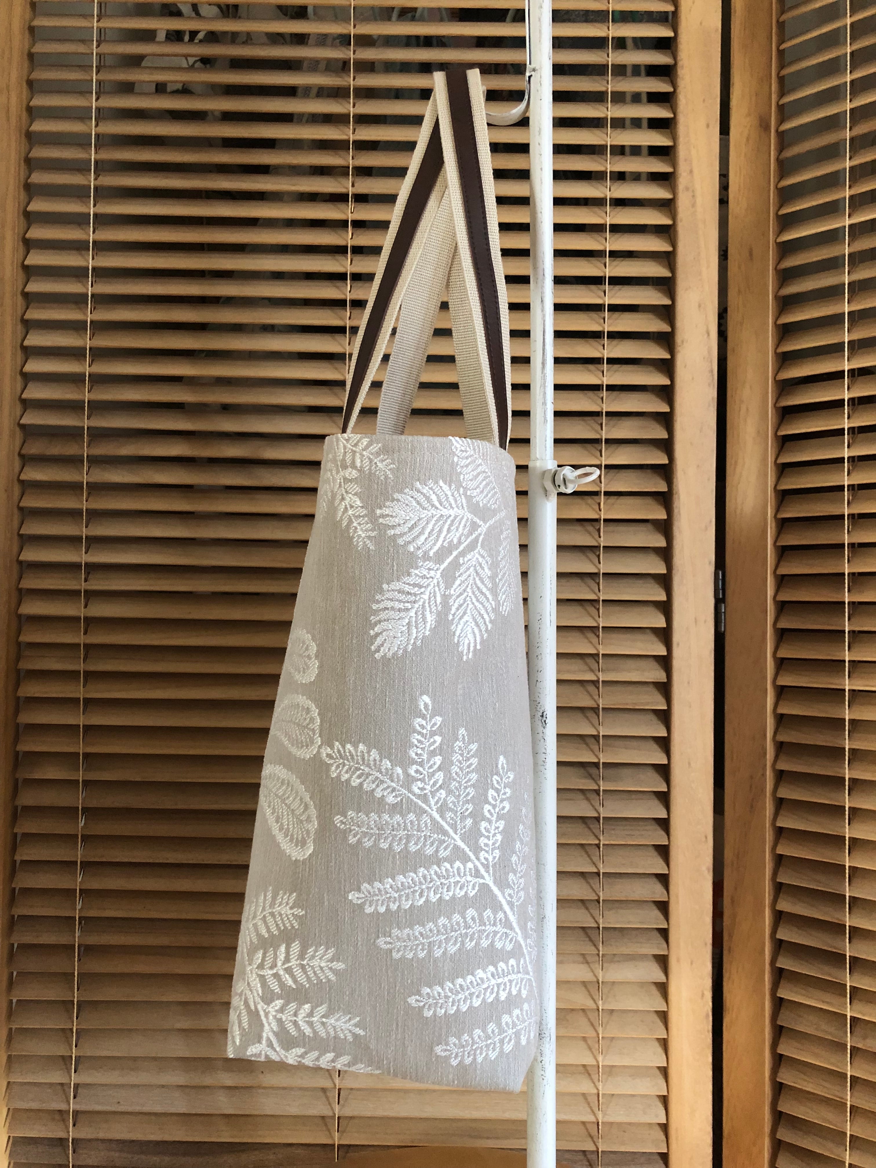 濃いベージュ地に白いシダの葉の様な刺繍でとても落ち着いた色合いと柄です。