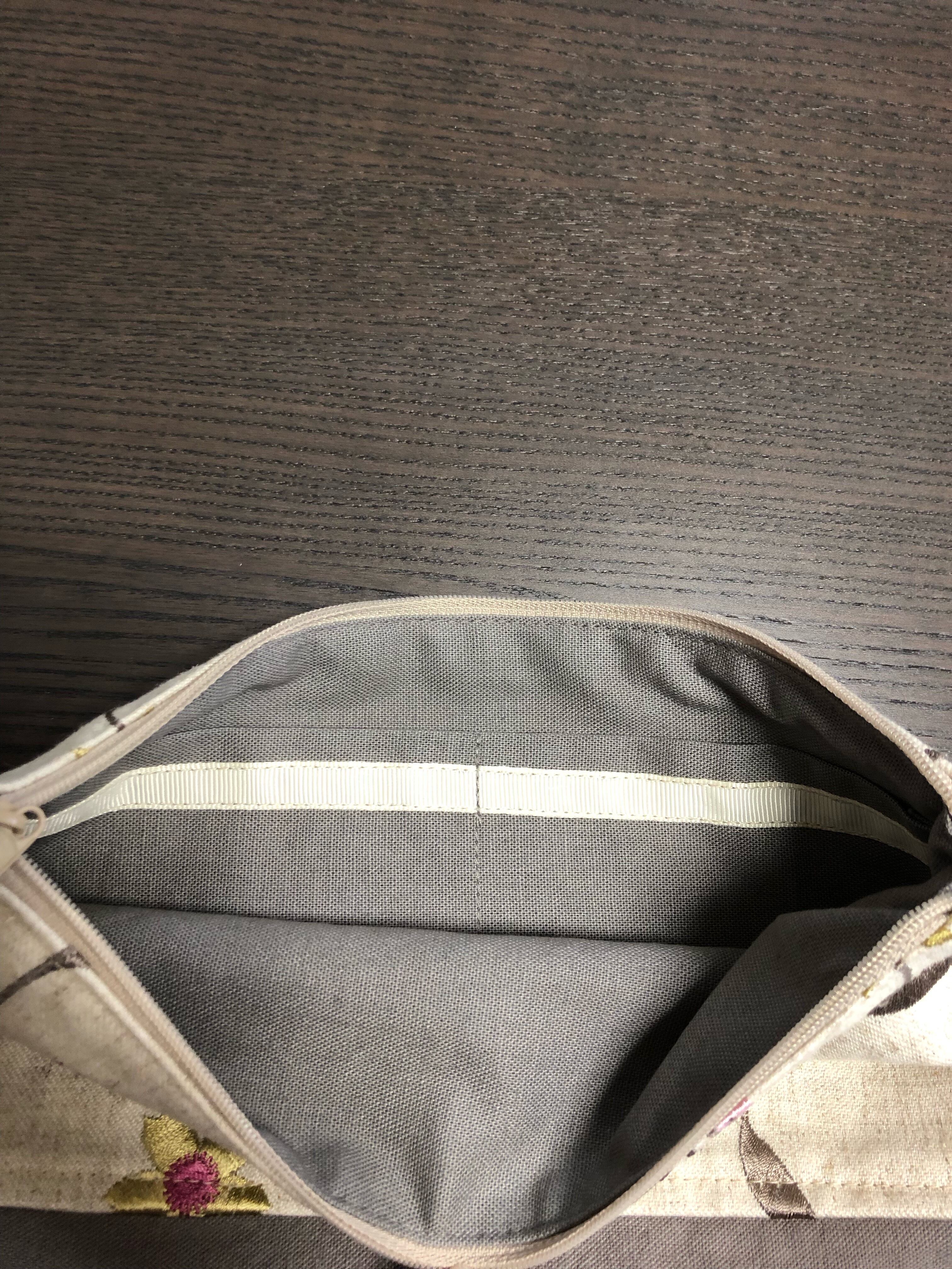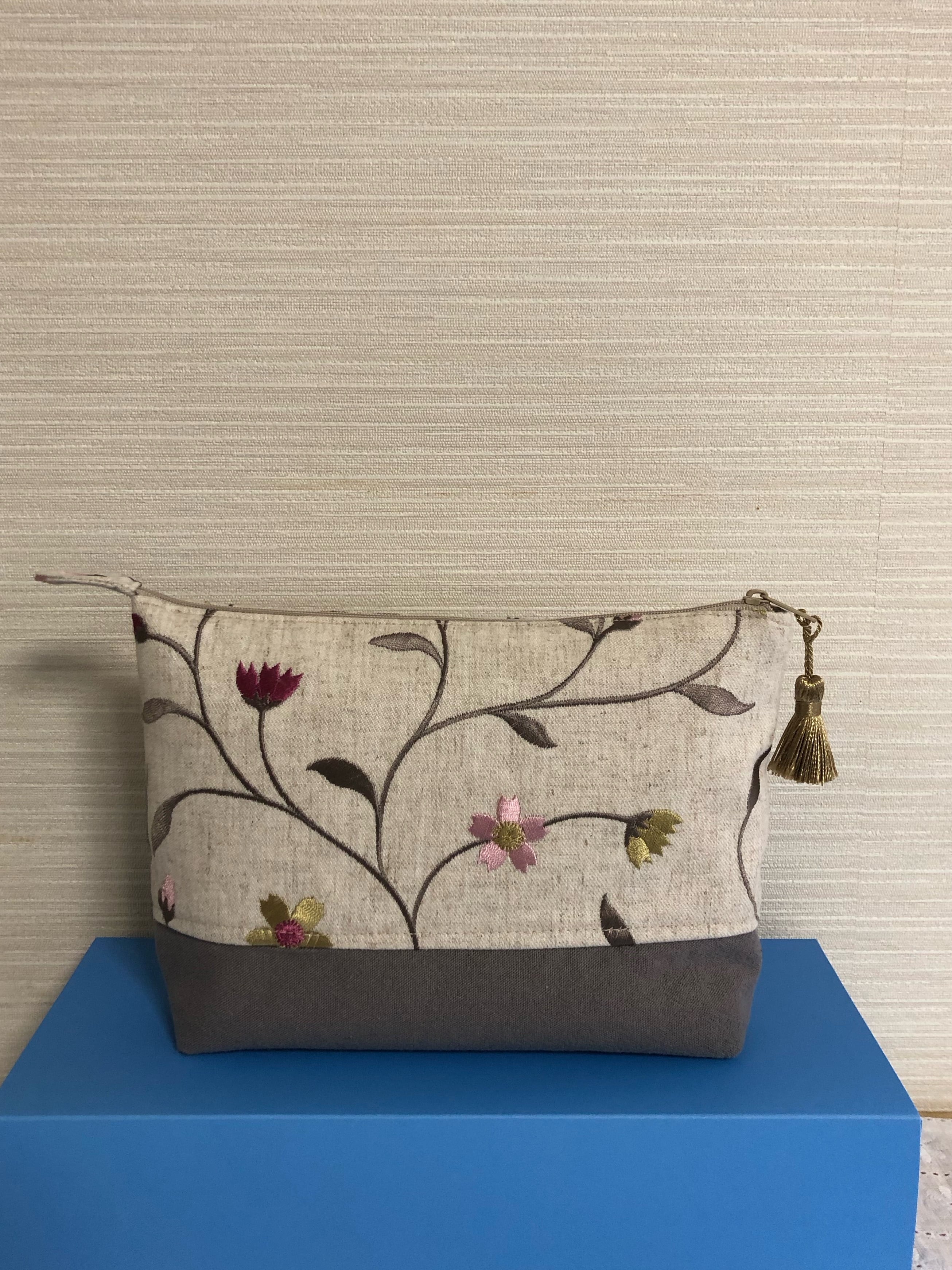 可愛らしい花の刺繍ですが地色、刺繍共に落ち着いた色目なので可愛過ぎず素敵にお使い頂けると思います。お揃いのポーチも使いやすい大きさでバックインバックとしてもとてもお洒落にお使い頂けるのではないでしょうか。