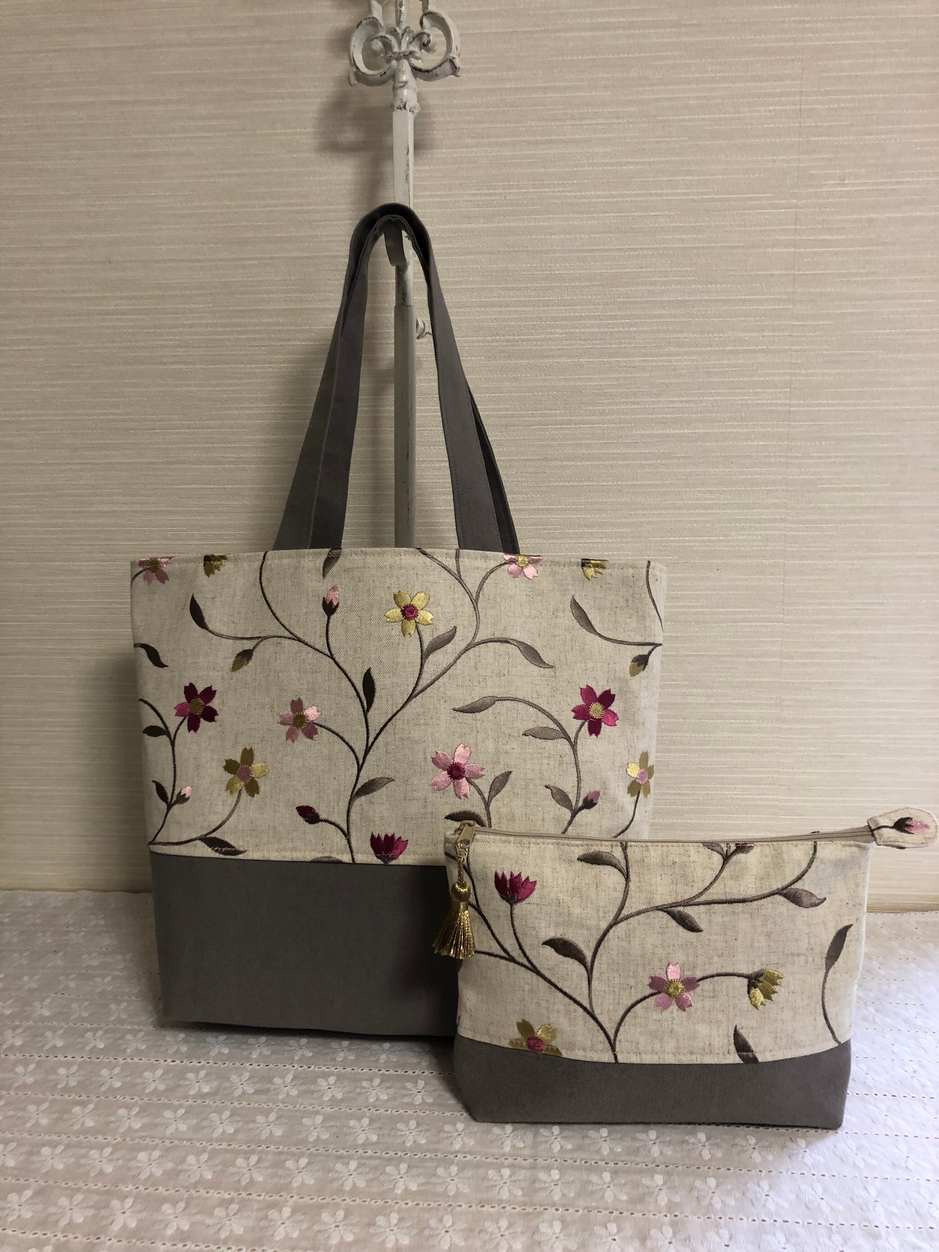 花刺繍の大きめツートン.トートバッグとポーチセット
