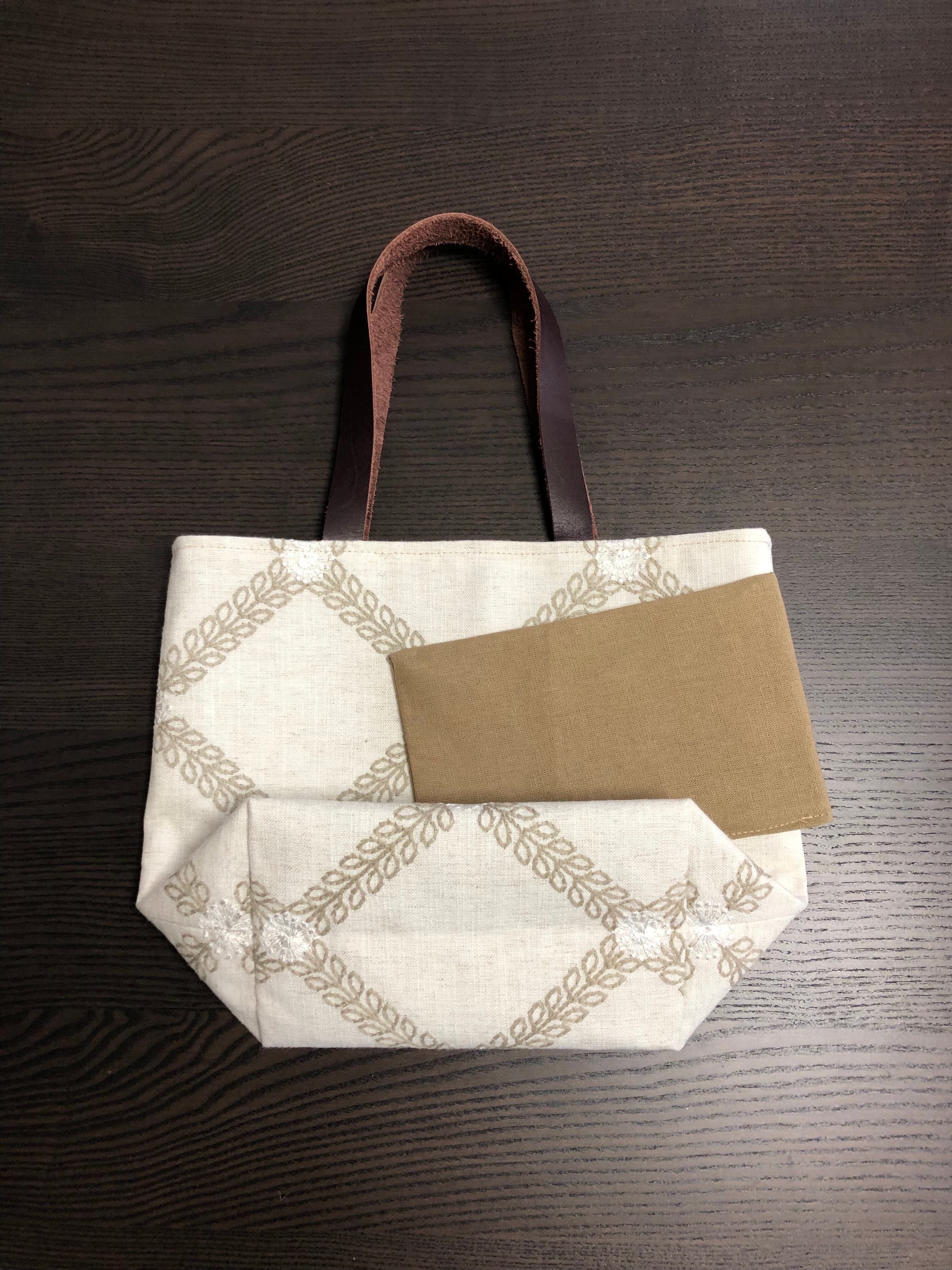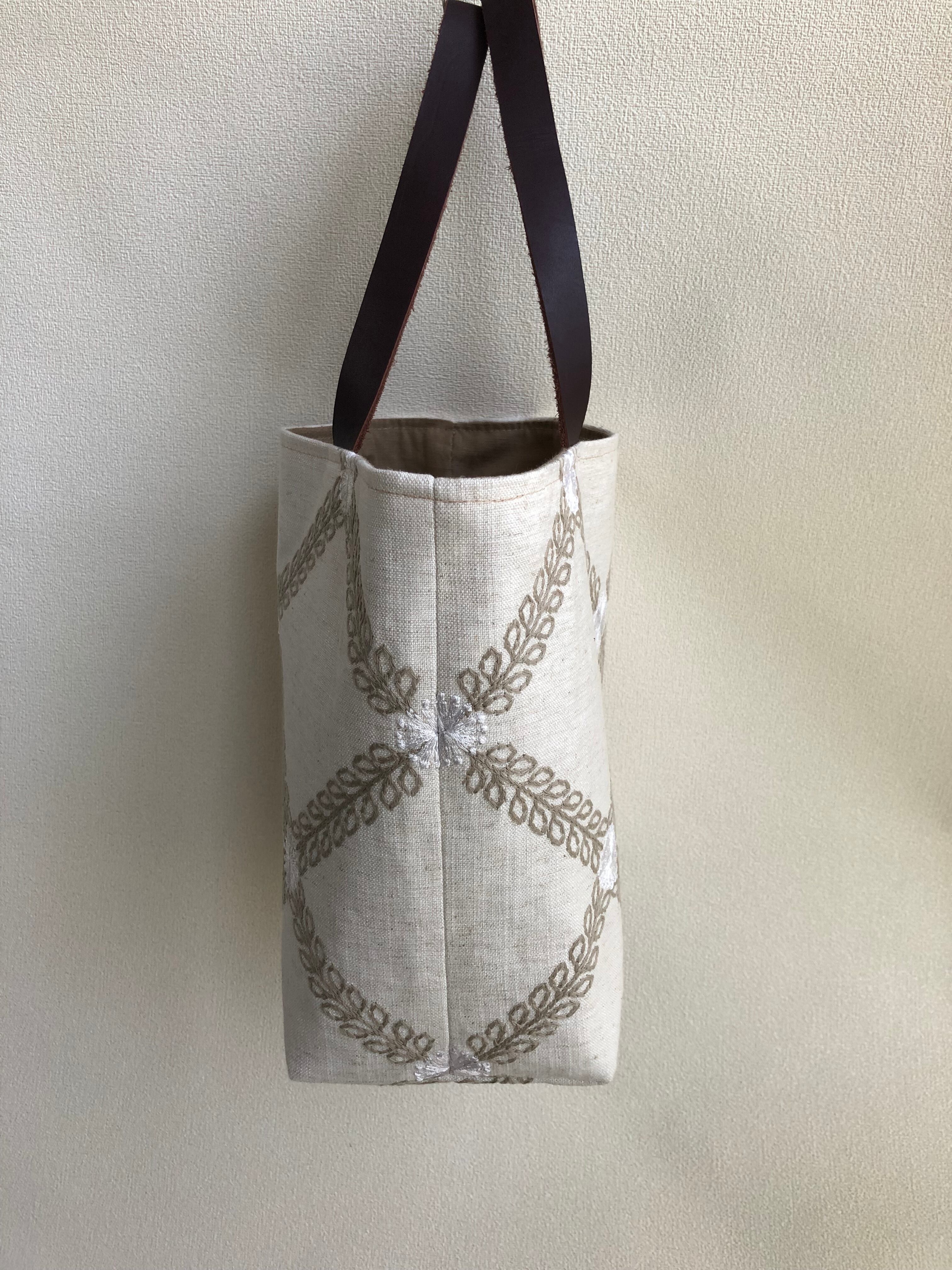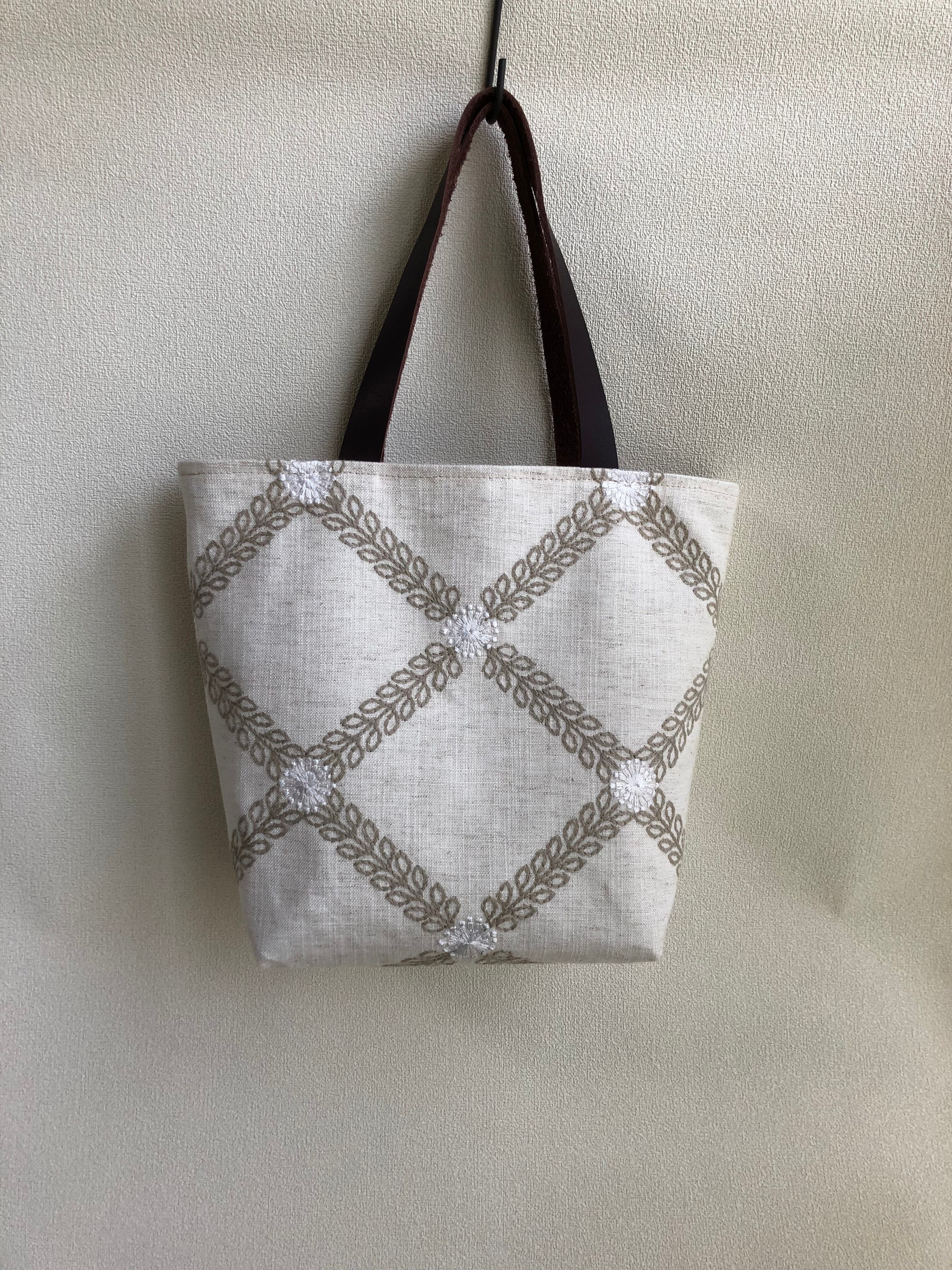 ダイヤ柄刺繍の革持ち手のトートバッグ