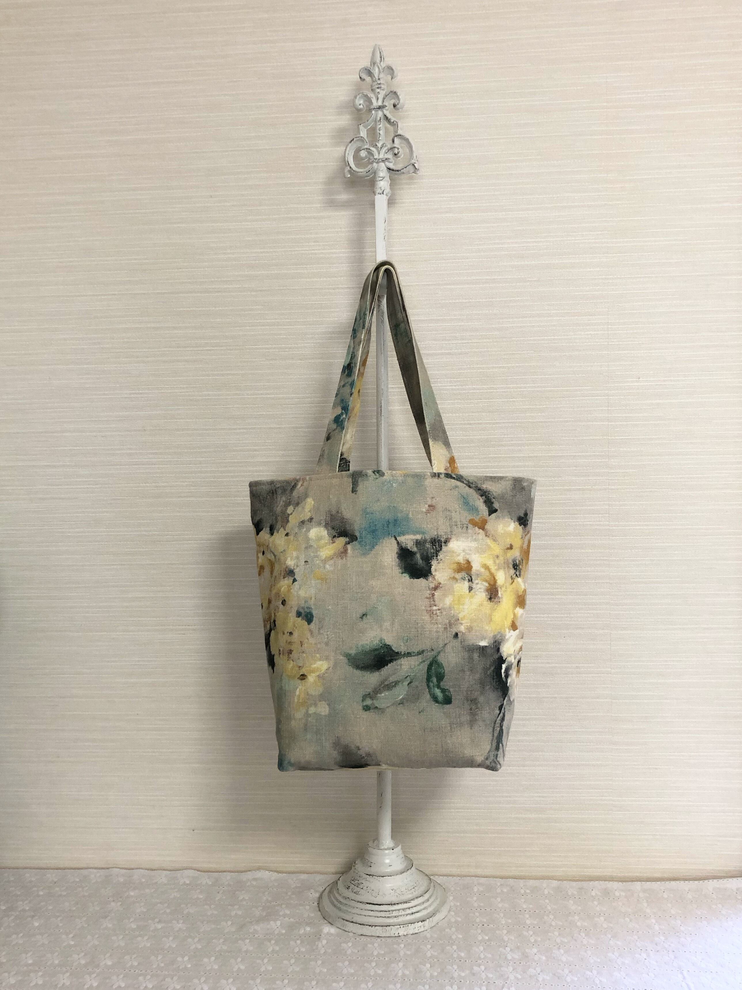 薄墨色のグレー地にくすんだ黄色、コバルトブルーの花柄で派手過ぎない良いバランスのイギリスのプリント生地です。