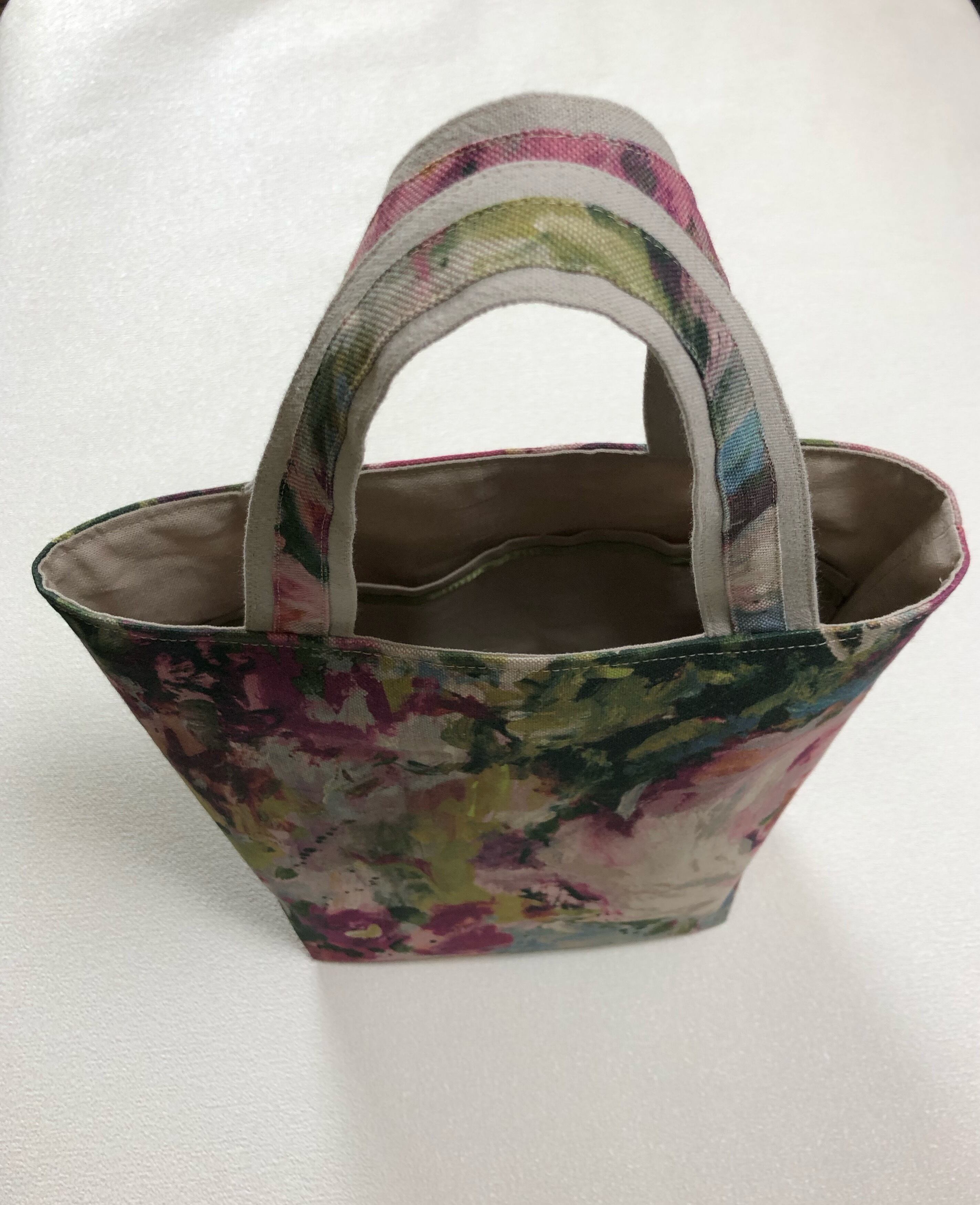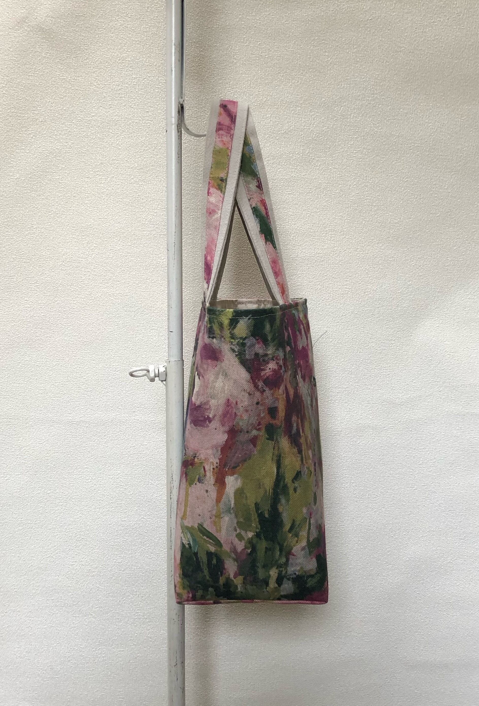 イギリス生地の上品な風合いと、鮮やかなローズの花プリント。抑えめのグリーン、ピンクなどで派手にならず大人かわいい色合いで、目を惹くトートバッグです。