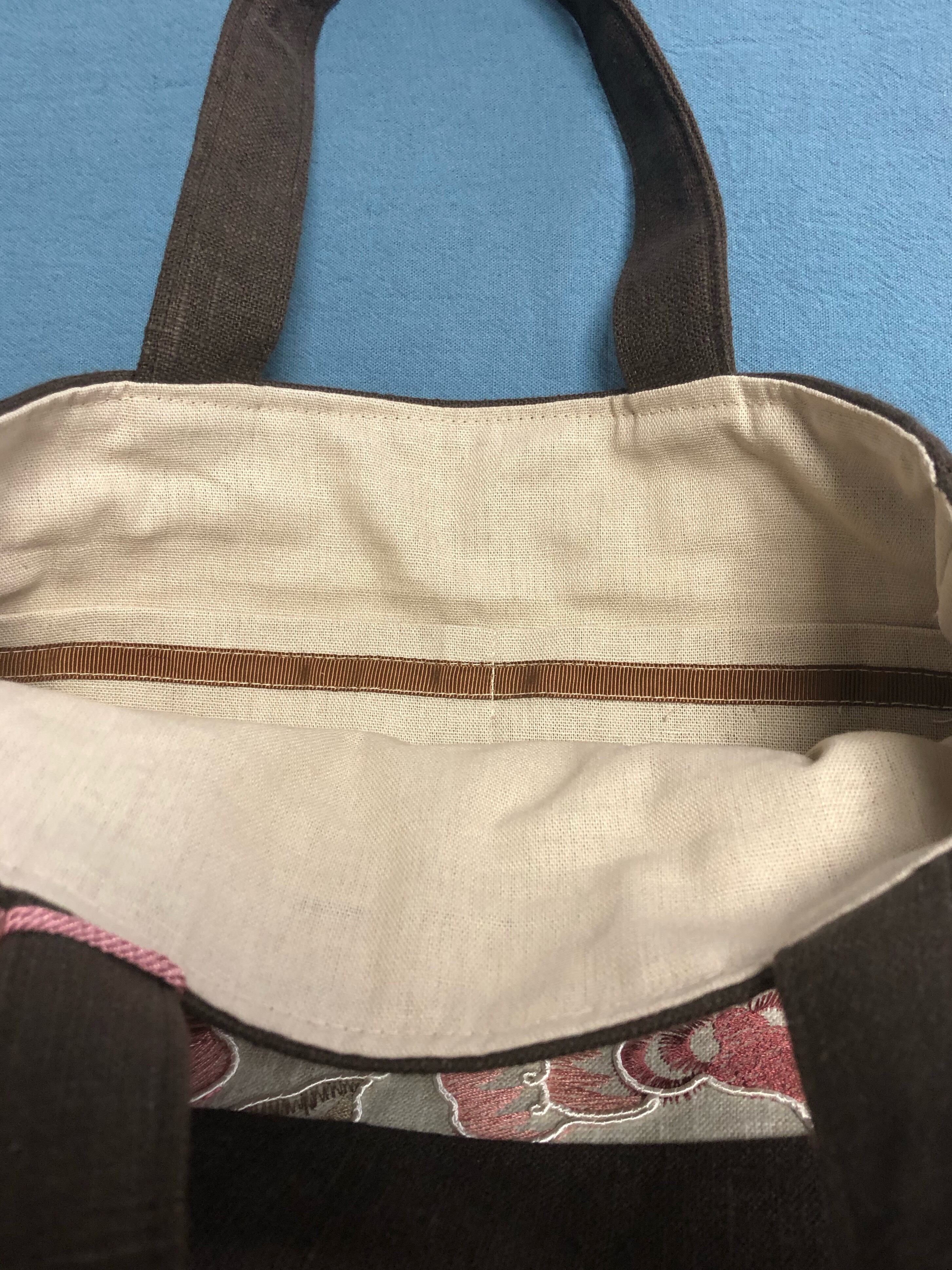 また、上部と下部で刺繍生地を挟む様に麻生地で切り替え、持ち手も同じ生地で作った統一感のあるデザインが魅力です。