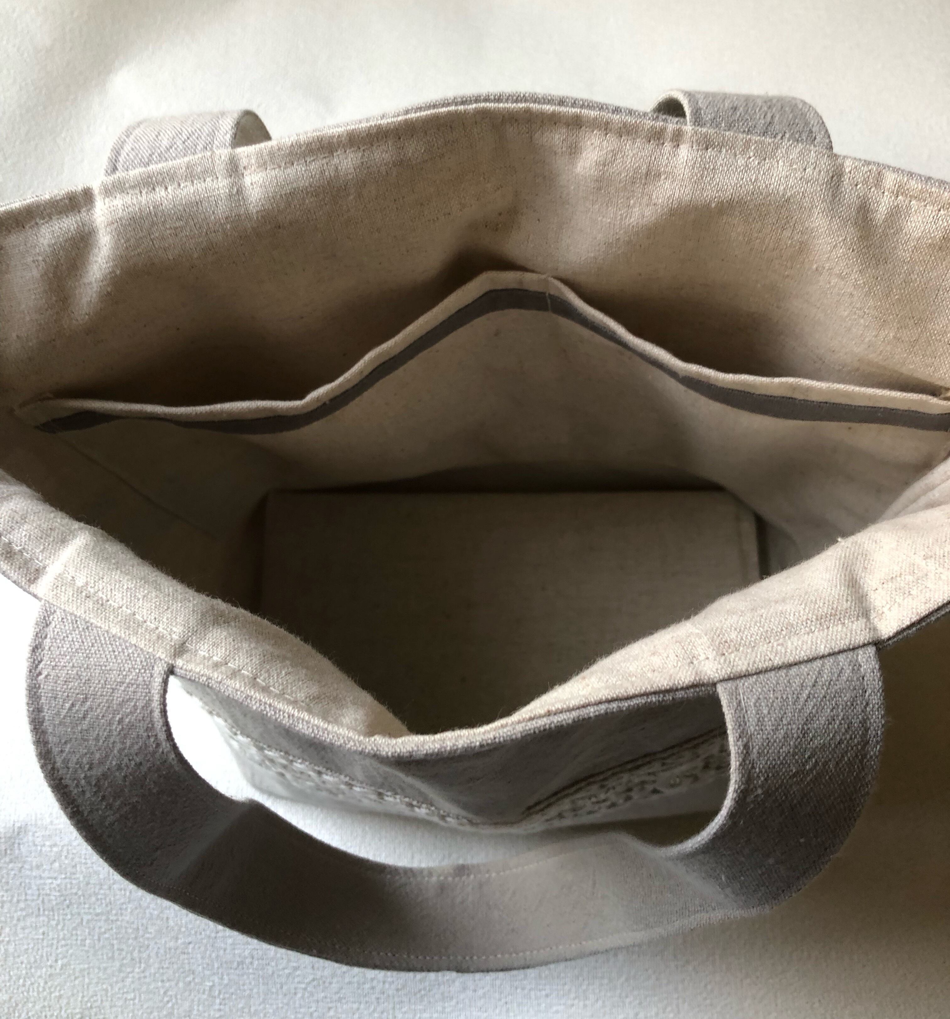 バックの生地は優しいグレージュ色の厚手の綿麻素材。刺繍から地色が透けて統一感もありオシャレなバックです。