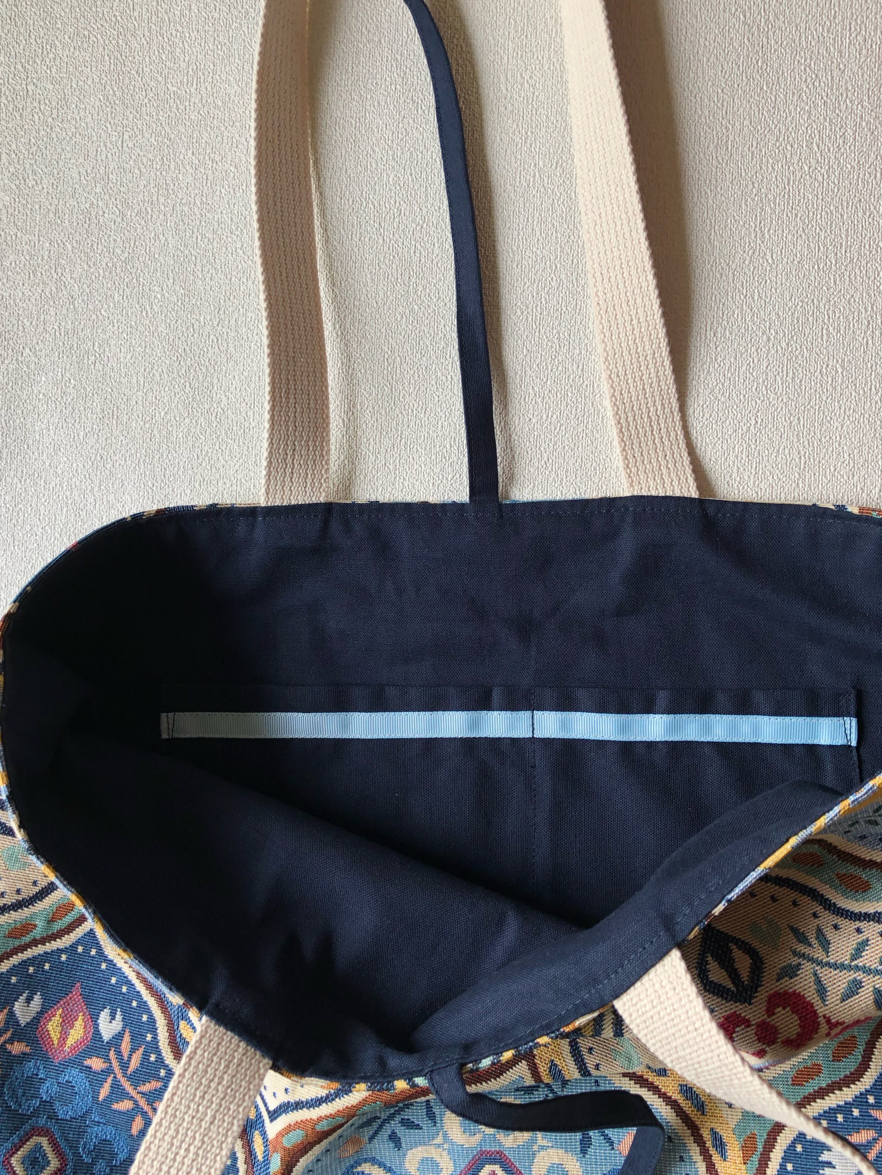 バック幅もかなりあるので沢山荷物を入れた時に荷物がこぼれない様、中央に共布で作った紐をつけています。マグネットボタンなどは荷物が多くなると止められず、止めると荷物が限られてしまうので紐にしました。紐は使わない時には中に垂らした状態でご使用下さい。