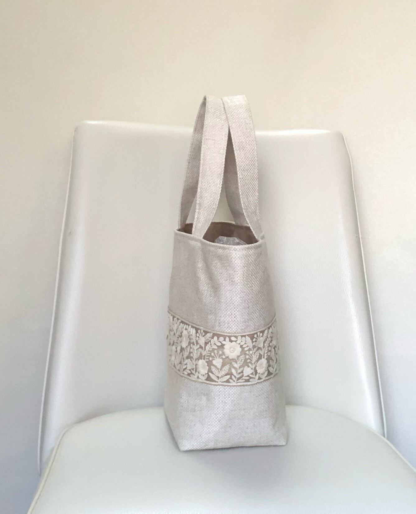 茶系のオーガンジーに白の花々の刺繍が施されたインド刺繍を施したトートバッグです。