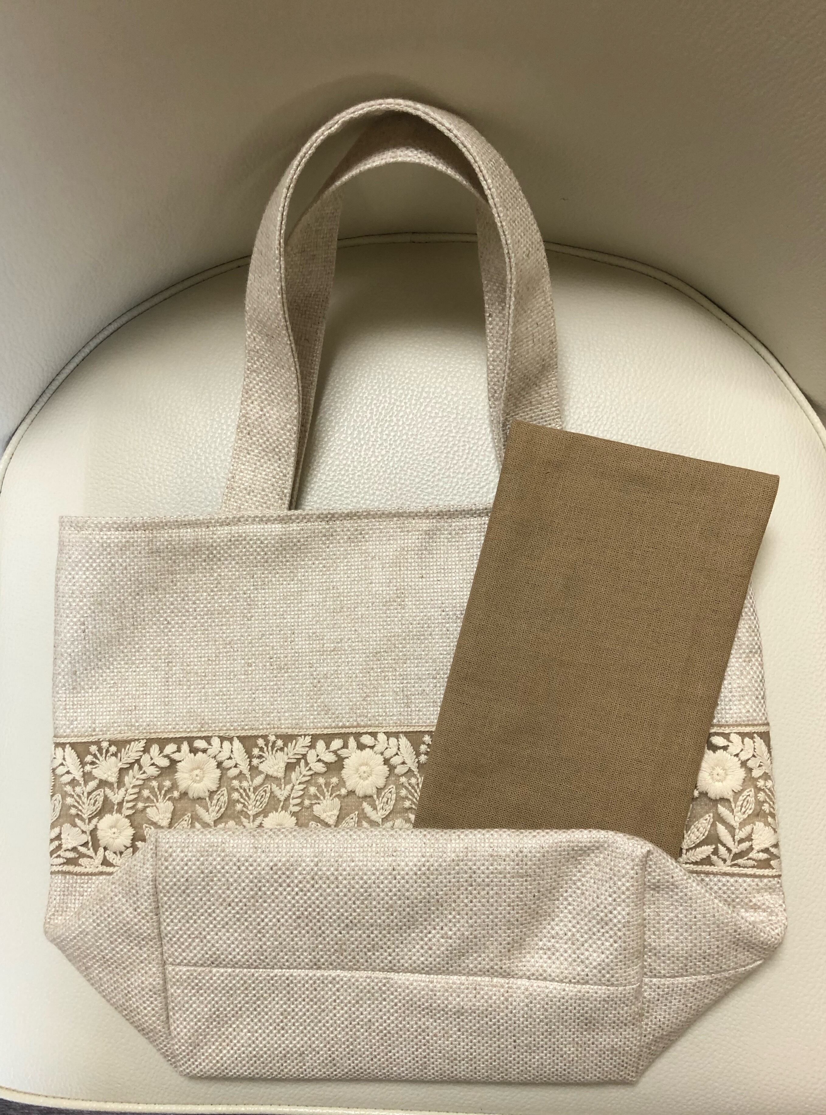 茶オーガンジー白のインド刺繍のトートバッグ