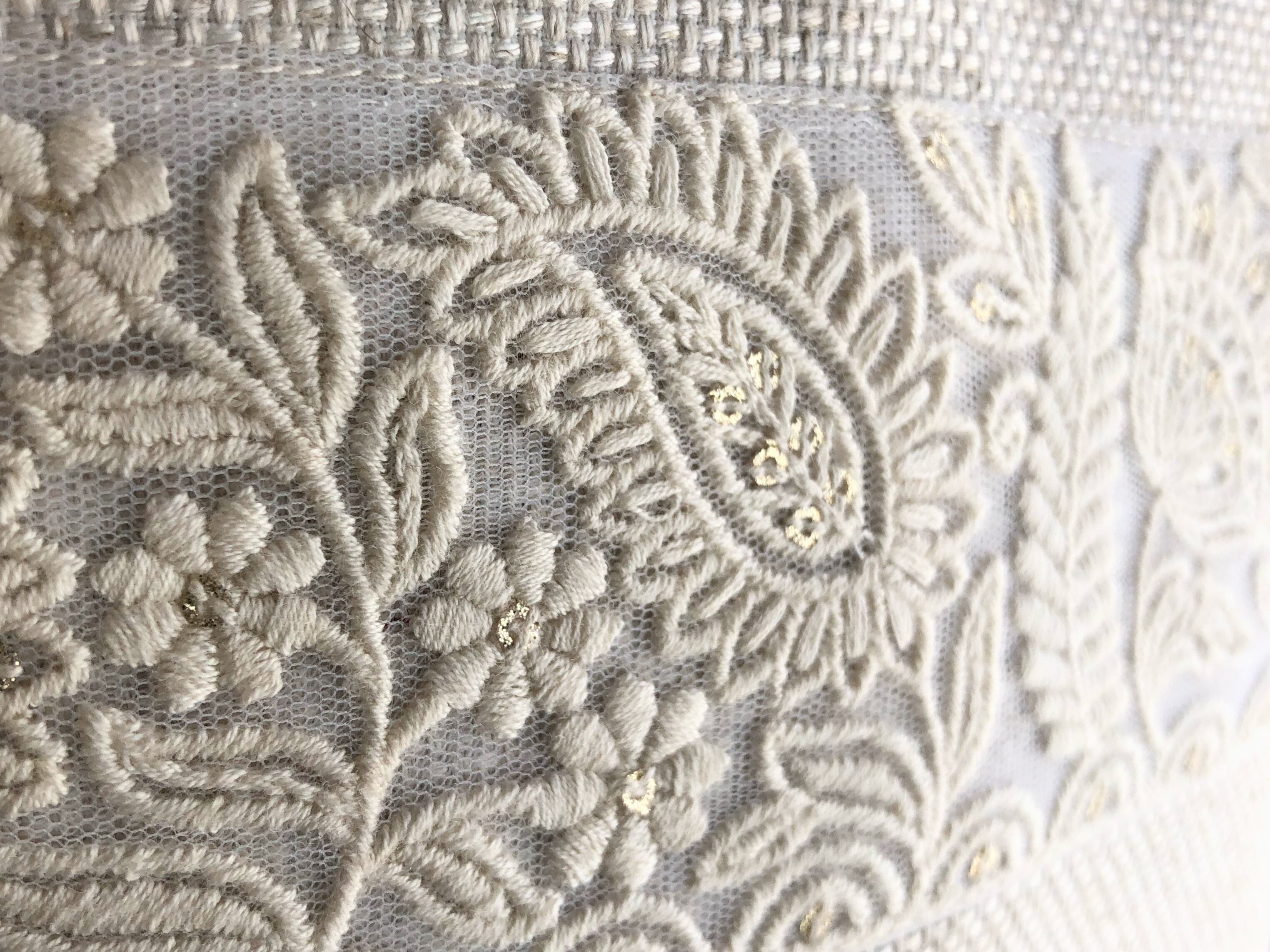 派手なデザインの多いインド刺繍の中から、白のオーガンジーに白刺繍と小さいゴールドのスパンコールがアクセントに付いているデザインを選びました。