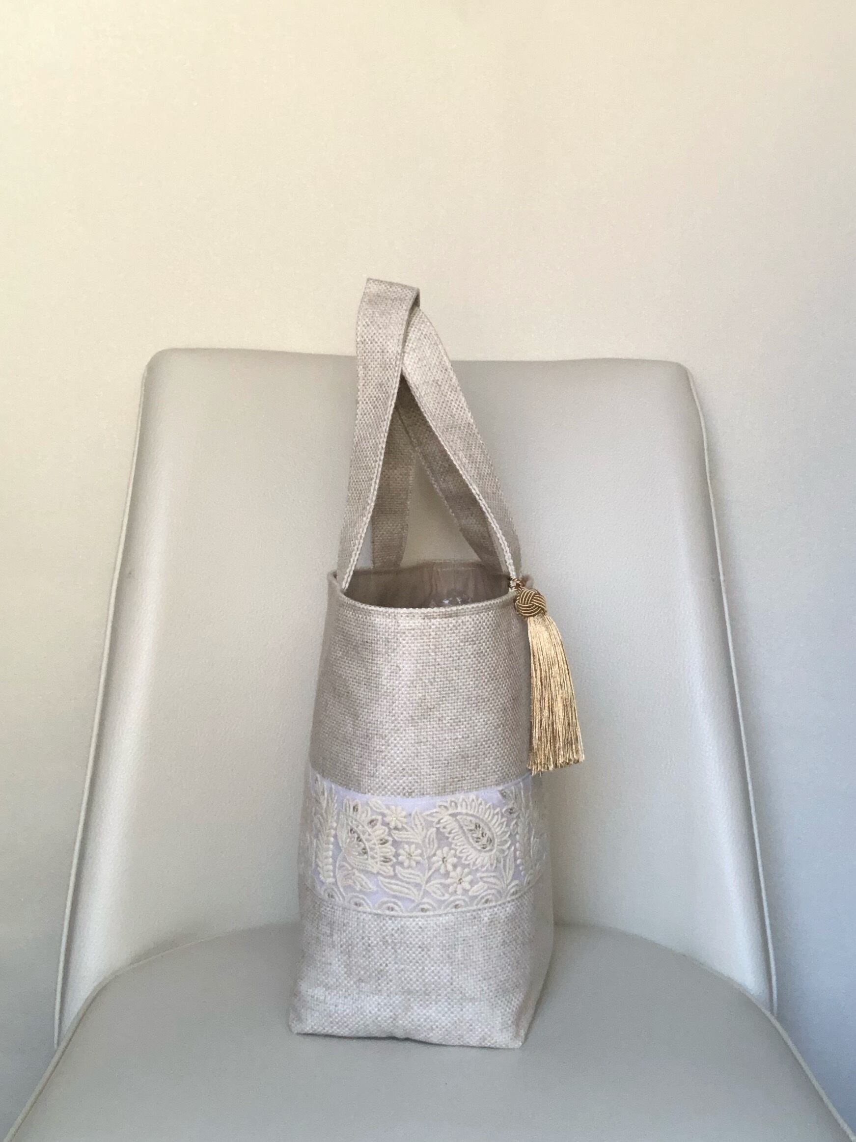 白インド刺繍のトートバッグゴールドタッセル付き