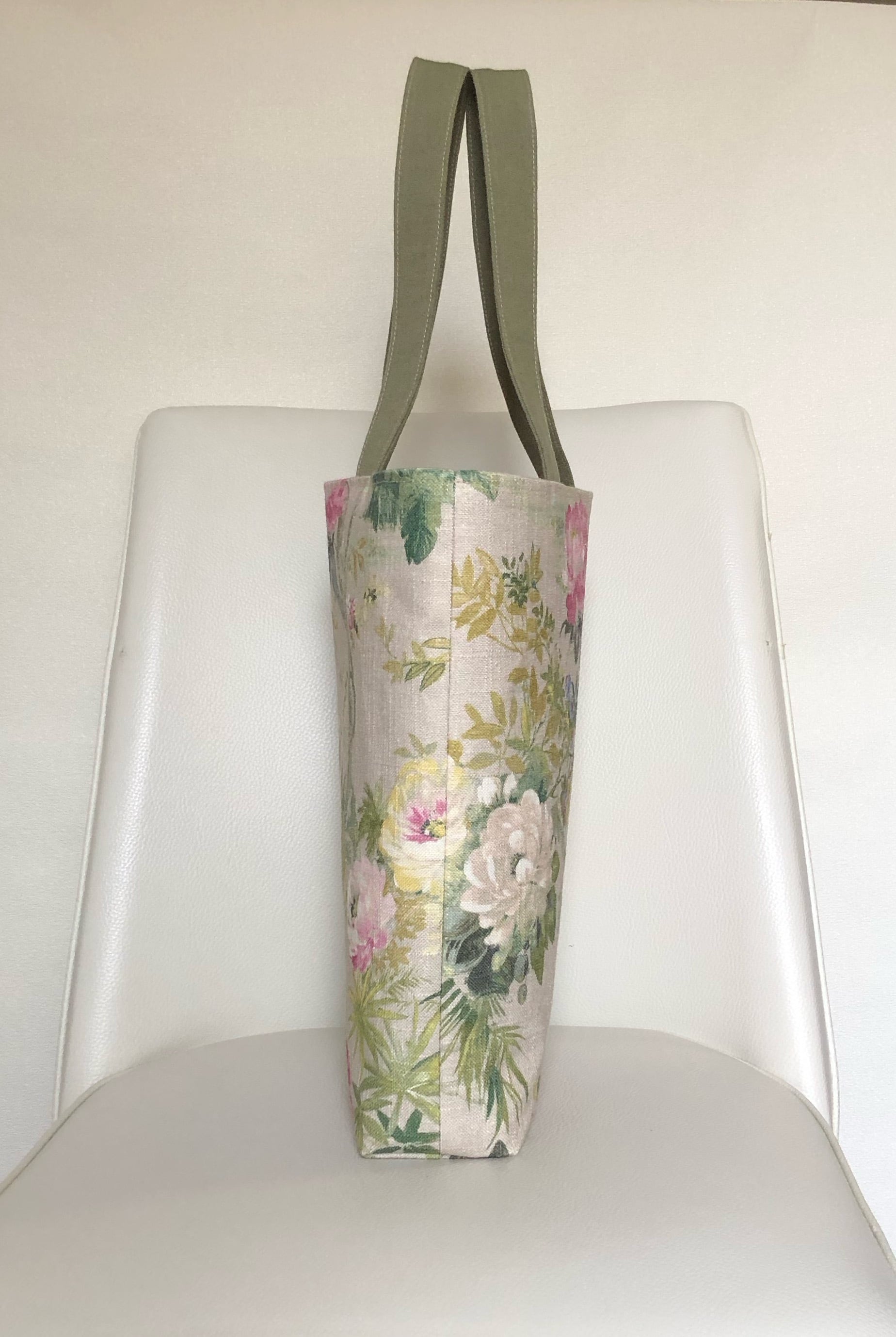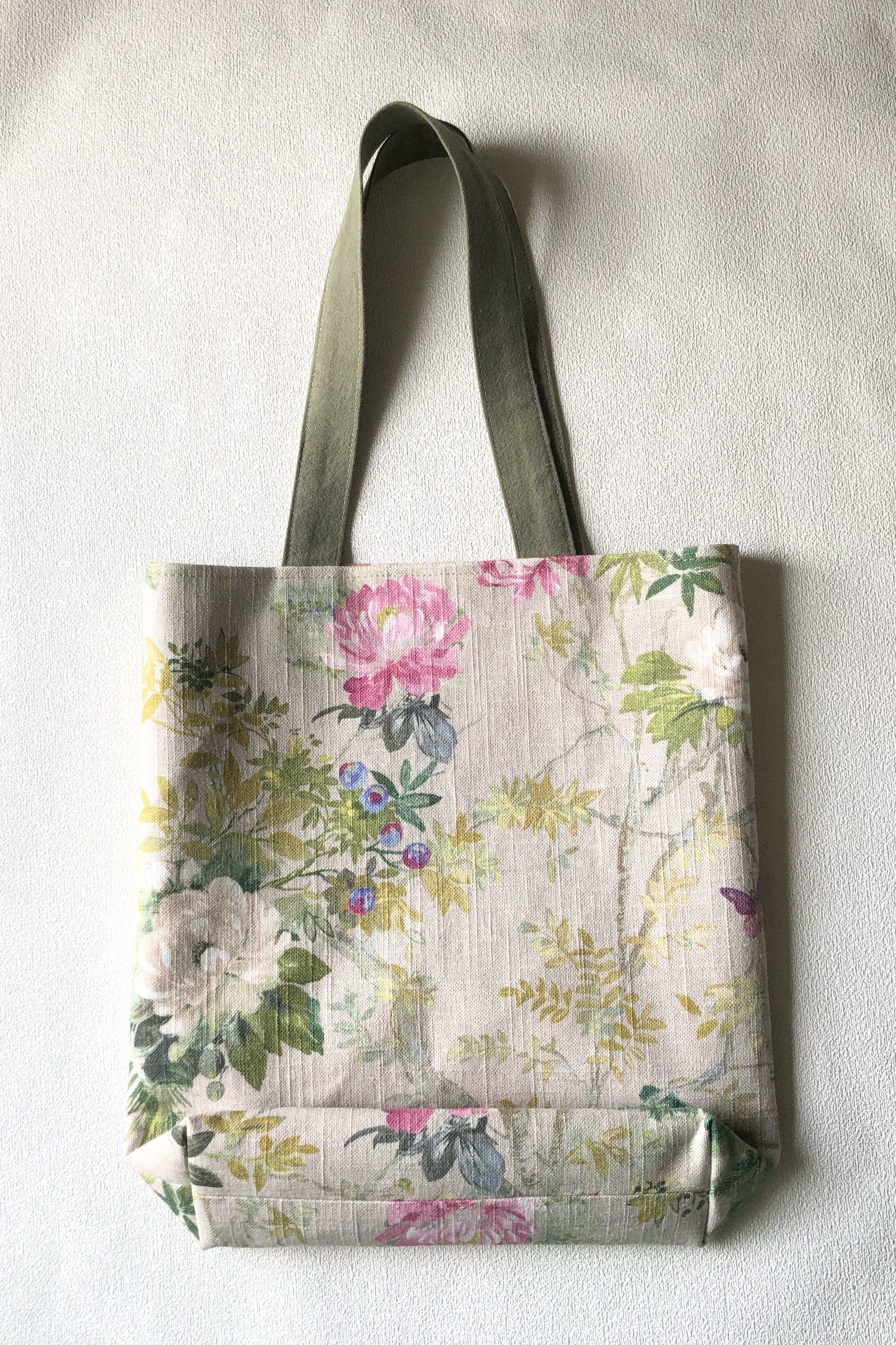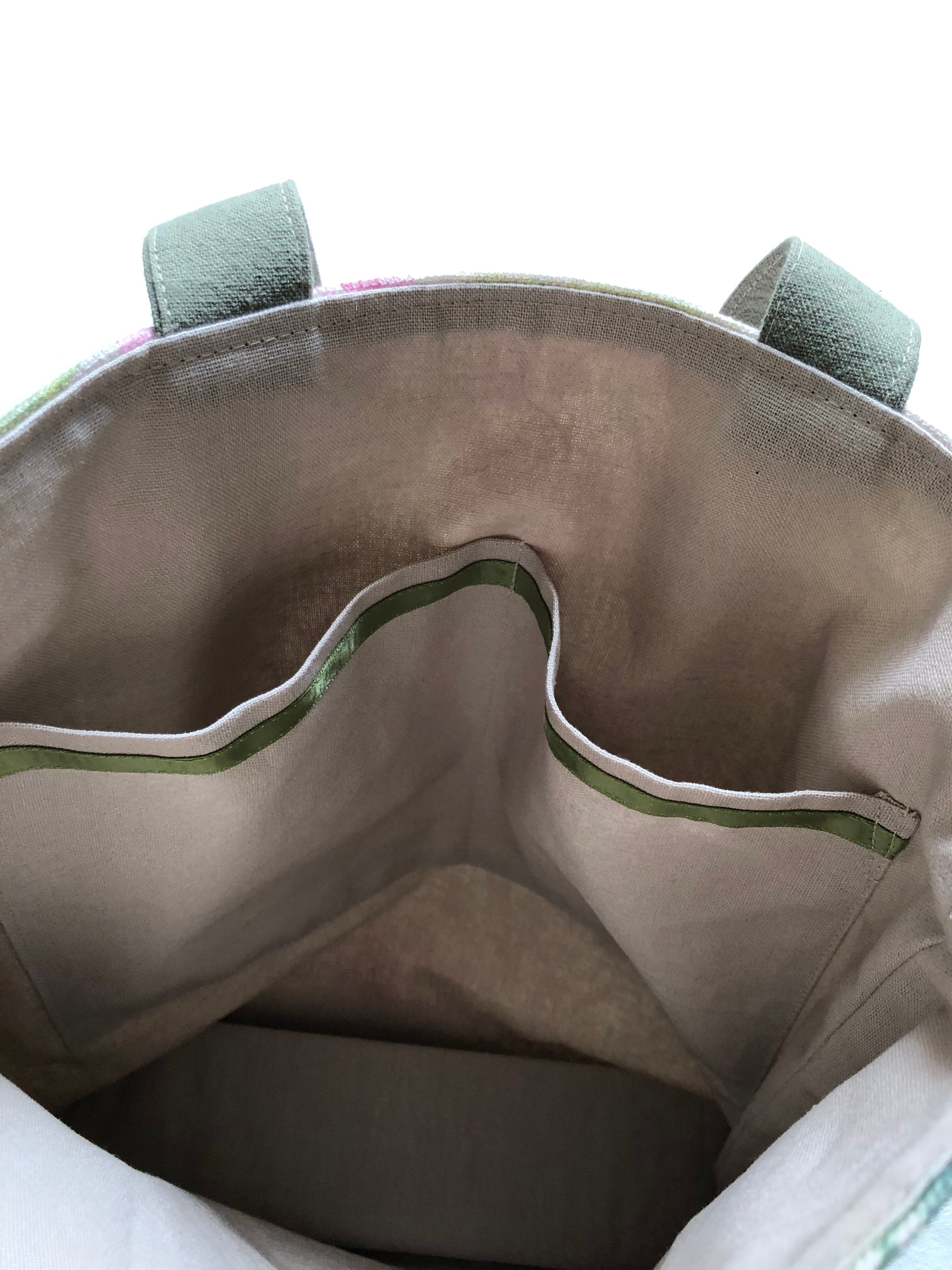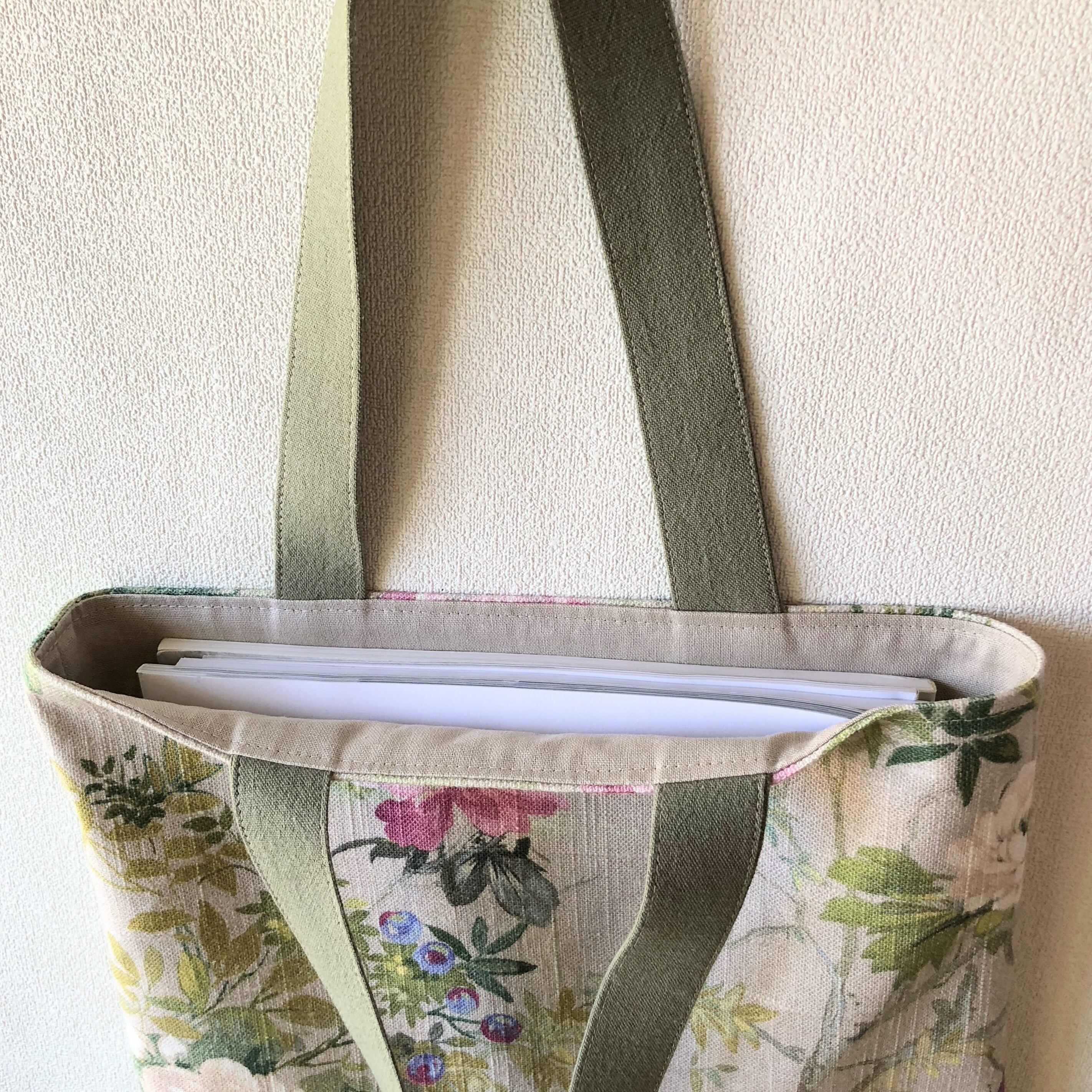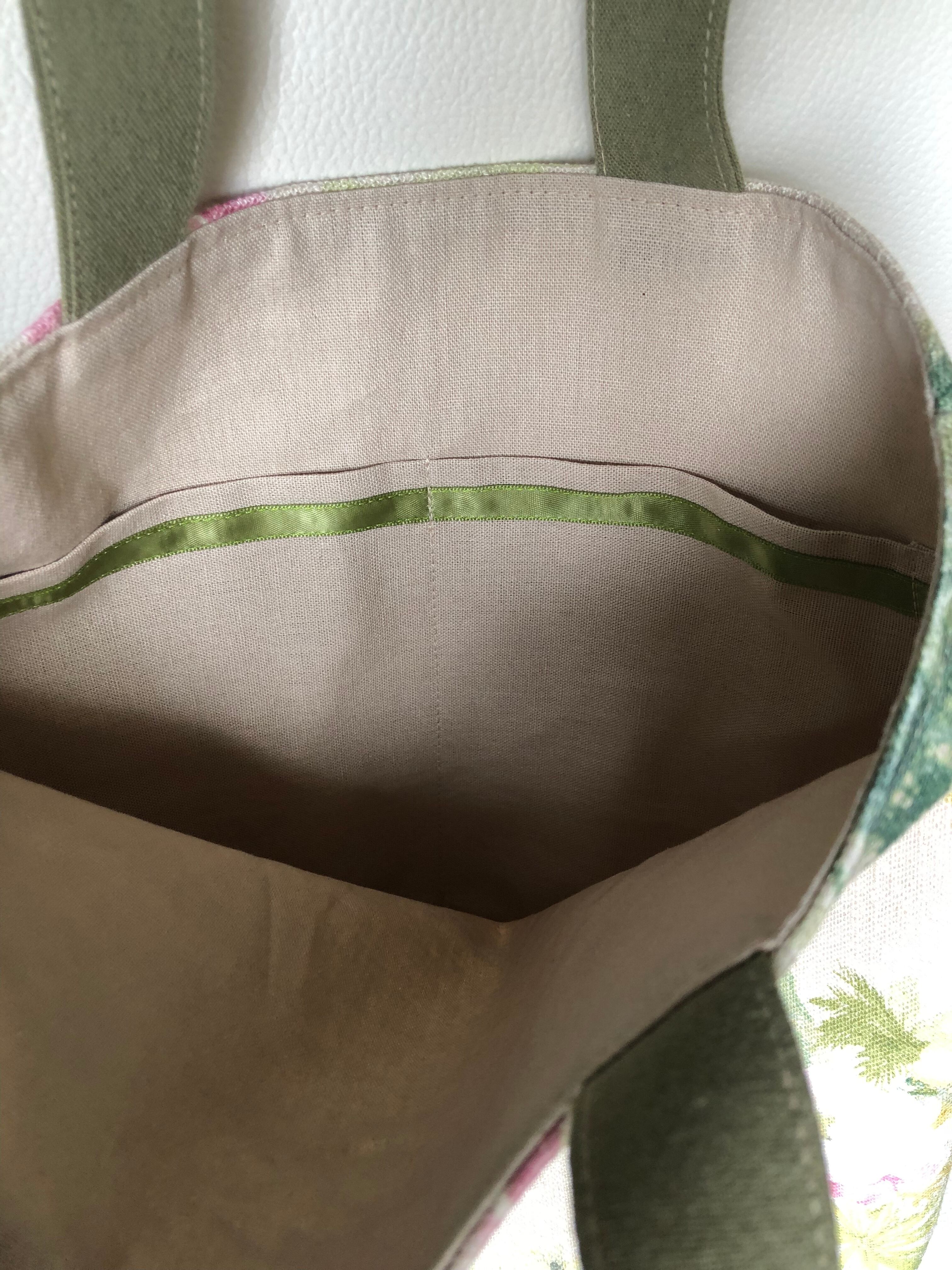 持ち手は肩掛けできる長さで、ハードな芯を貼っているので使い易く、プリント柄に合わせたグリーンの厚手の綿麻生地で作り表生地とのバランスも良く大人可愛いバックになったと思います。