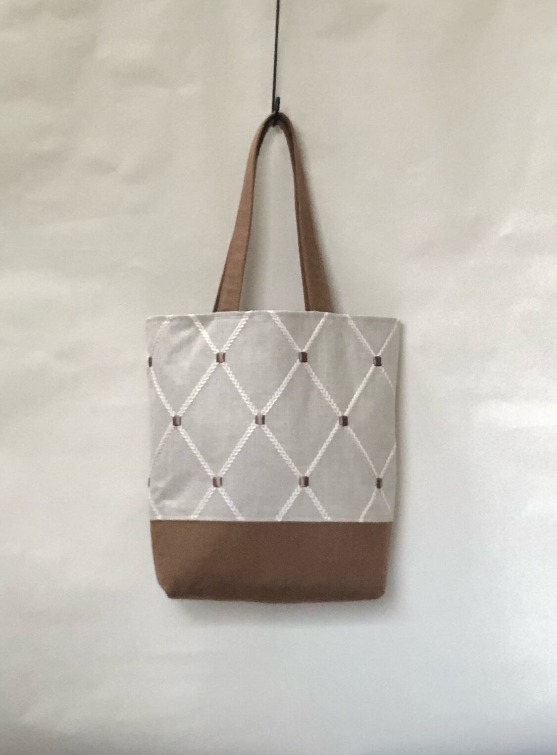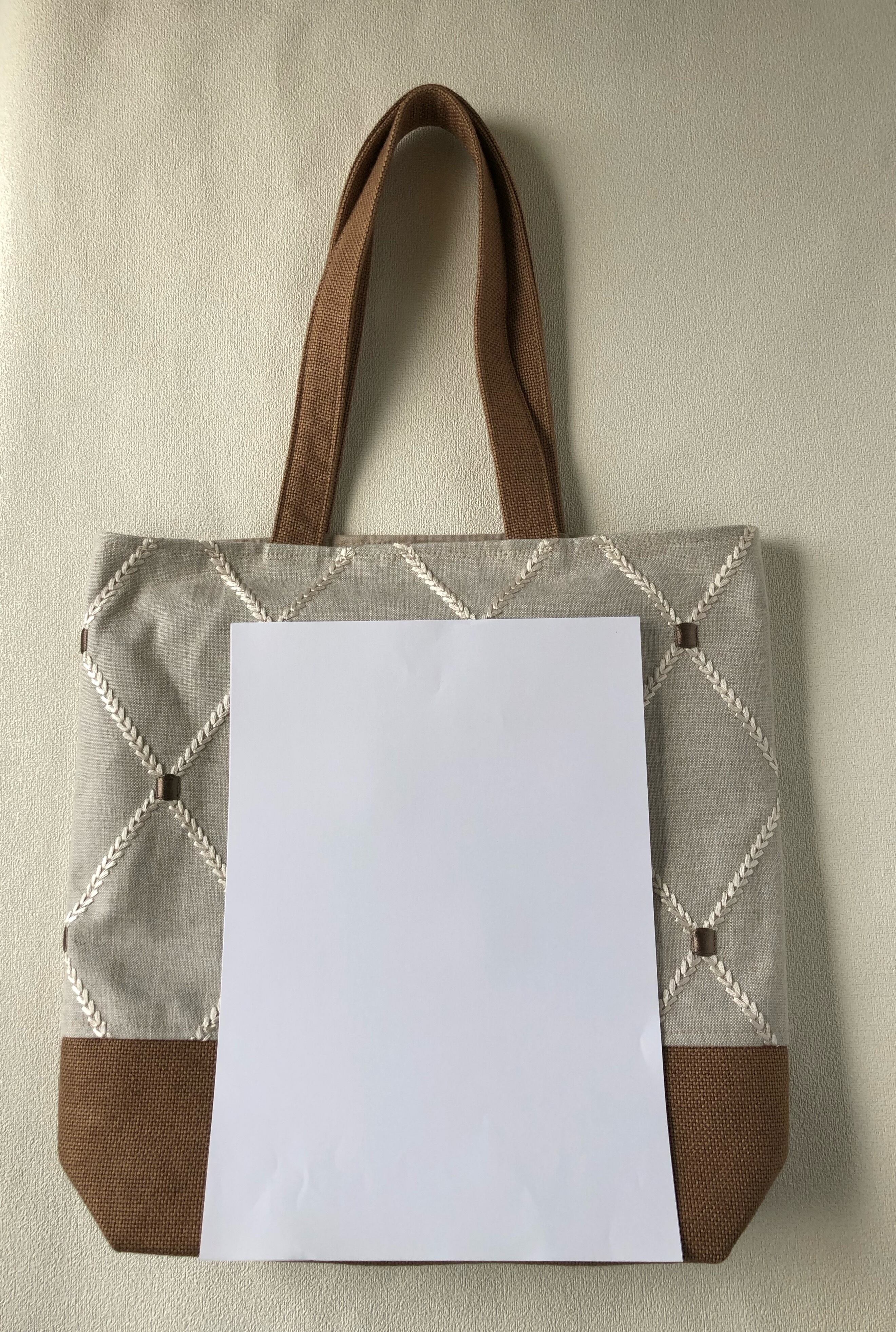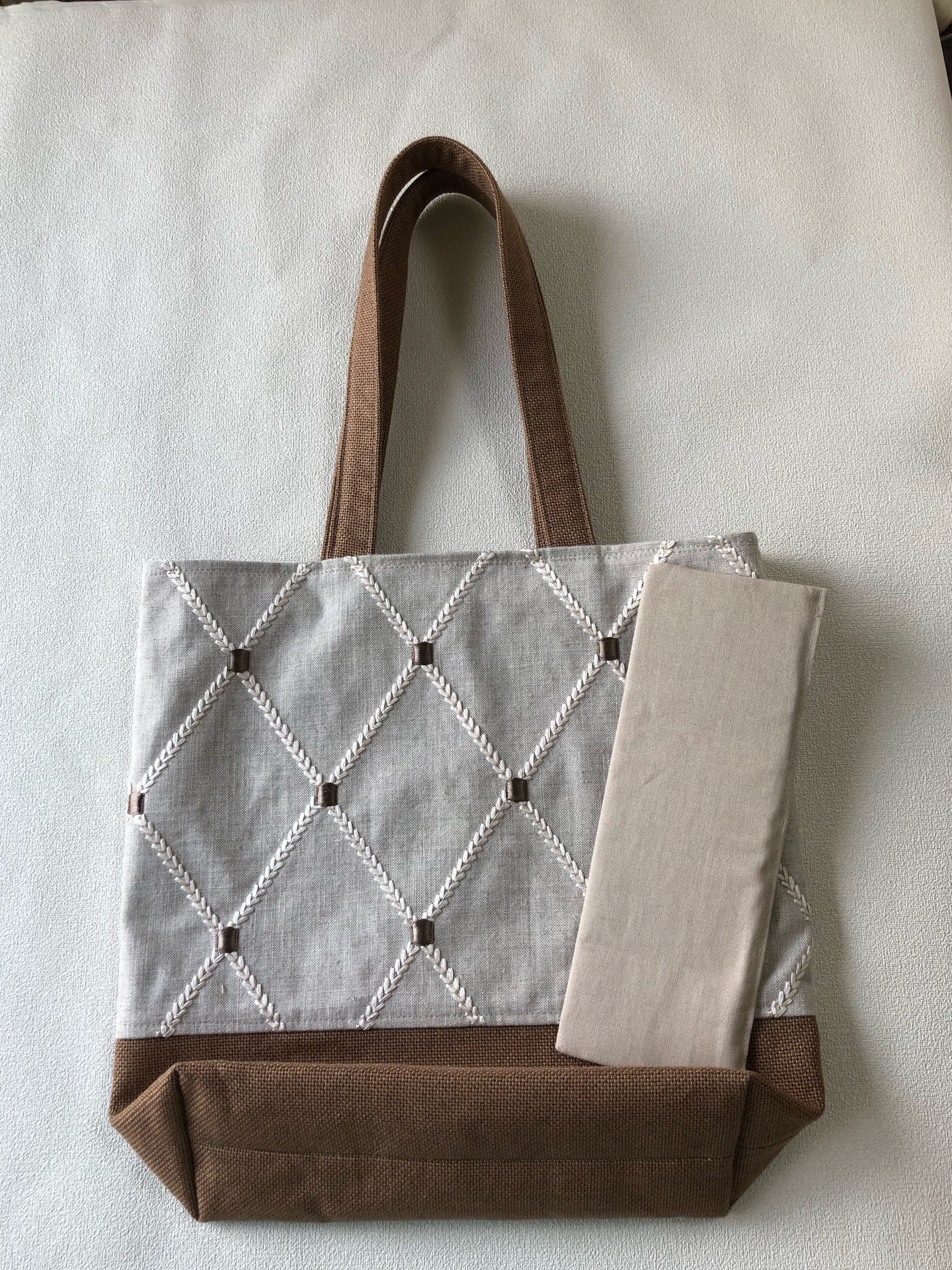 おしゃれな刺繍のデザインが特徴の大きめショルダートートバッグです。イギリスの刺繍生地を使用し、ツートンカラーで仕立てたこのバッグは、上品さとカジュアルさを兼ね備えたアイテムです。