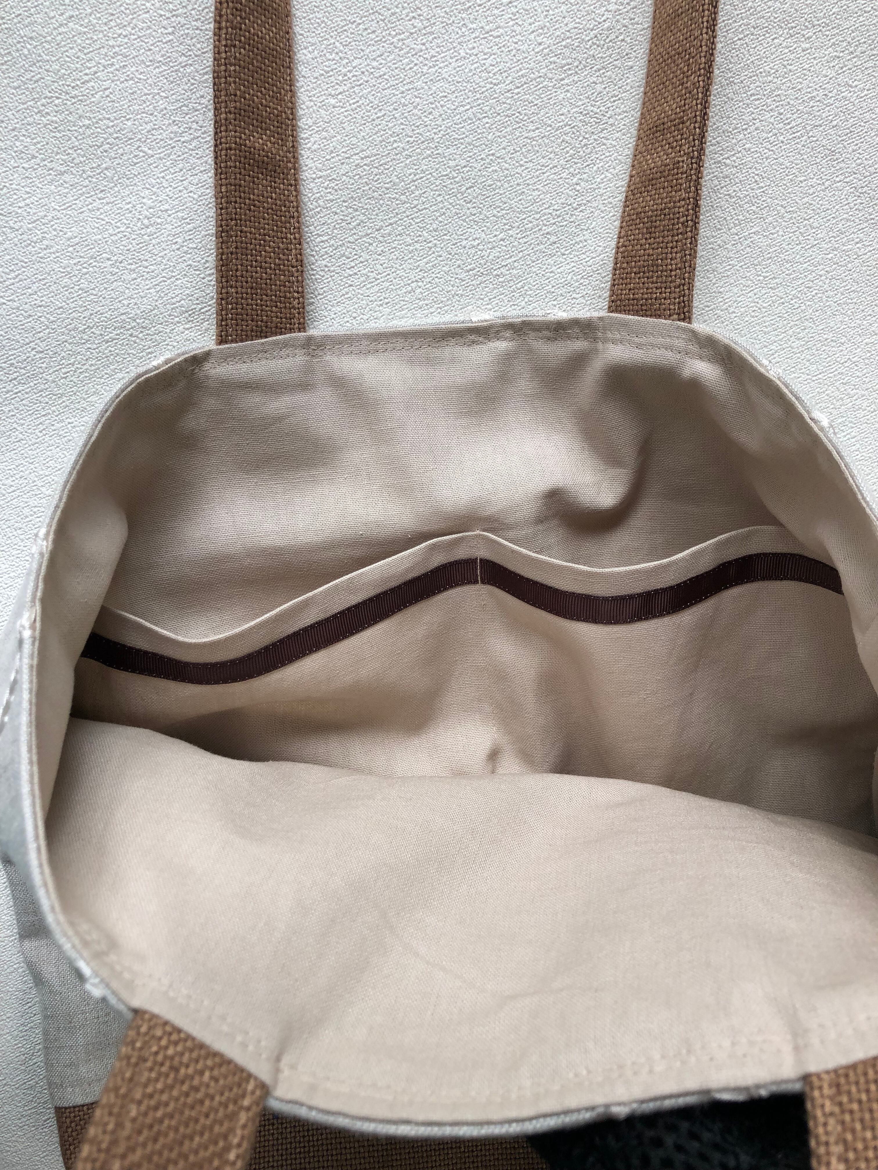 また、市販の持ち手テープに共布を巻き付けしっかりした持ち手になっているので、丈夫で持ち易いです。更にバック口の持ち手の縫い付け部分が重さに耐えれるようにステッチを2本にして補強しています。