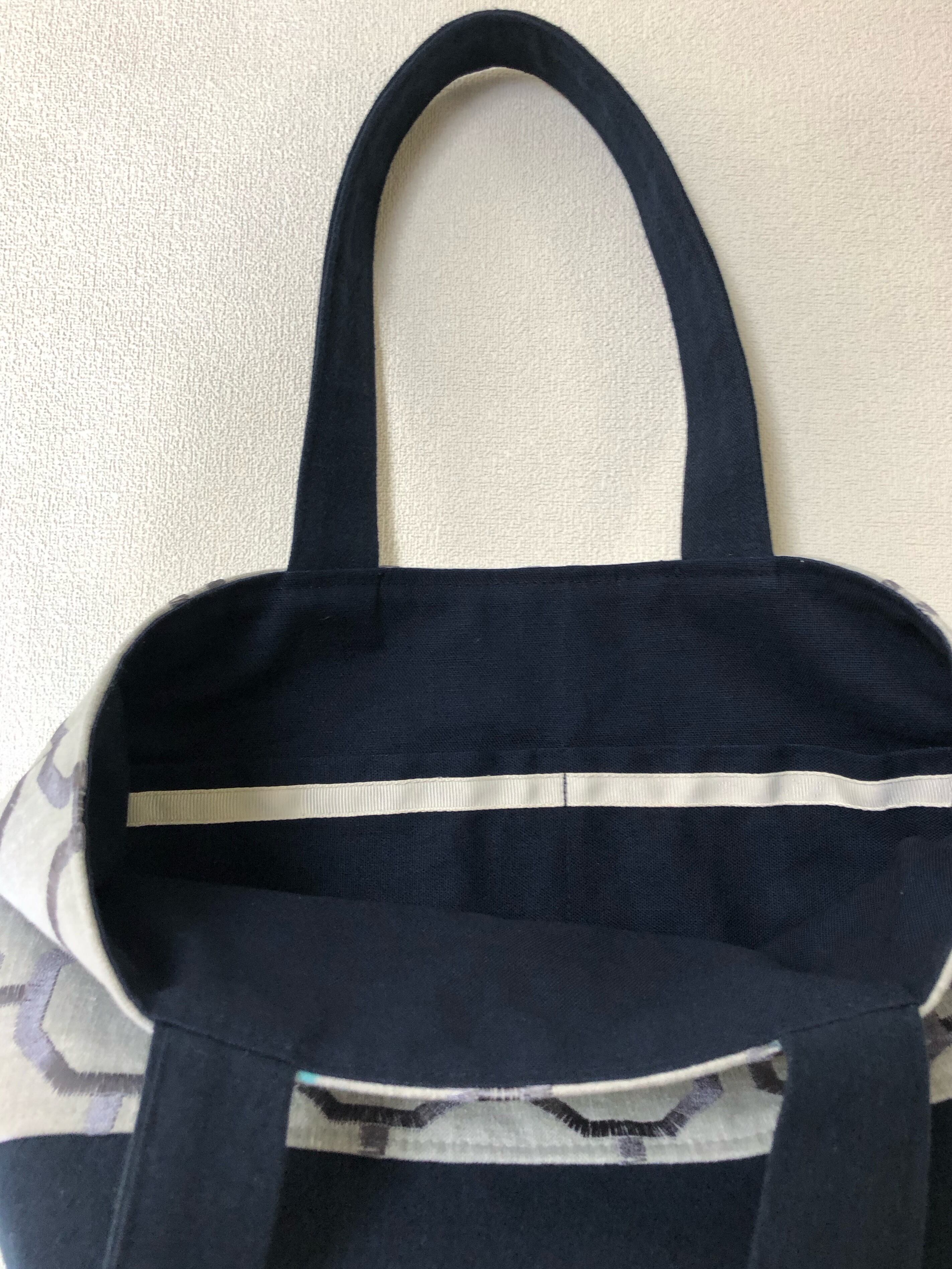 内ポケットは大小2つあり、携帯や鍵などすぐに出したい、しまいたい物にとても便利です。ポケット口には白のリボンテープを縫い付けアクセントにもなり、ポケット位置も探さずに使い易いです。