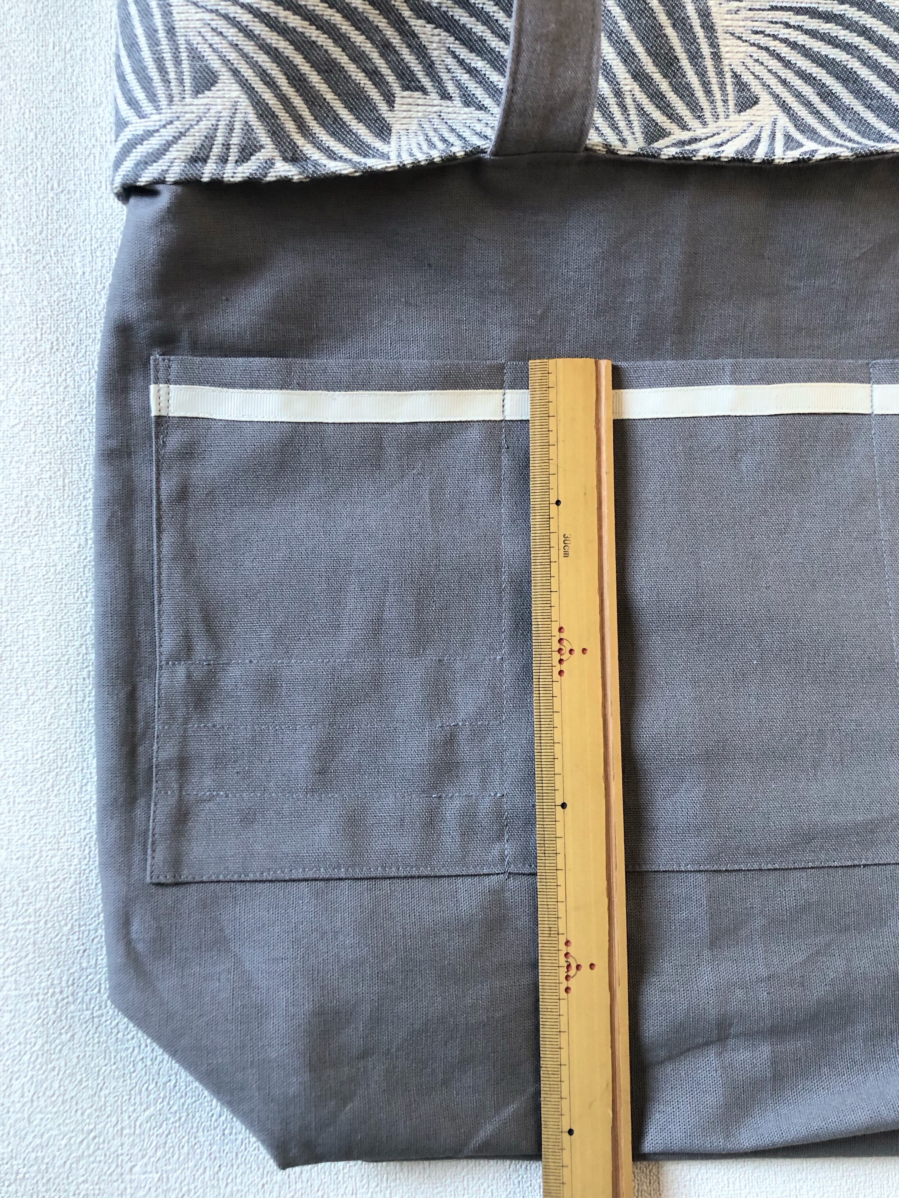 このバッグは横幅が有るのでポケットを大中小3個つけました。小物や、鍵、スマートフォンなどを整理して収納できます。小のポケットは使う人がベストサイズの深さで使えるように底を3本縫っています。リップや目薬など小さいものを入れるのに便利ですので、その場合はそのまま使用して下さい。ちょっと深さが必要な場合は底縫いを解いてお使い下さい。小は横幅が狭い為あまり深くすると手が入らず使いづらくなり、その反面浅いとリップとか小物の出し入れがしやすいと言うメリットがあります。お好みで調整してお使い下さい。(ほどきたい時は底糸を針や楊枝のような尖ったもので、ちょっと引き出して切ると楽にほどけます)
