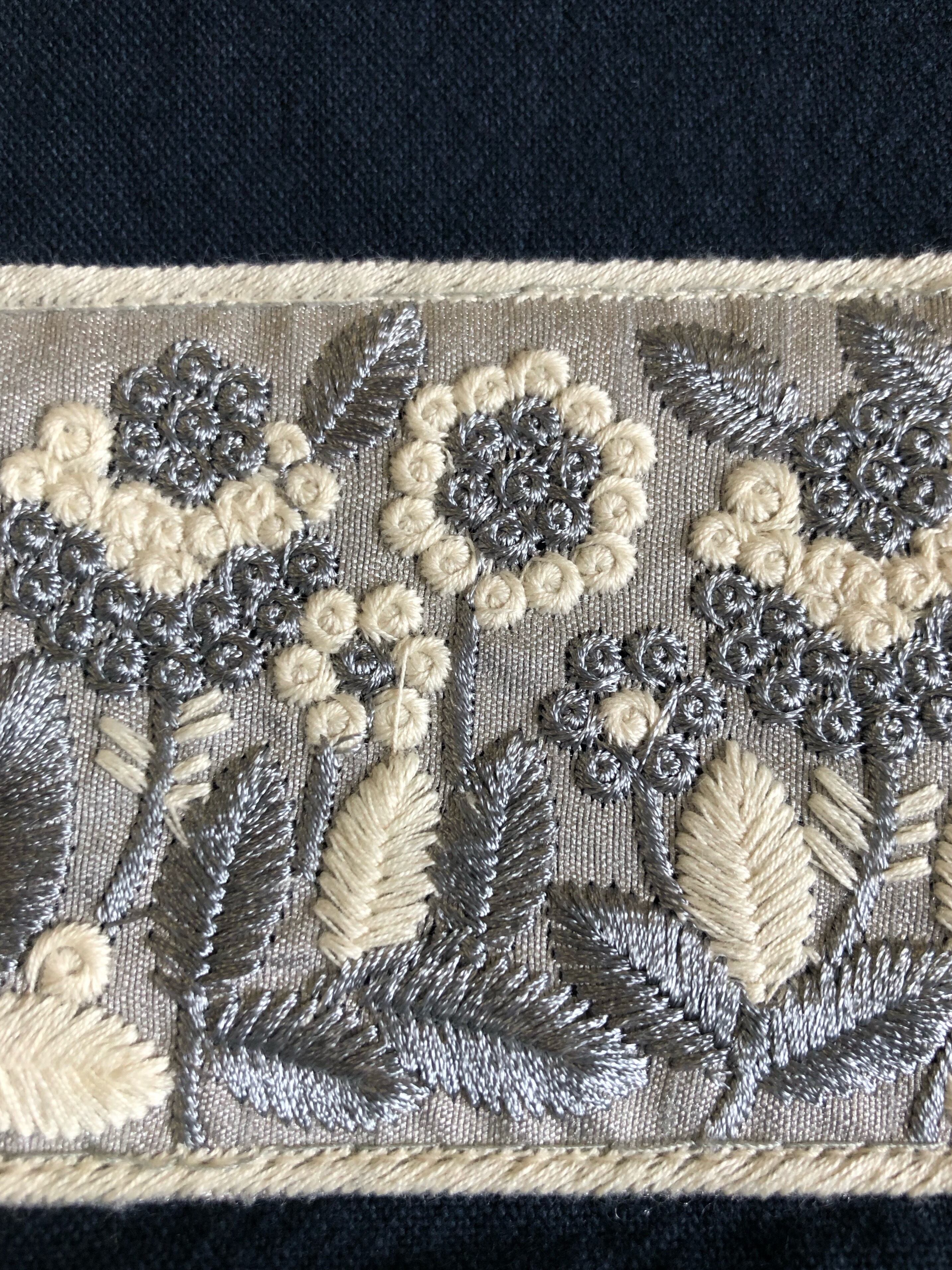 グレーと白の華やかなインド刺繍の縦長ショルダートートバックです。手の込んだ花々の刺繍が目を惹きます。