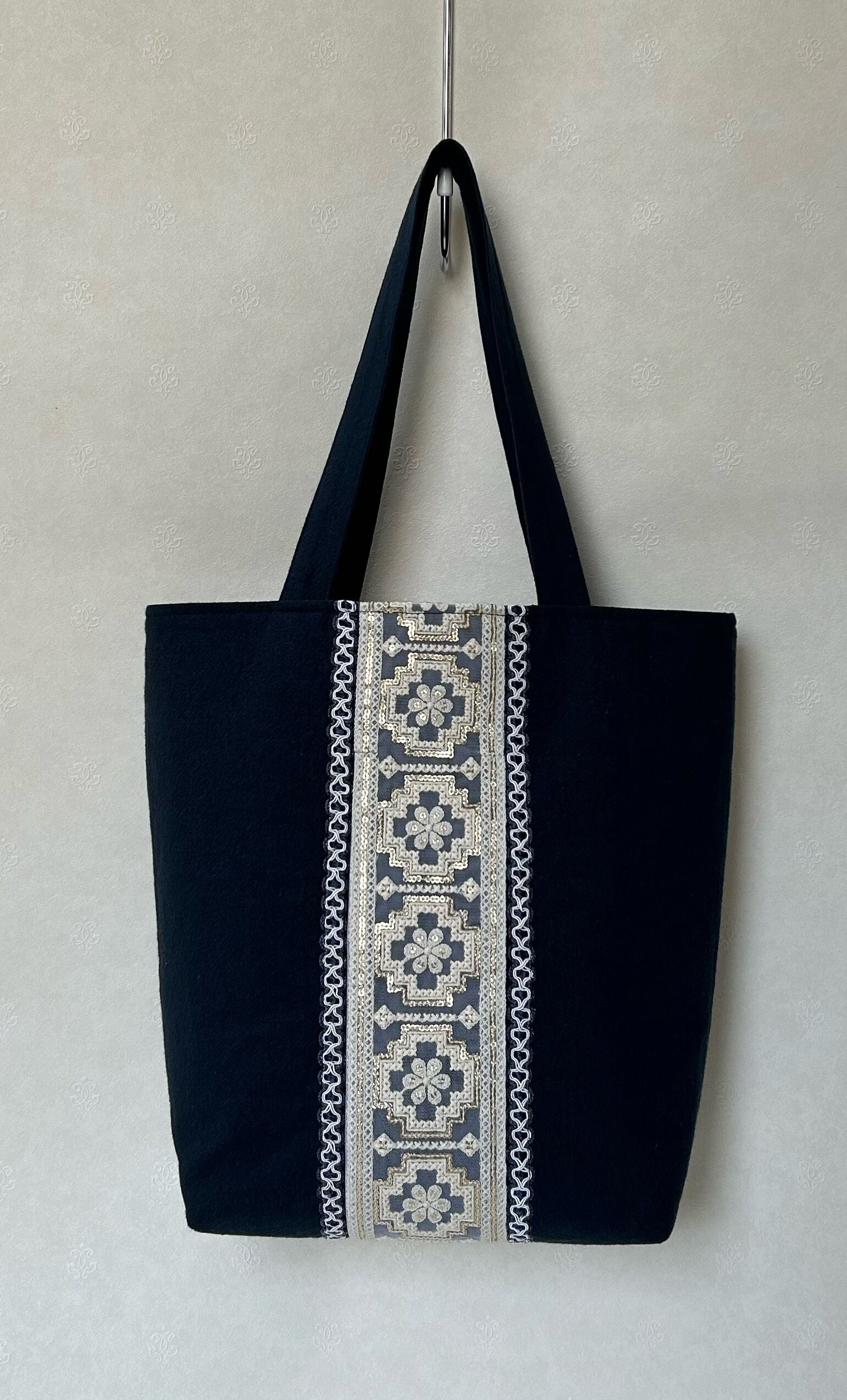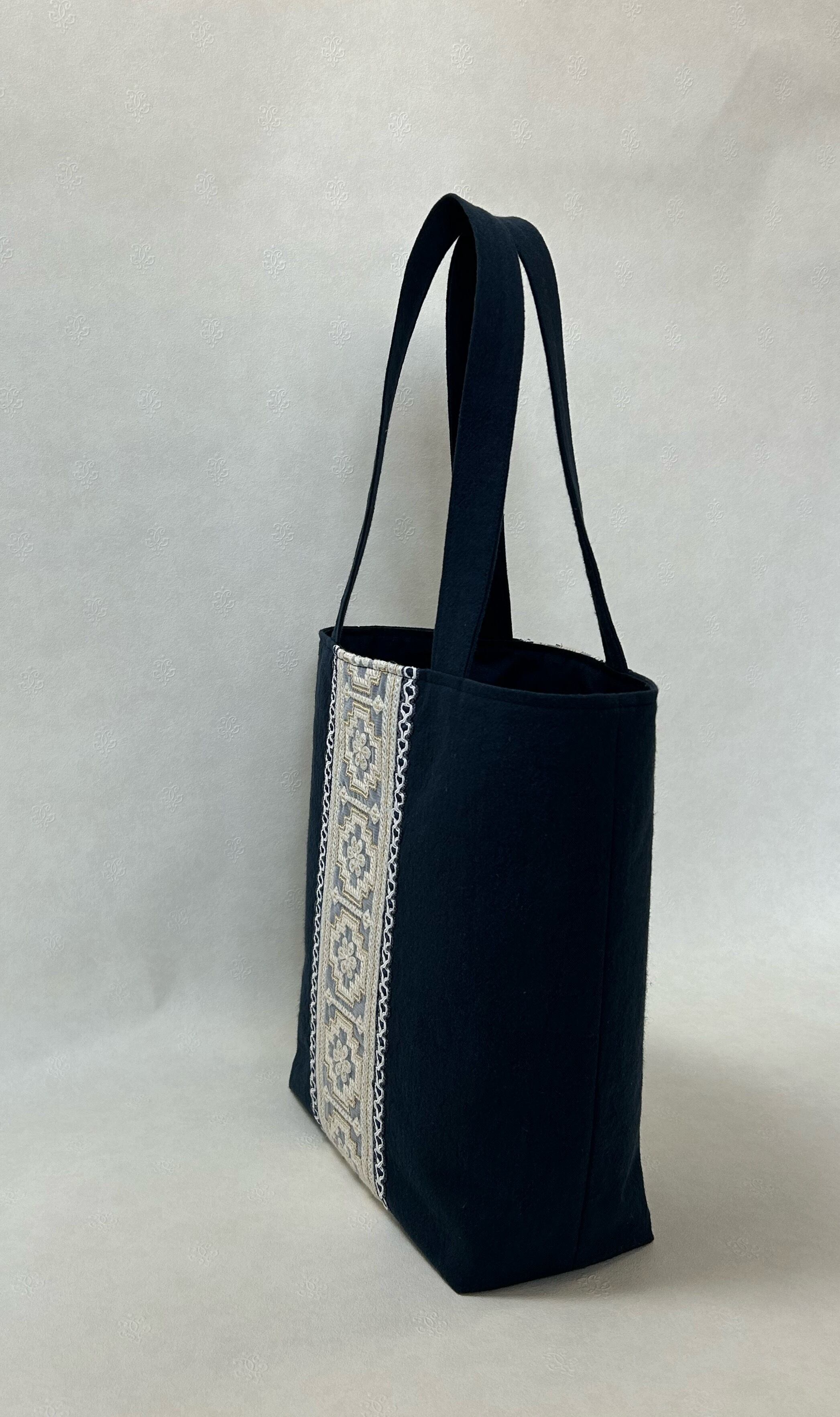 紺ブレードと白インド刺繍のショルダートートバッグ