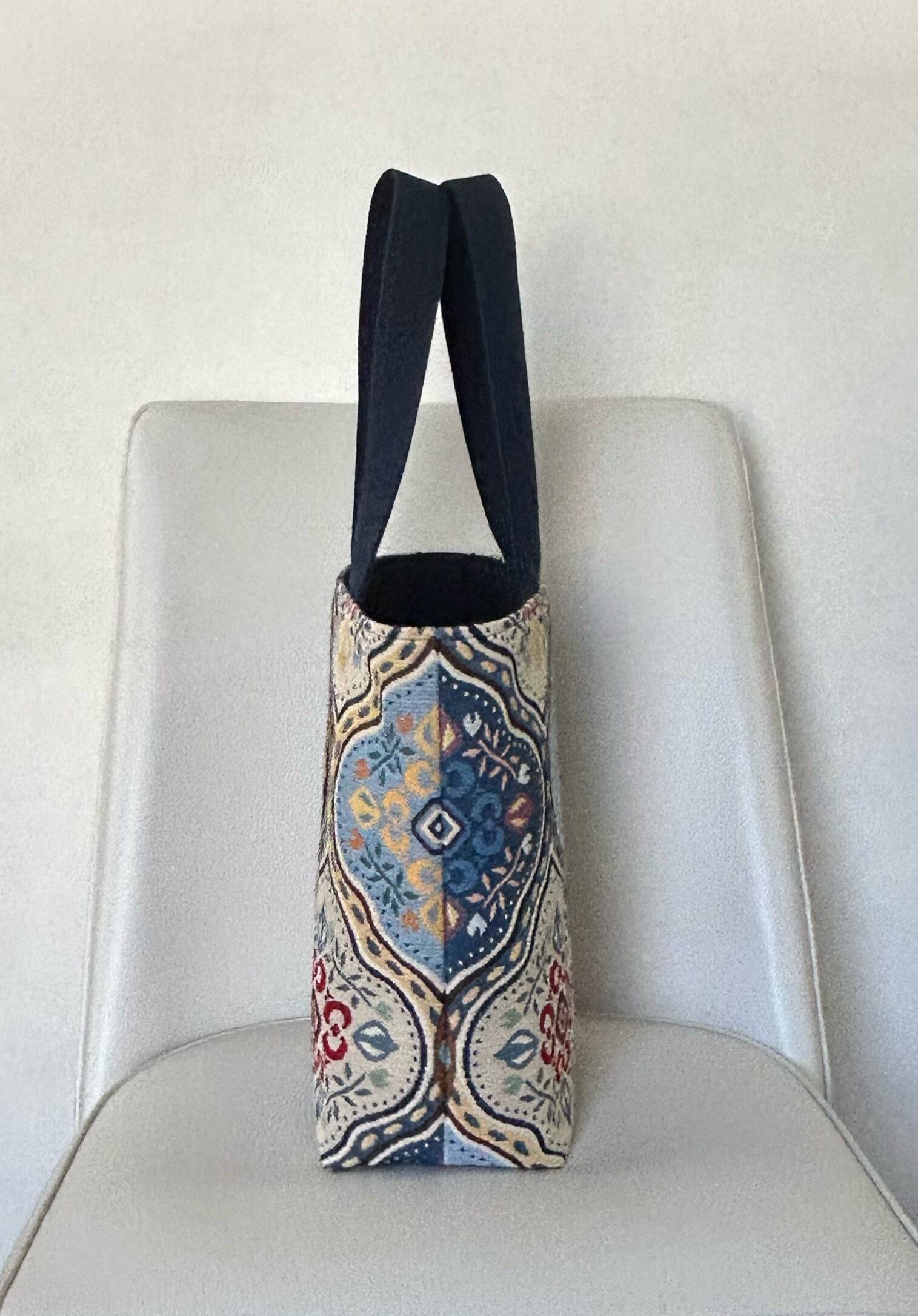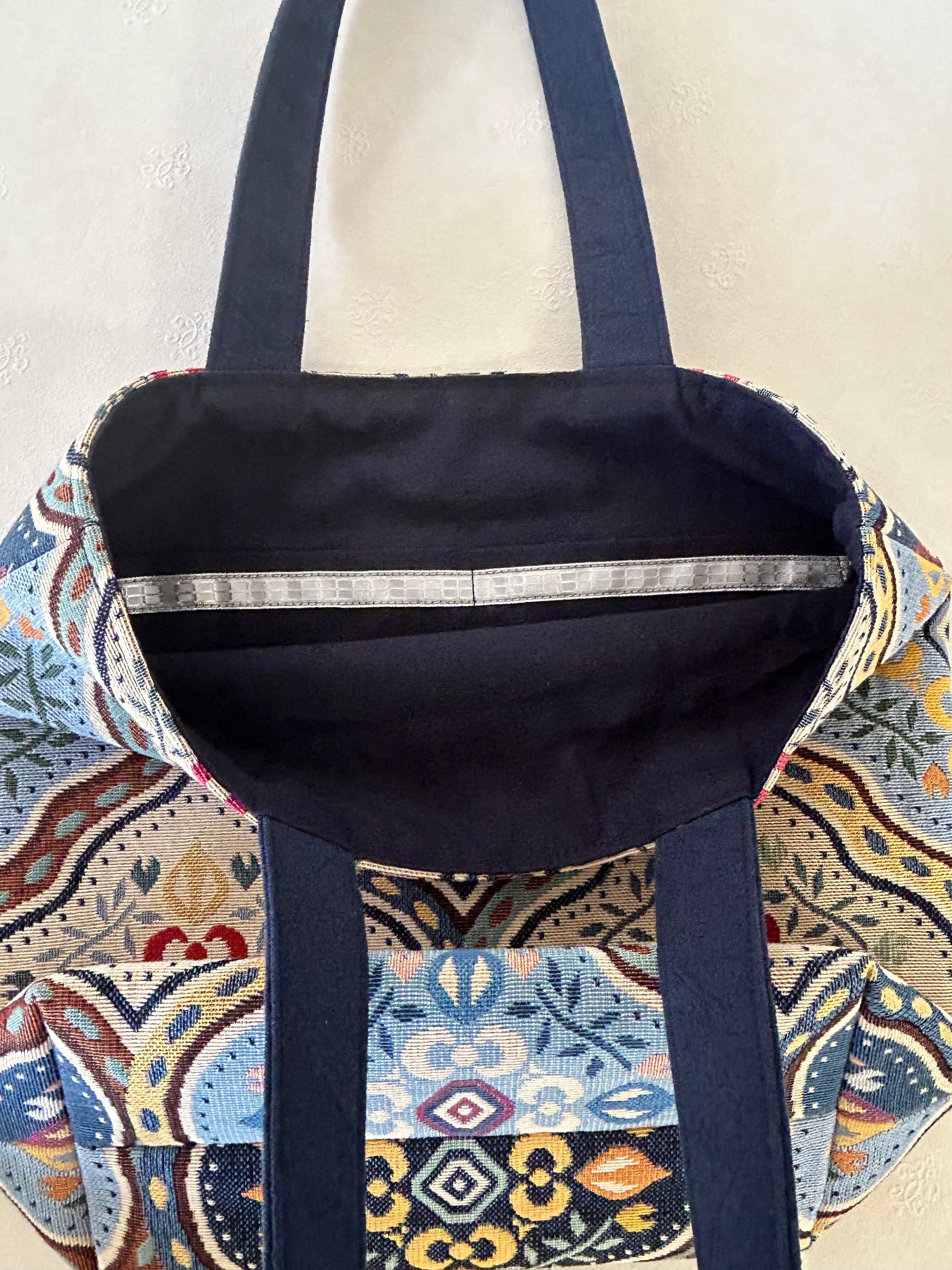 モロッカン柄の中型トートバッグは、スペイン生地の上質な素材でエスニックな柄が目を引き、大容量なのにコンパクトで機能的。買い物やお出かけにピッタリのサイズ感です。