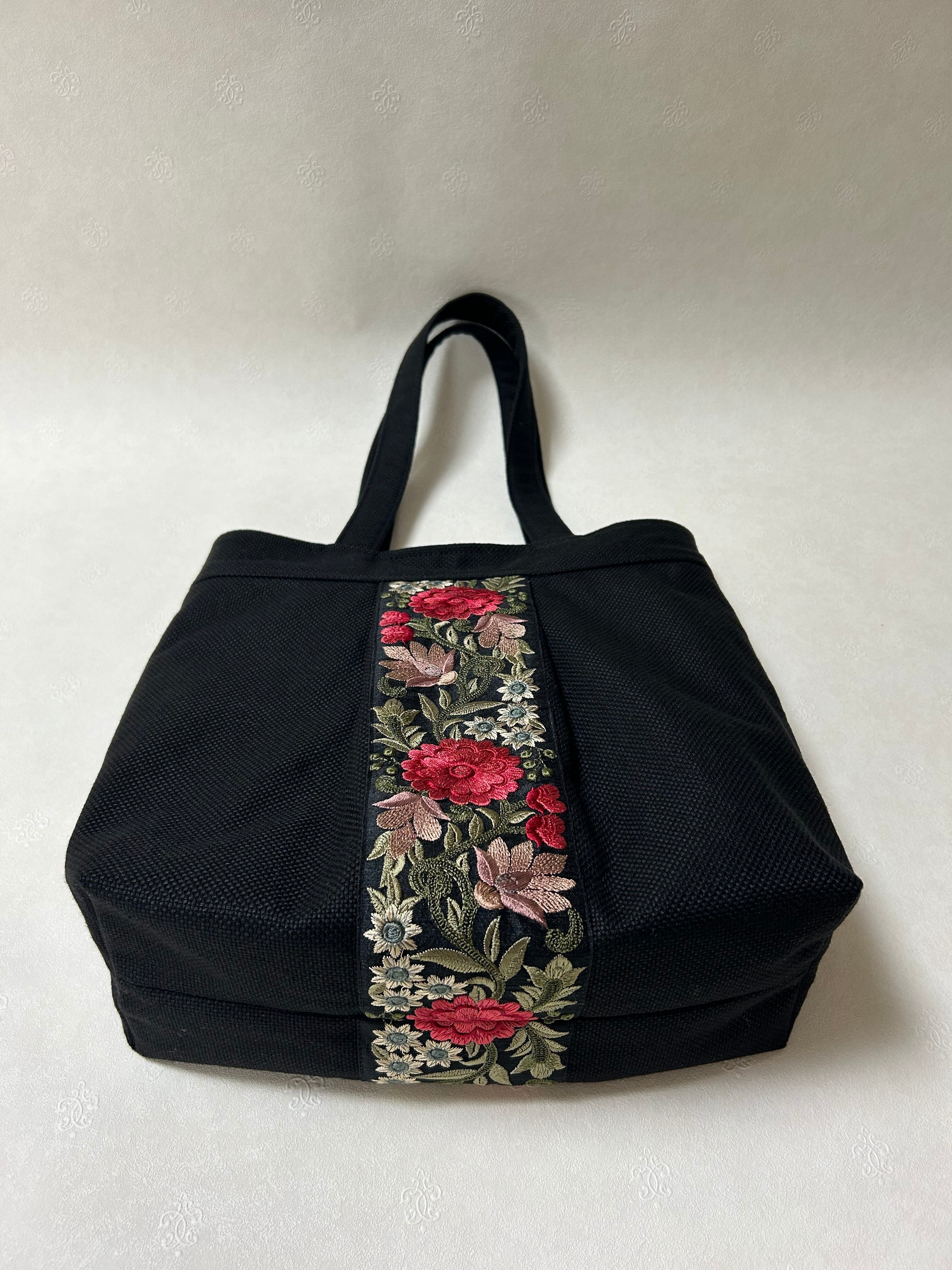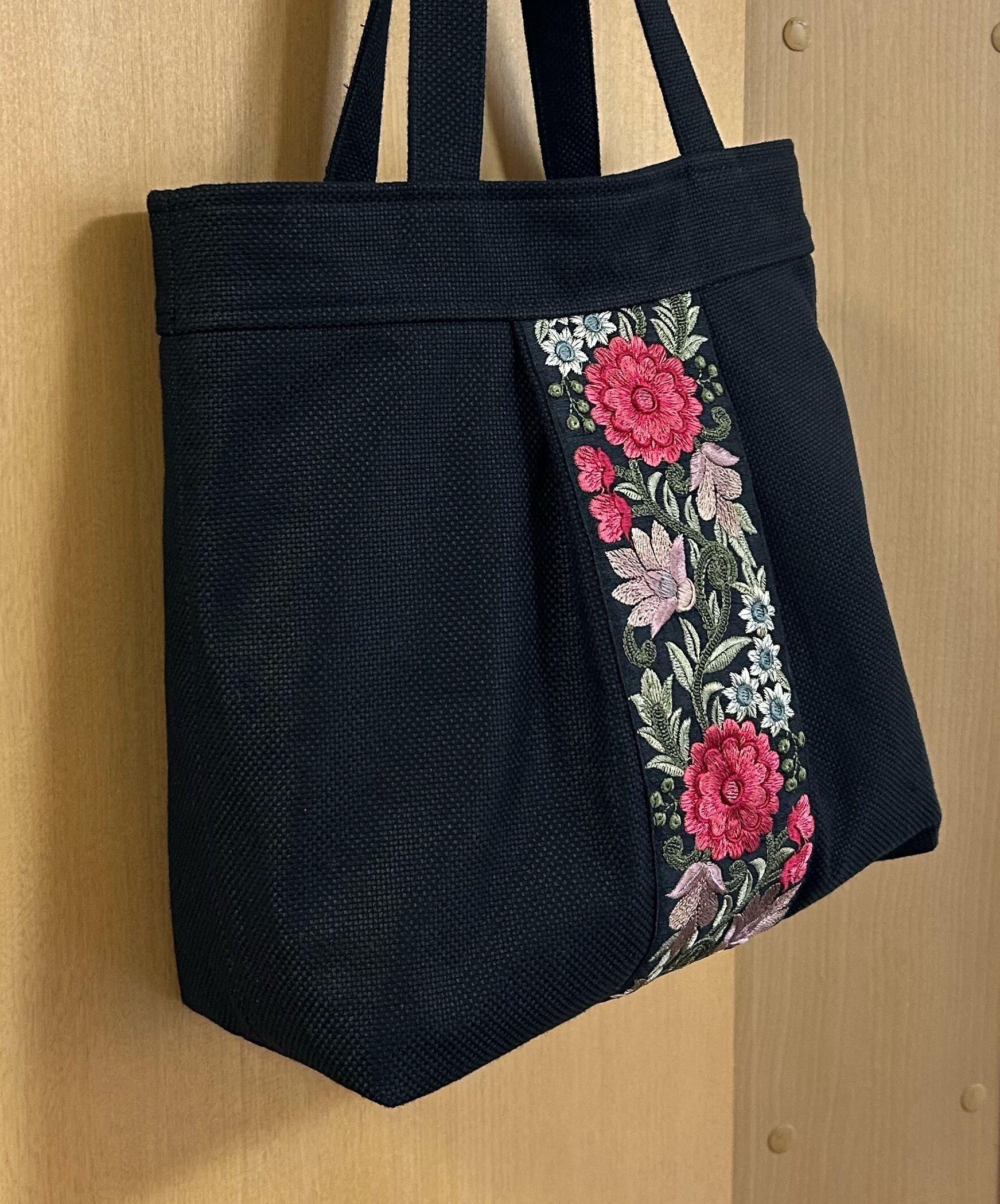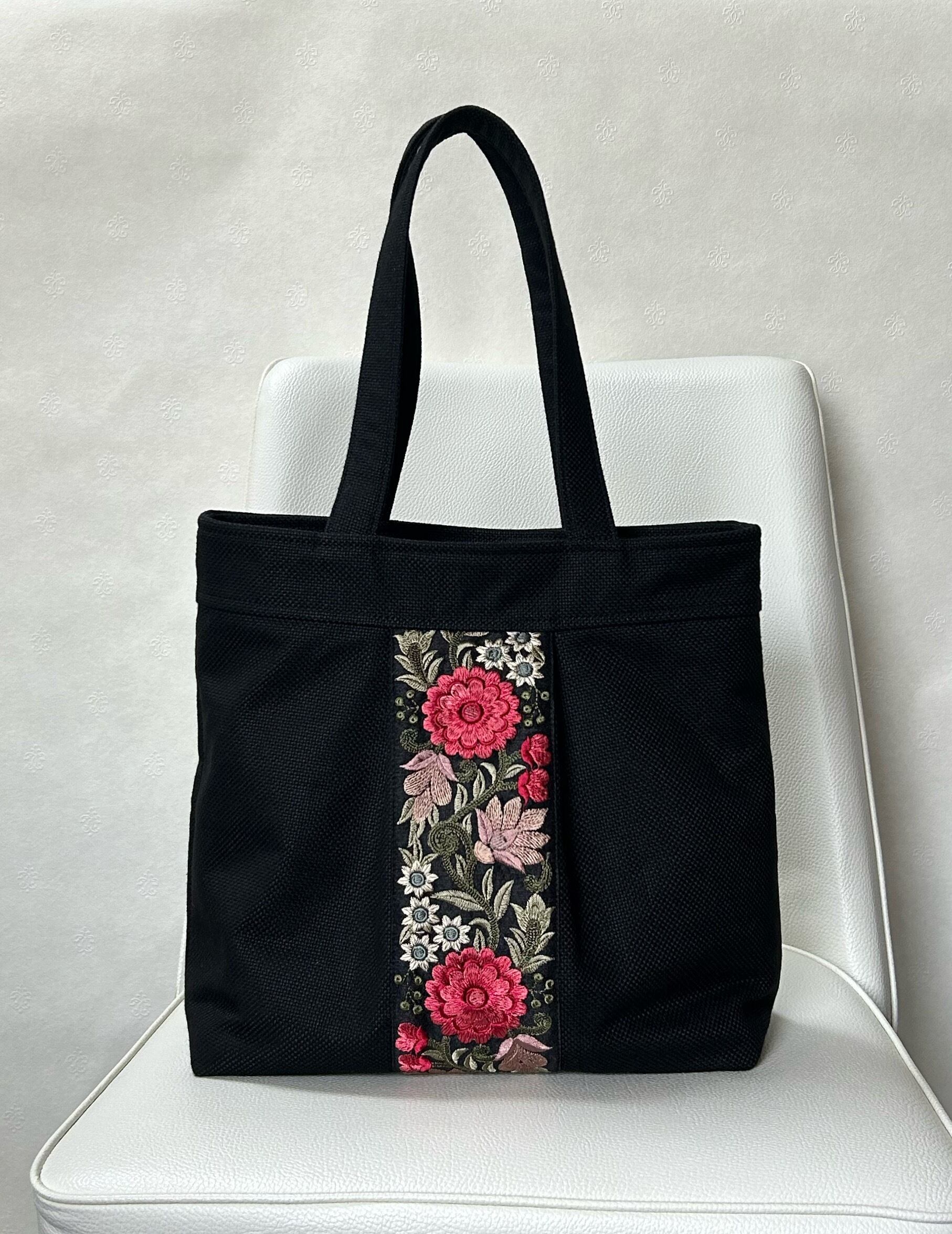 大花インド刺繍のふっくらトートバッグは黒地のバックの両面に施された贅沢なバックです。