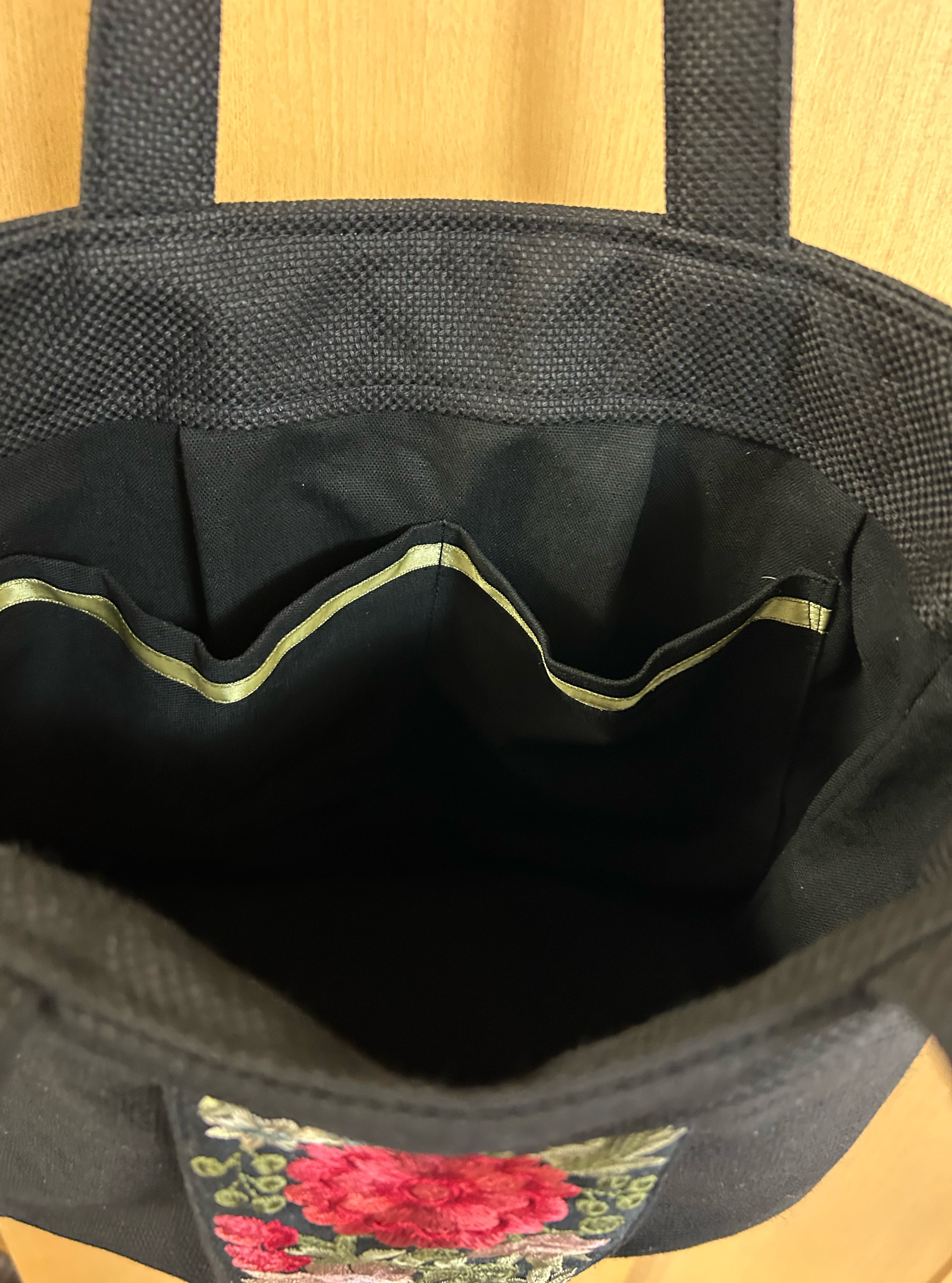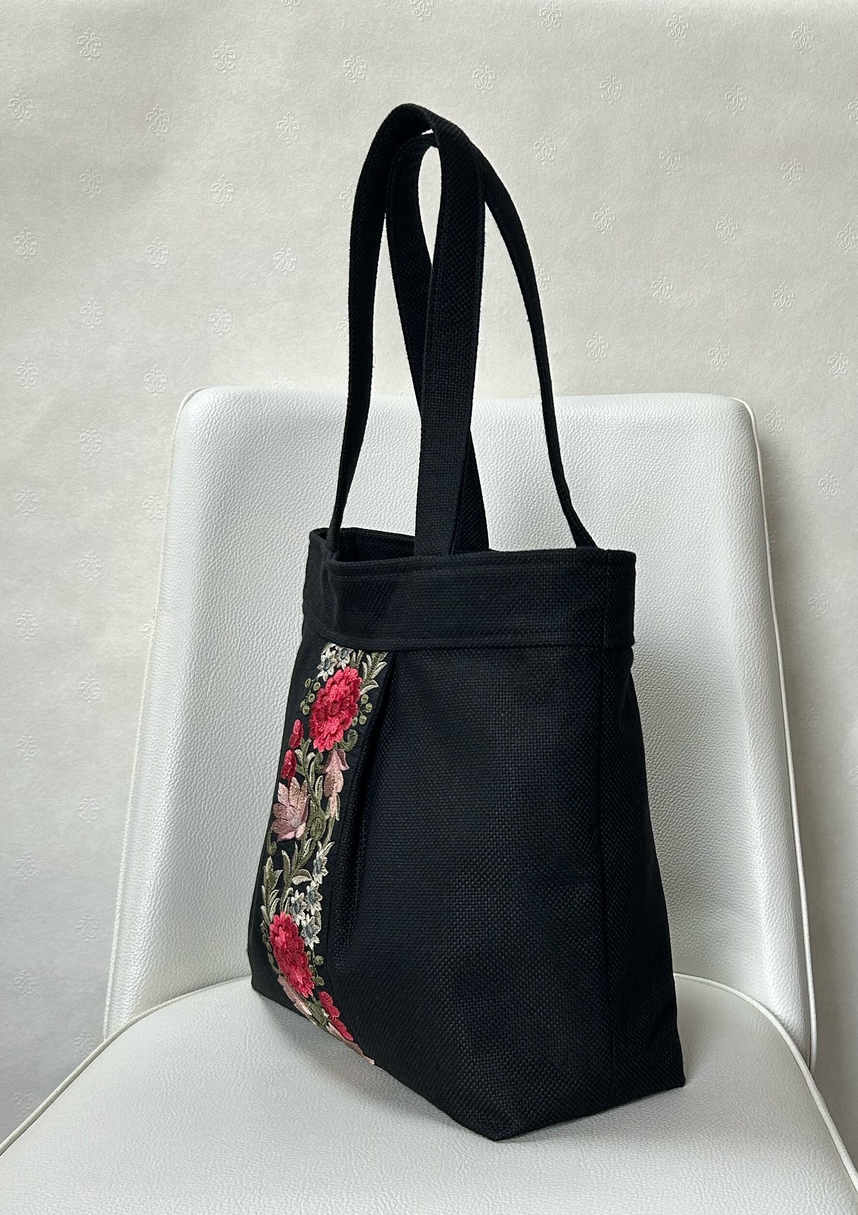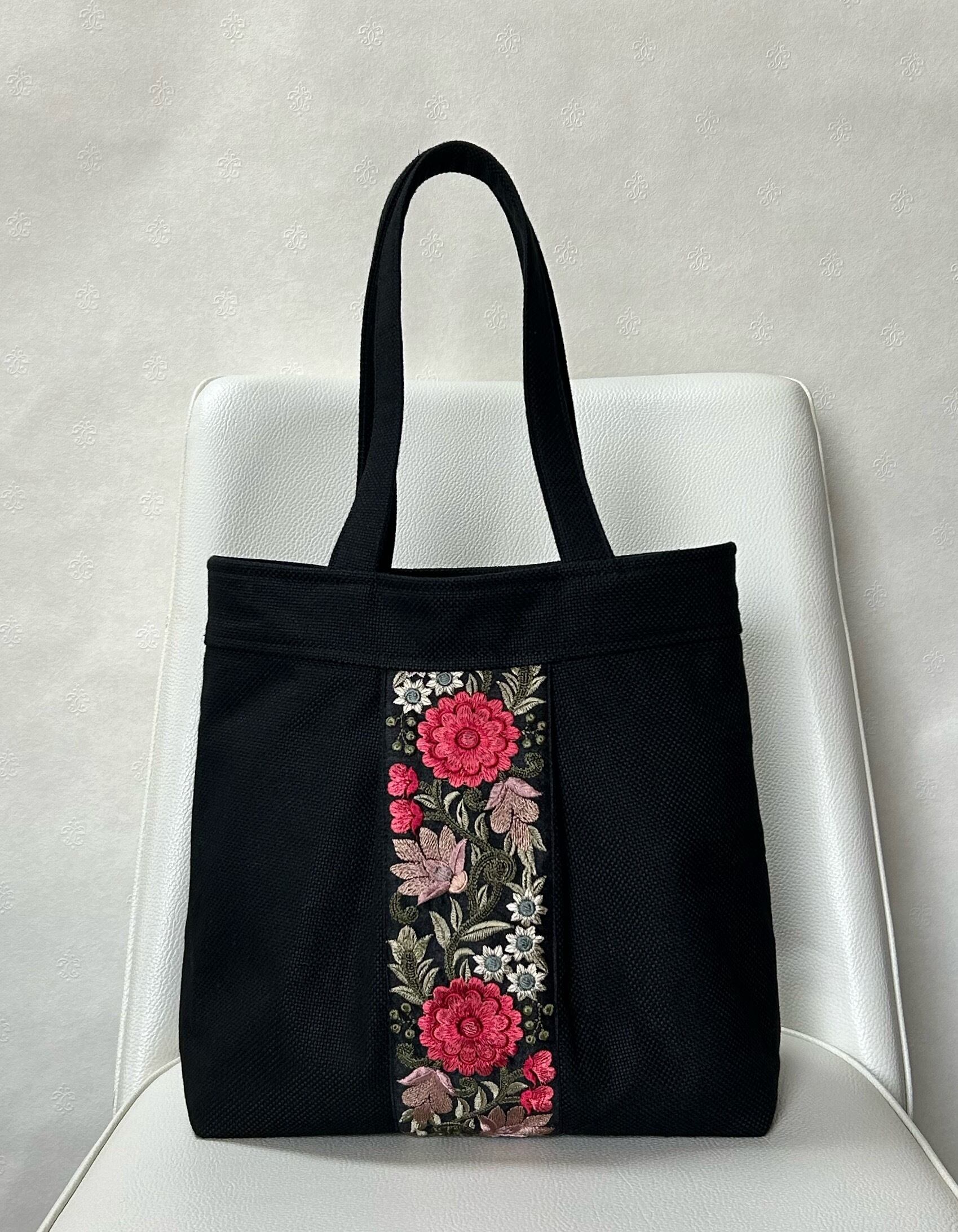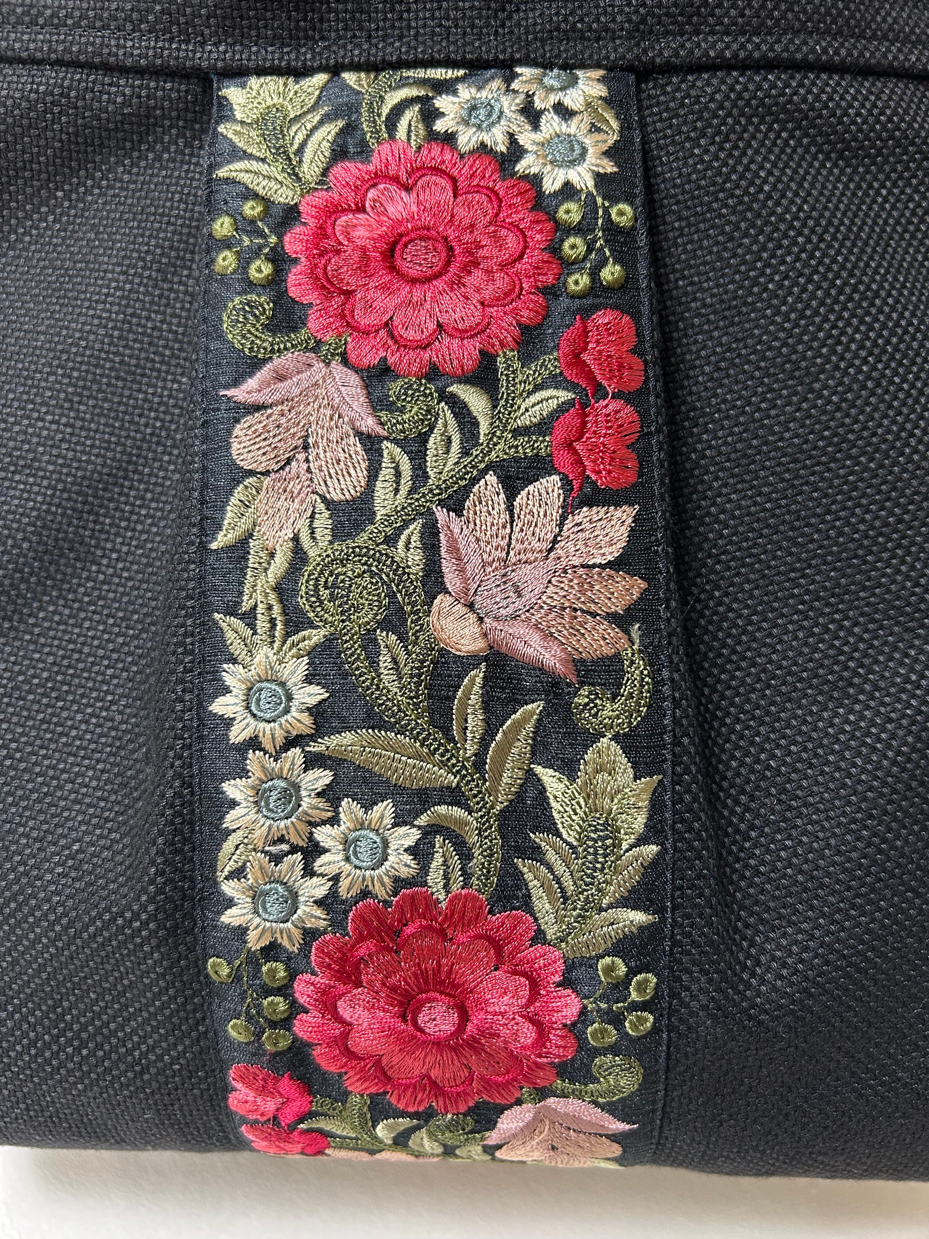 大花インド刺繍のふっくらトートバッグは黒地のバックの両面に施された贅沢なバックです。