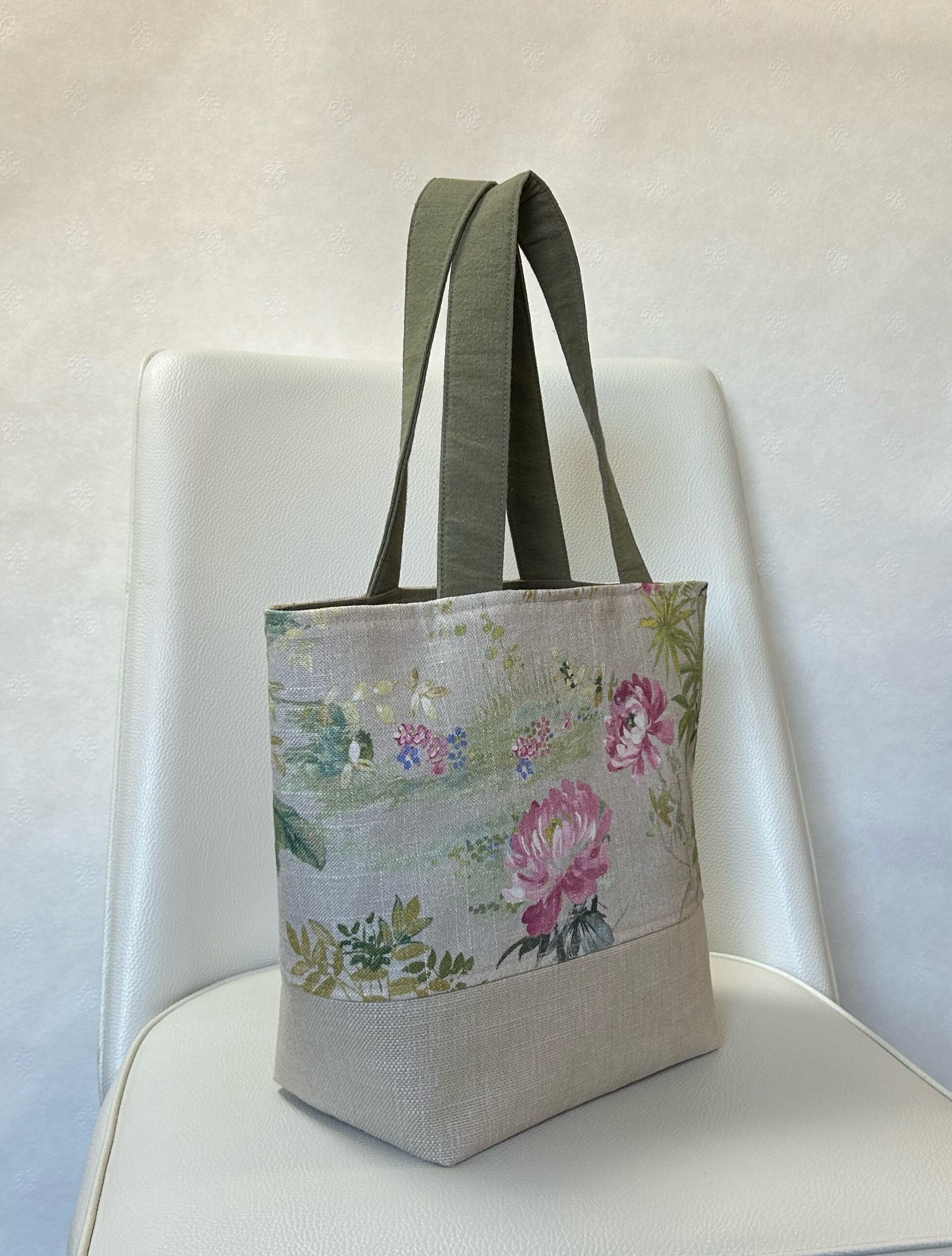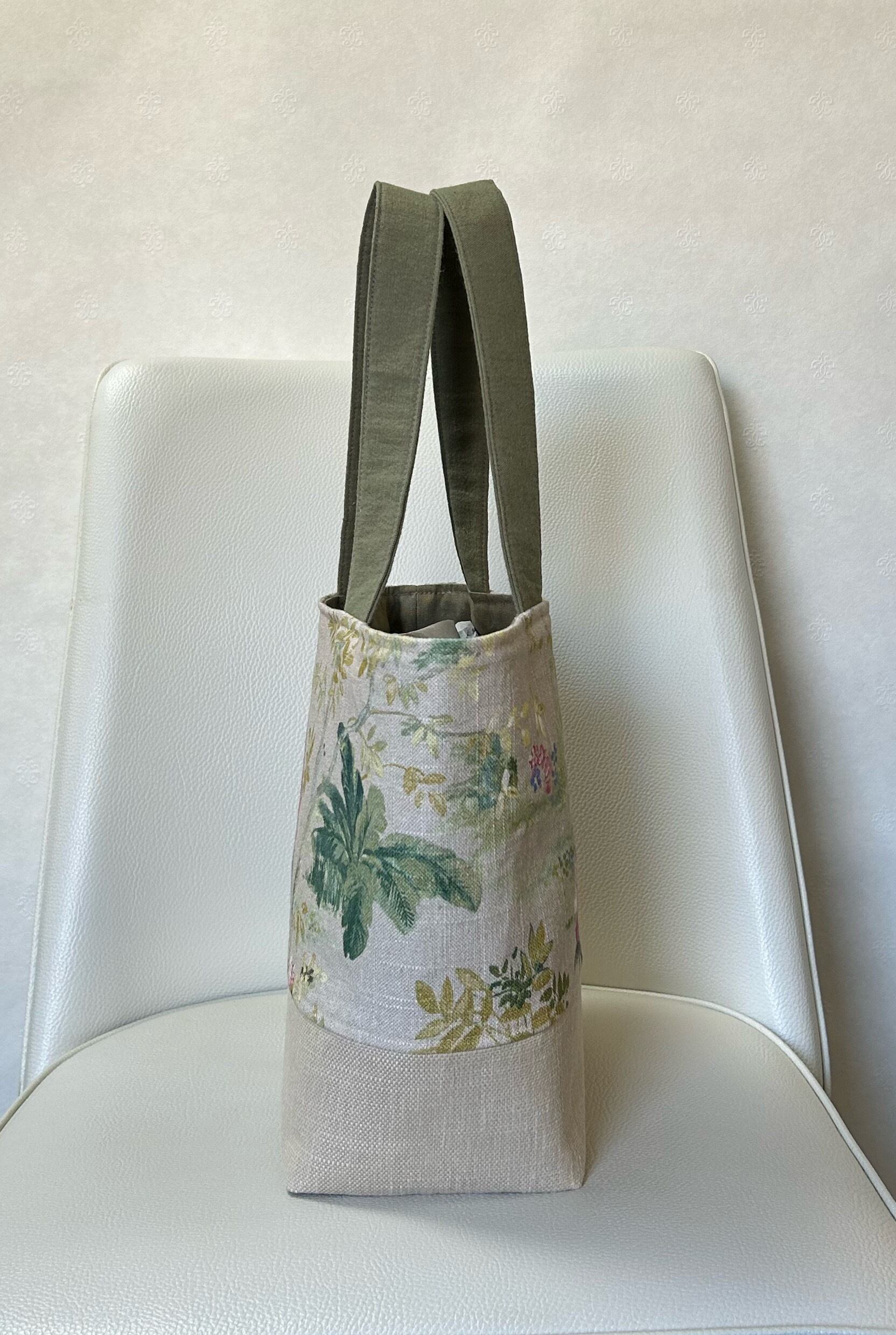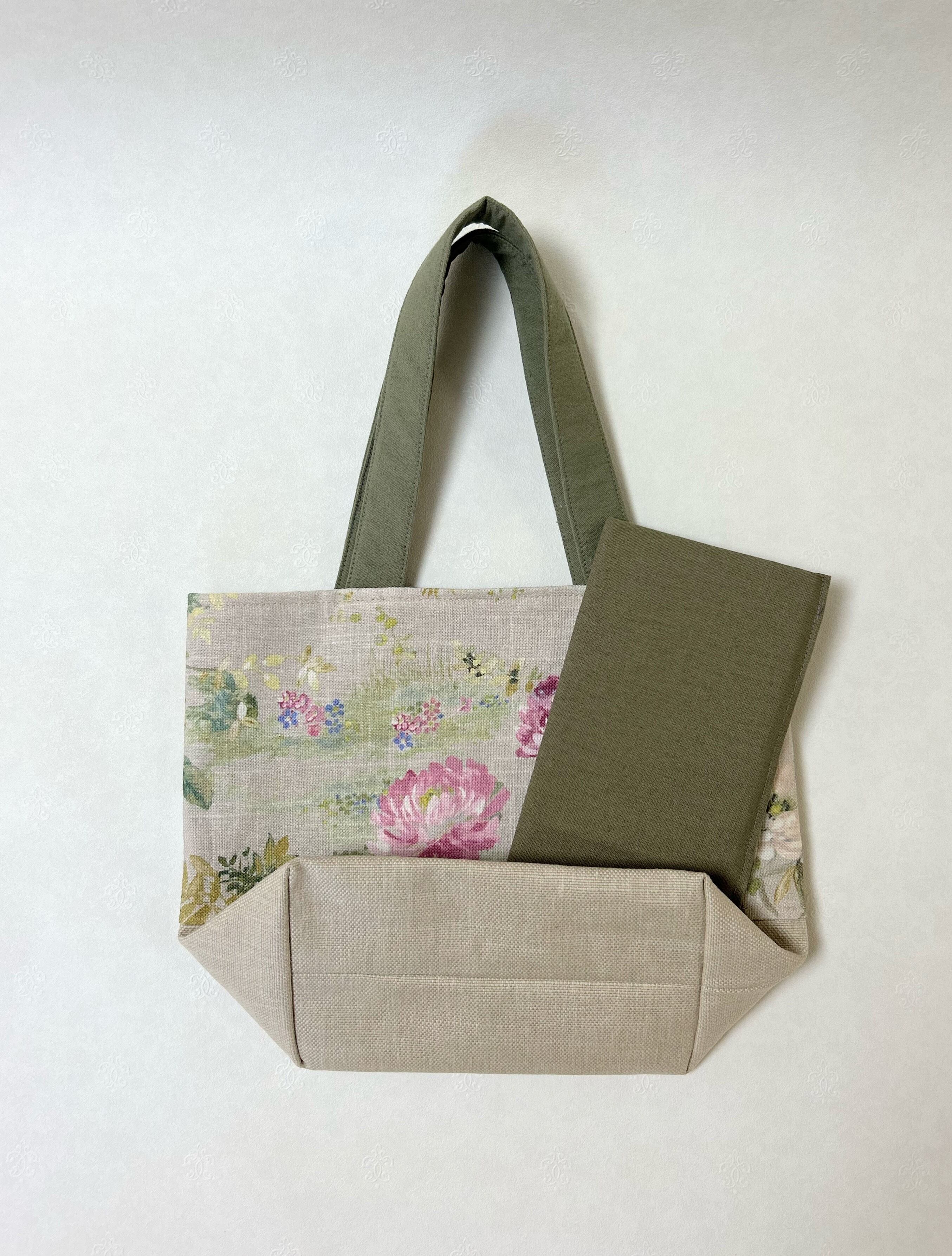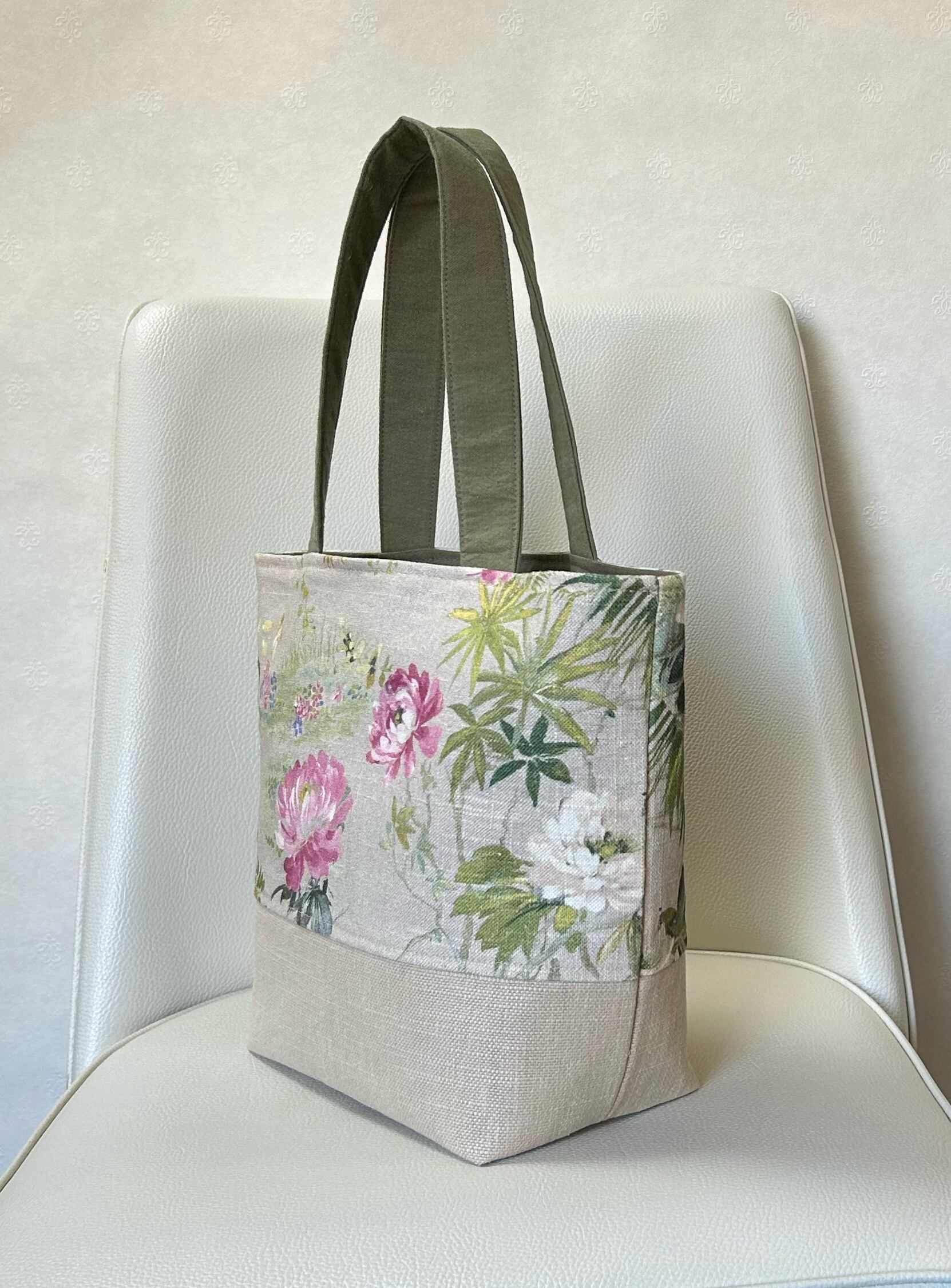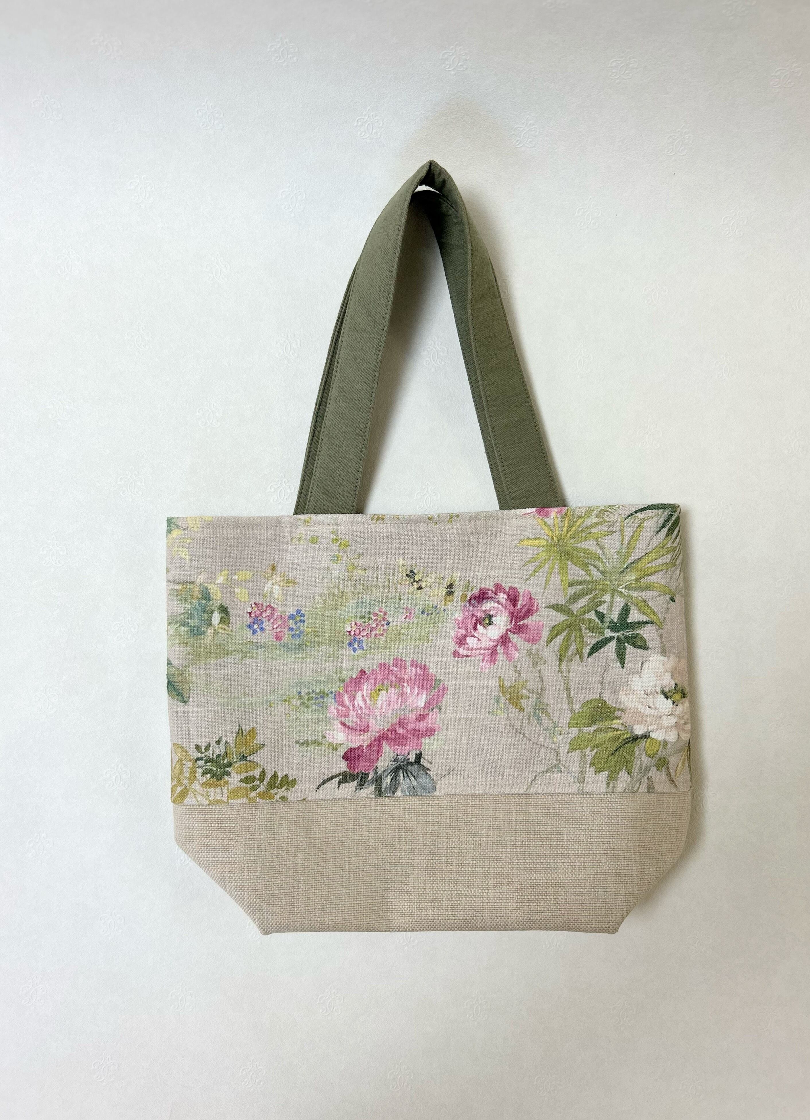 持ち手は厚手の綿麻生地にしっかりした接着芯を貼り持ち易いと思います。
