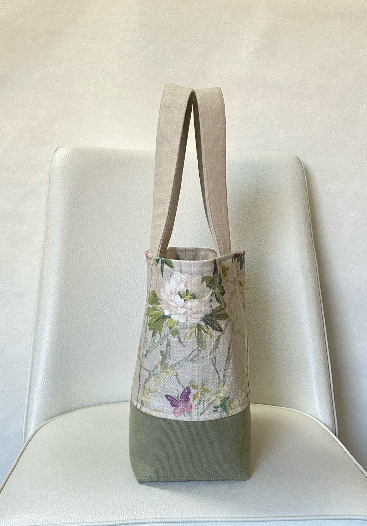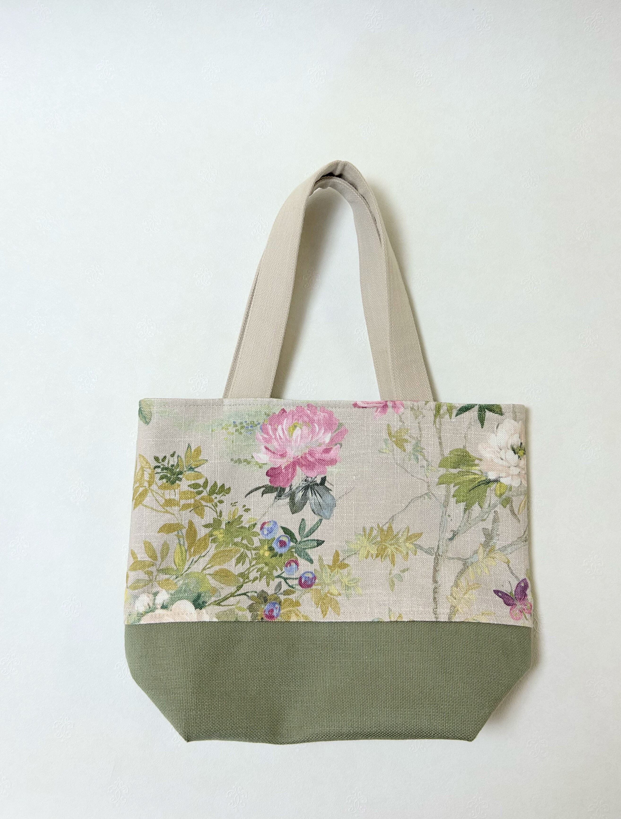 草花プリント.グリーンツートンカラートート