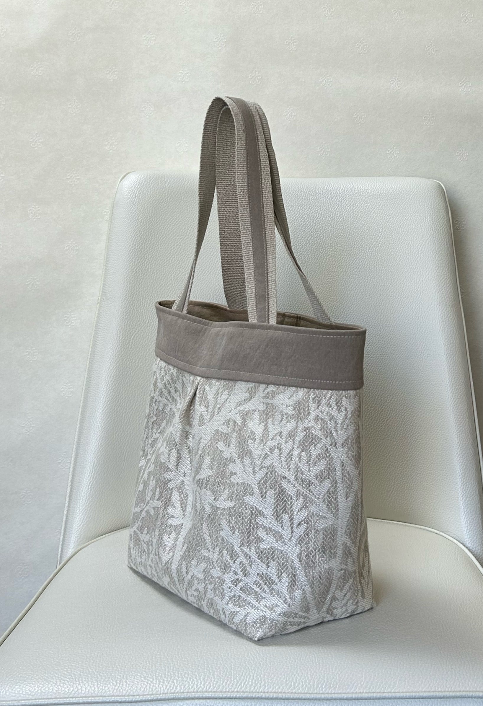 ジャガード織ワンタックツートントートは、上質なイギリス生地を使用したトートバッグです。独特の木々の模様がジャガード織りで表現され、木が浮き出る様な雰囲気を演出しています。