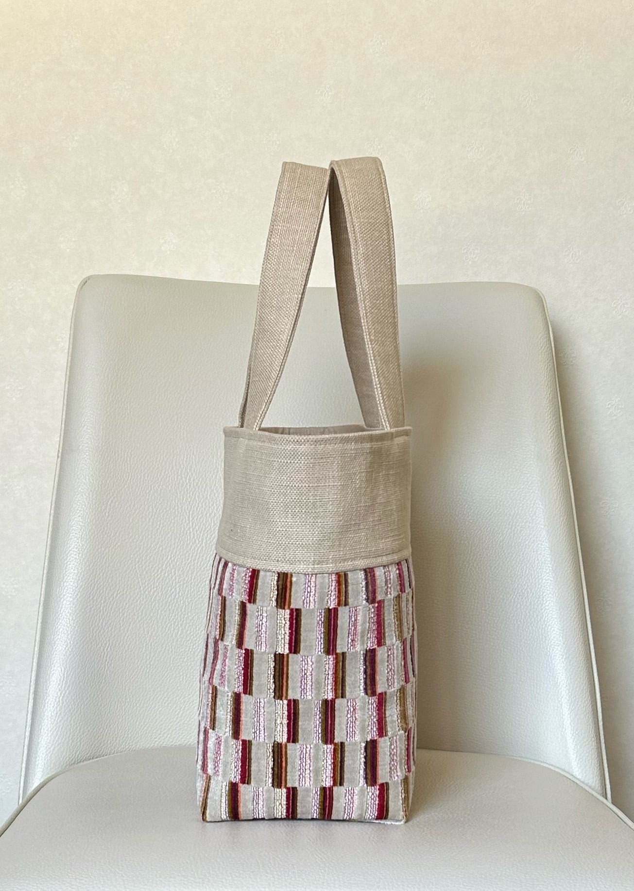 モール織、ベージュ地、持ち手にもしっかりした芯を貼って作っていますのでバックも自立し、持ち手も使い易いです。
