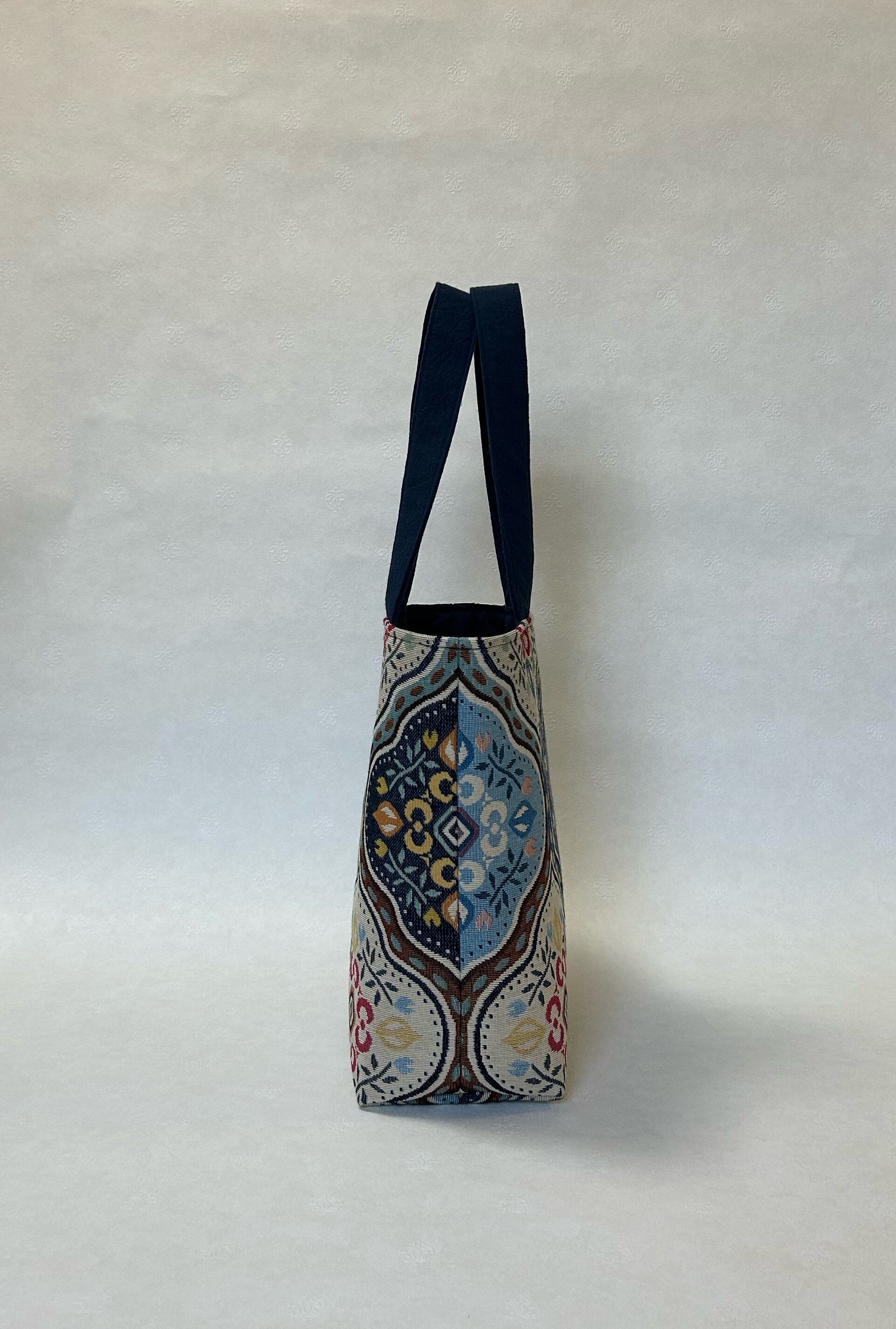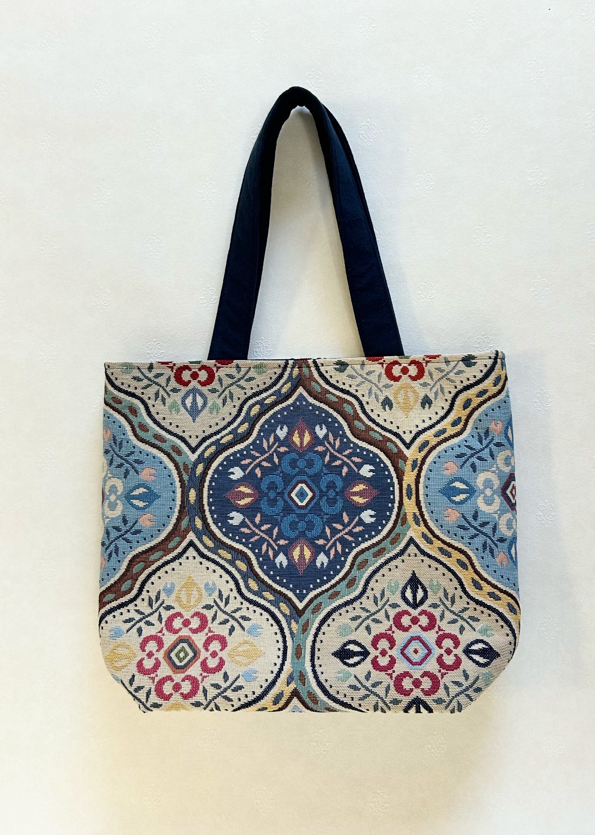 モロッカン柄の中型トートバッグは、スペイン生地の上質な素材でエスニックな柄が目を引き、容量多めなのにコンパクトで機能的。買い物やお出かけにピッタリのサイズ感です。