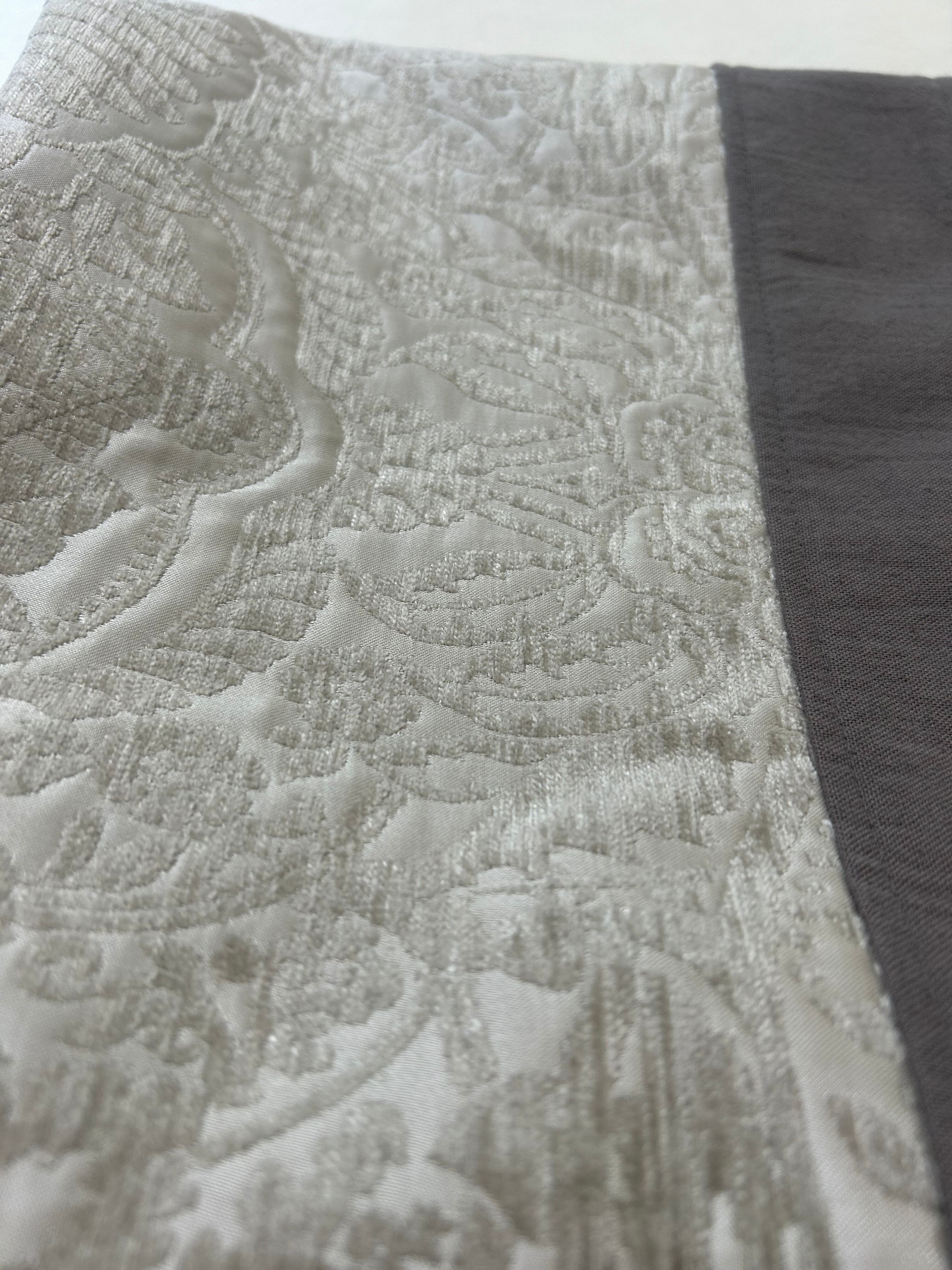 イギリスのモール&サテンジャガードの生地で光沢があります。ジャガードのベルベット調の部分は左右角度が変わると色目が濃く見えたり薄く見えたりと変化します。