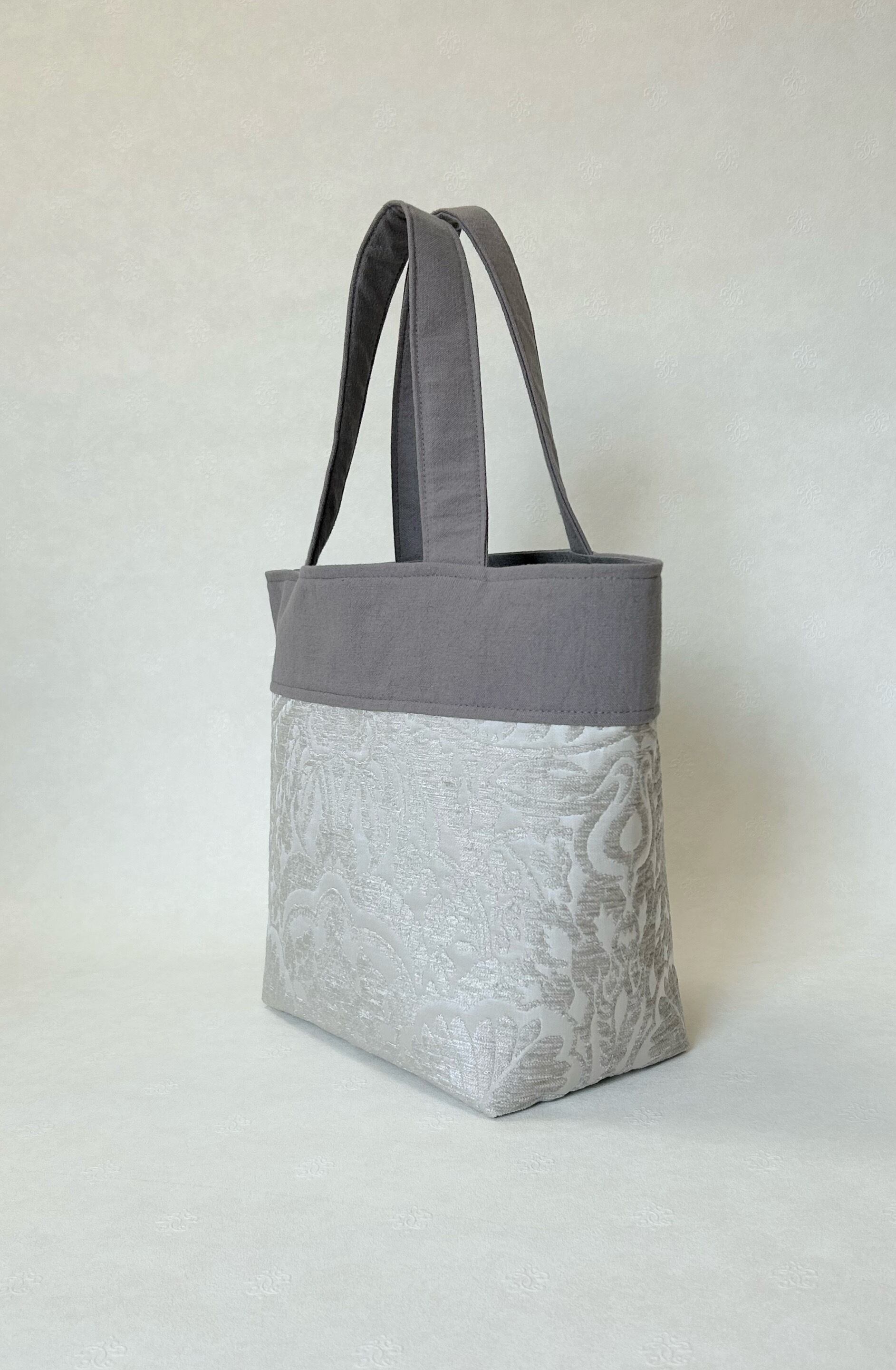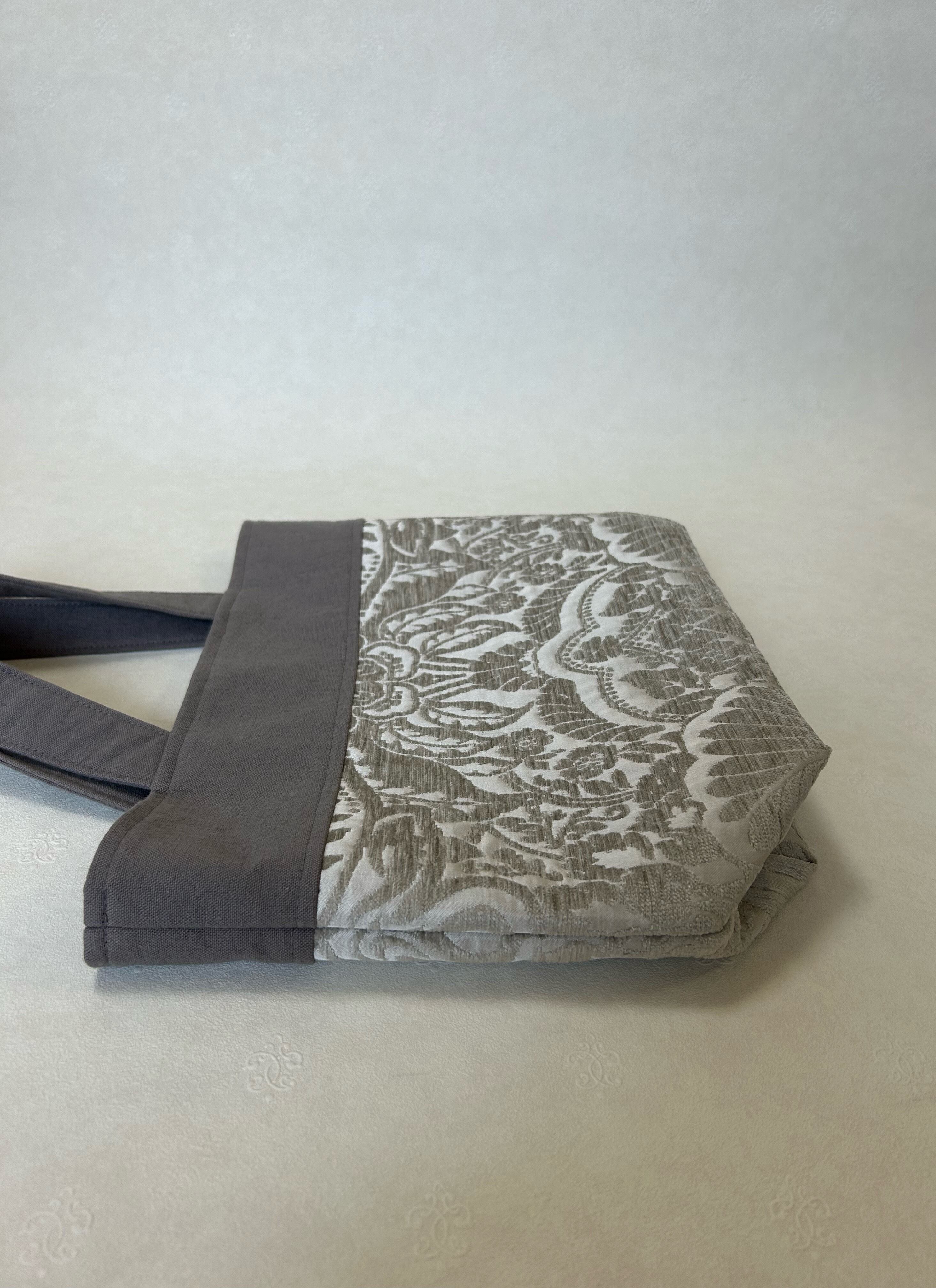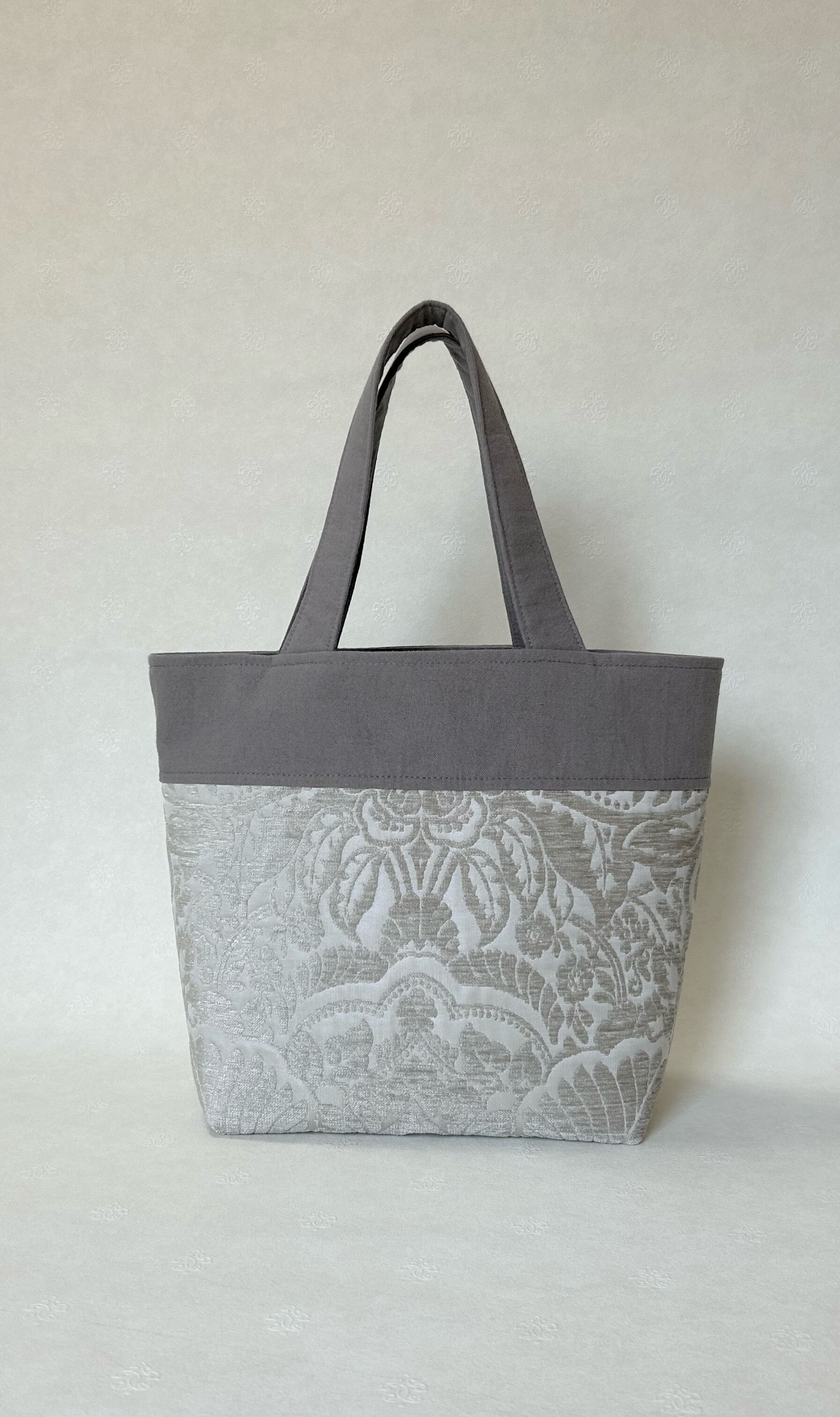 薄いグレーのサテン地に少し濃いグレーの柄です。