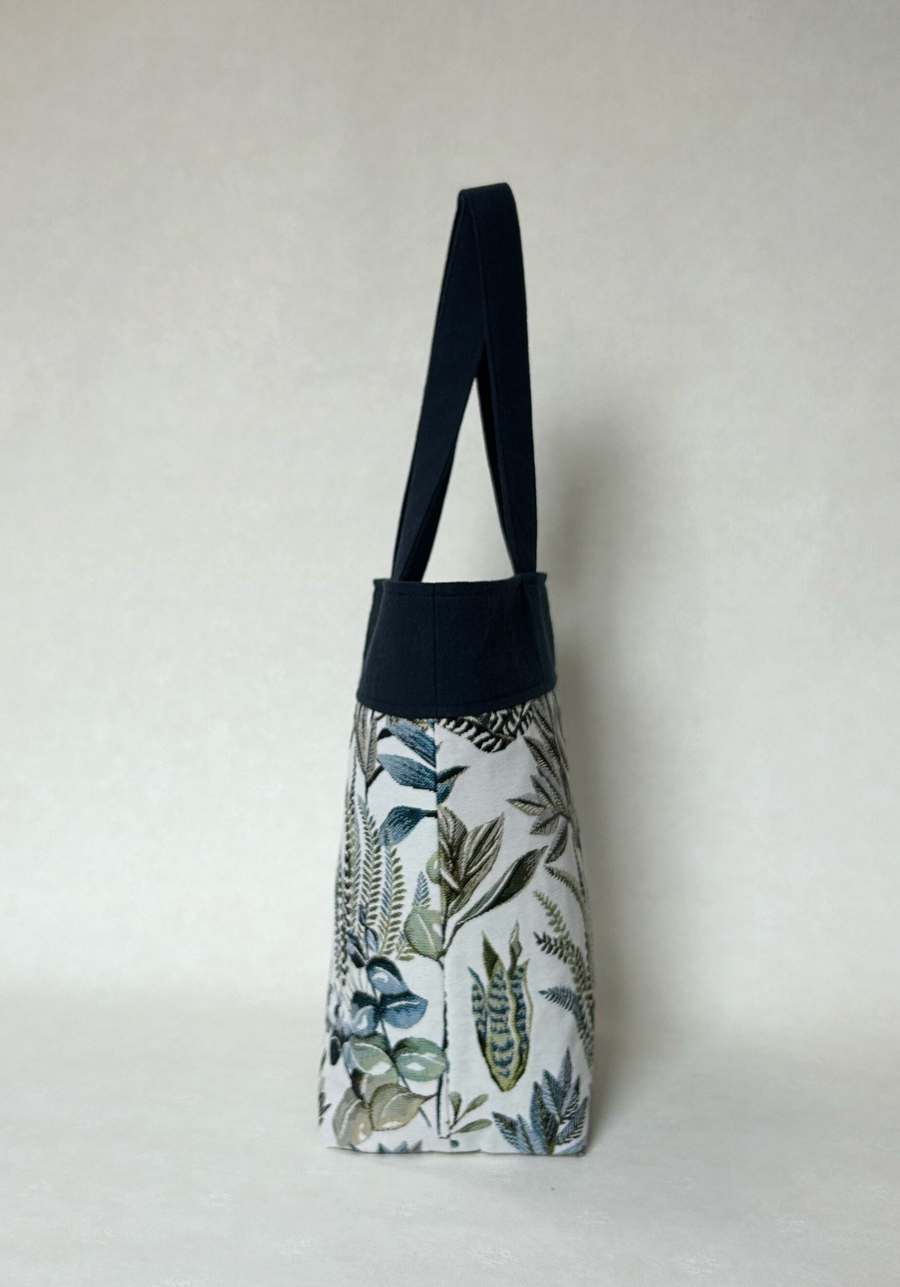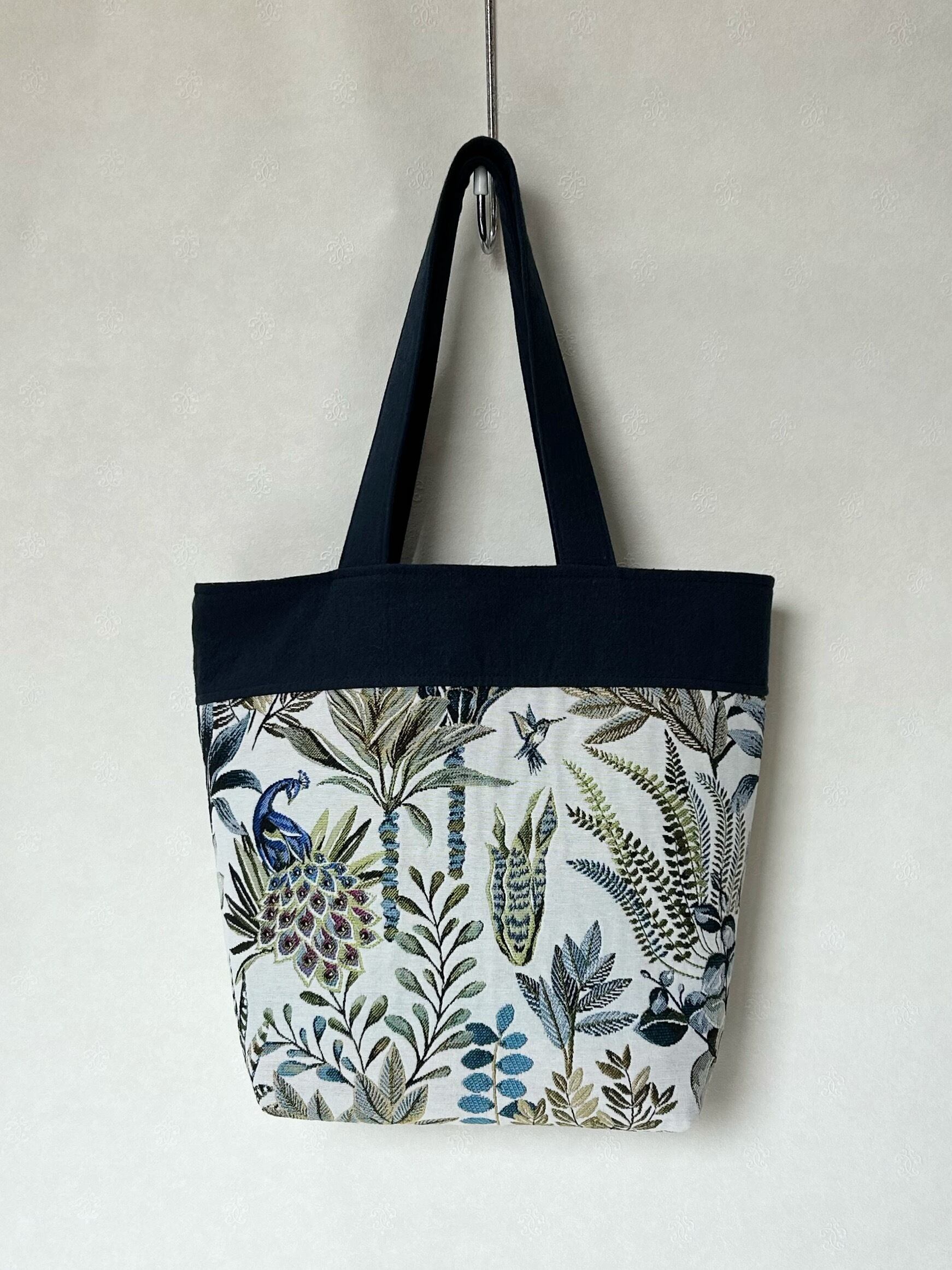 優雅なボタニカル柄が目を引くジャガード織でアート色が濃いフランスの生地を使用した大きめの横型ショルダートートバッグです。