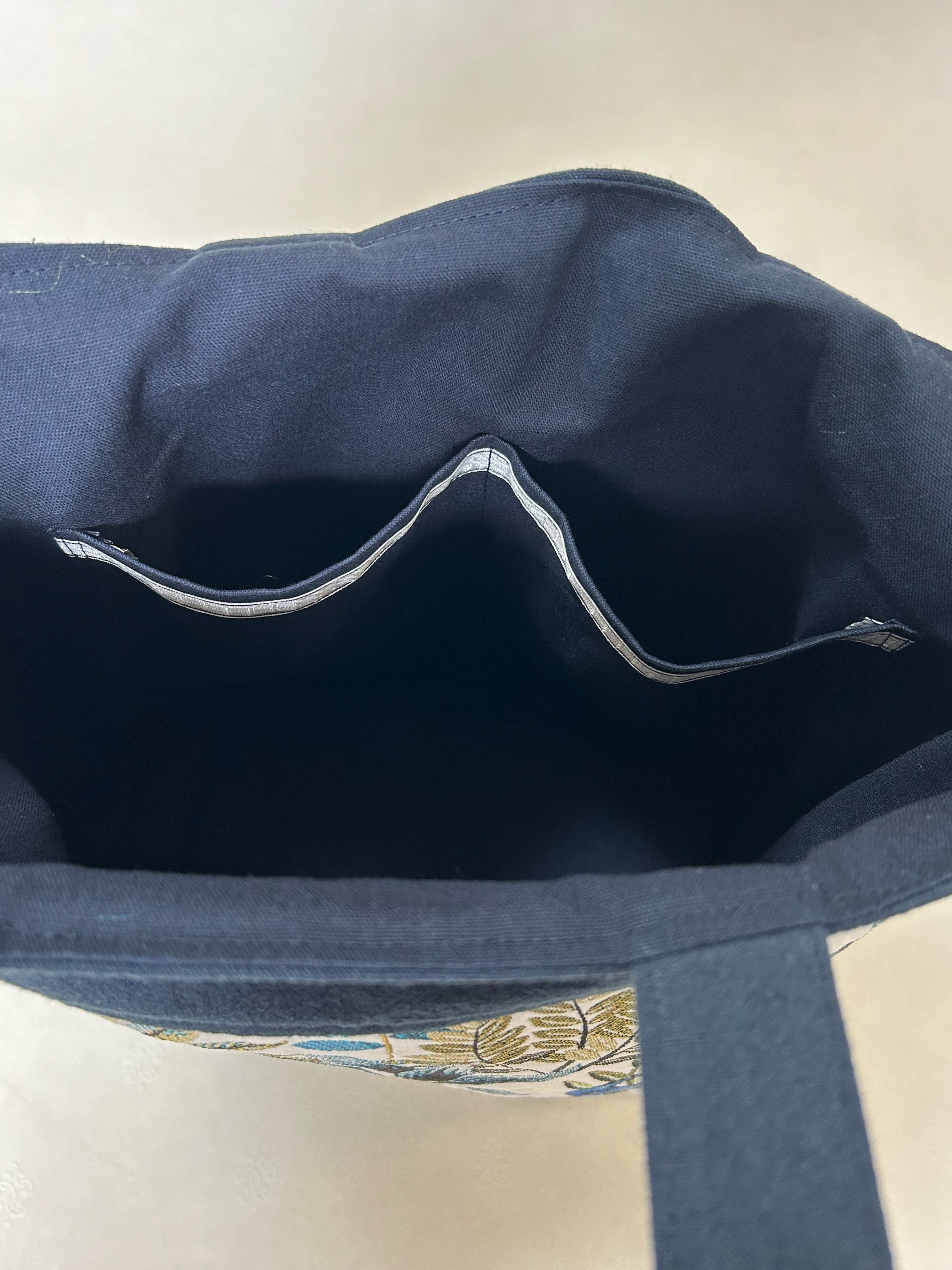 上部切り替え部分と持ち手は紺色の厚手の綿麻生地を使用。全体が引き締まった印象になりました。