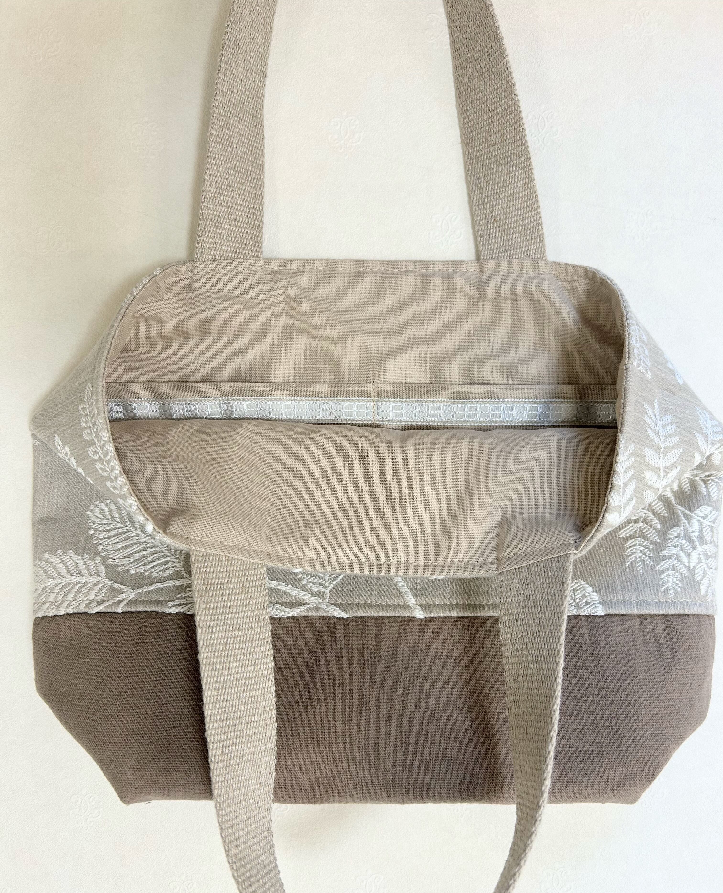 共布で作る内ポケットは目立ちにくく探す事があるので、ポケット口にリボンテープを縫い付け、分かり易くしました。便利なだけでなく中が見えた時にもお洒落です。