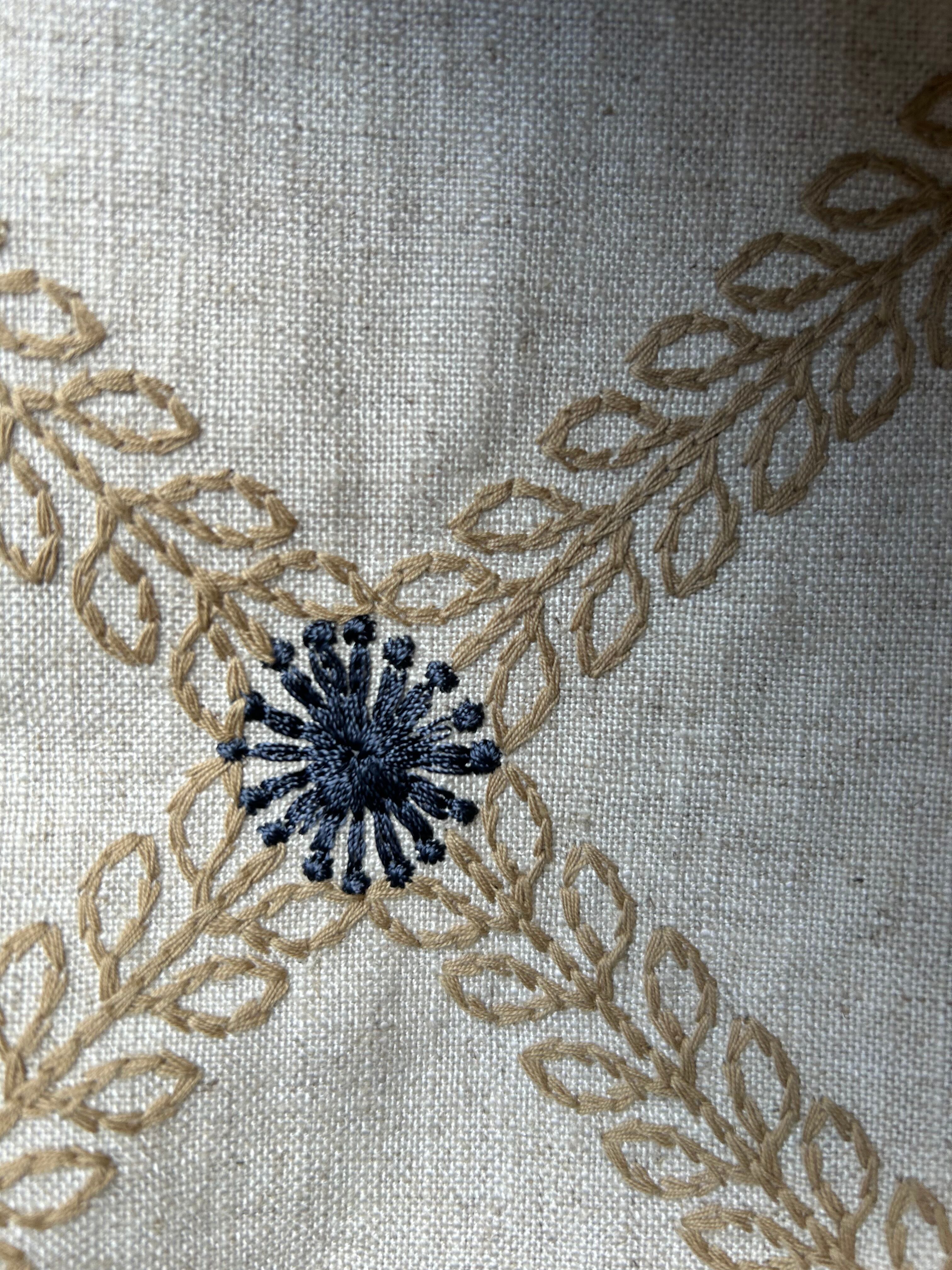 クロス部分の花刺繍に合わせて厚手の綿麻生地のブルーをツートンカラーにしました。