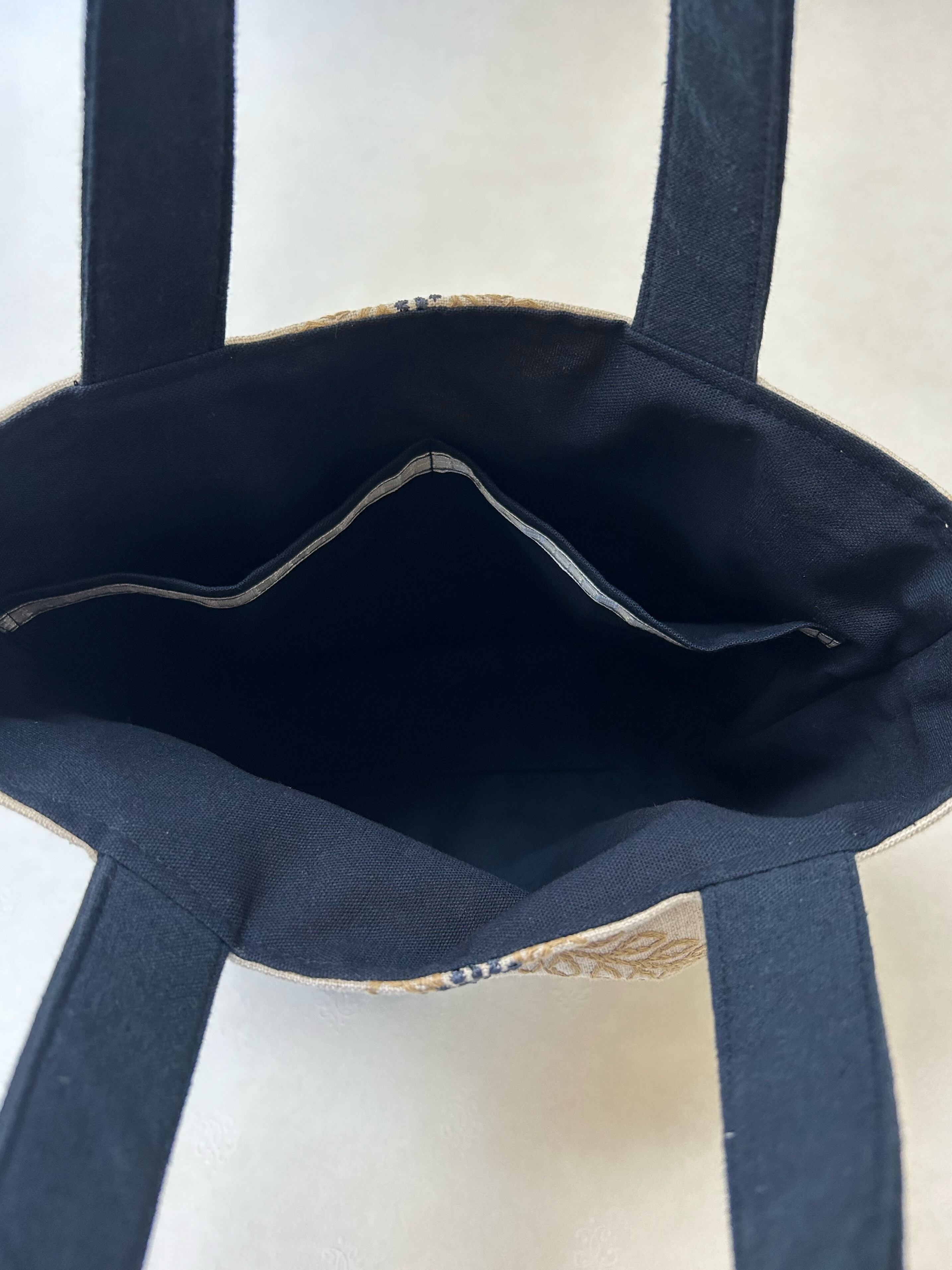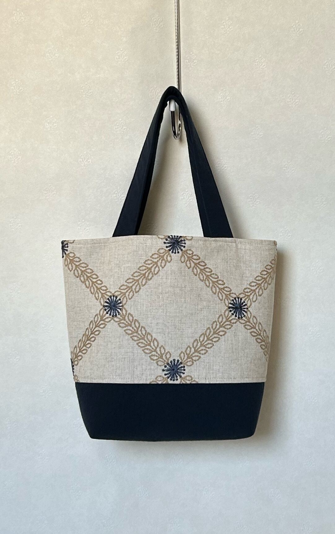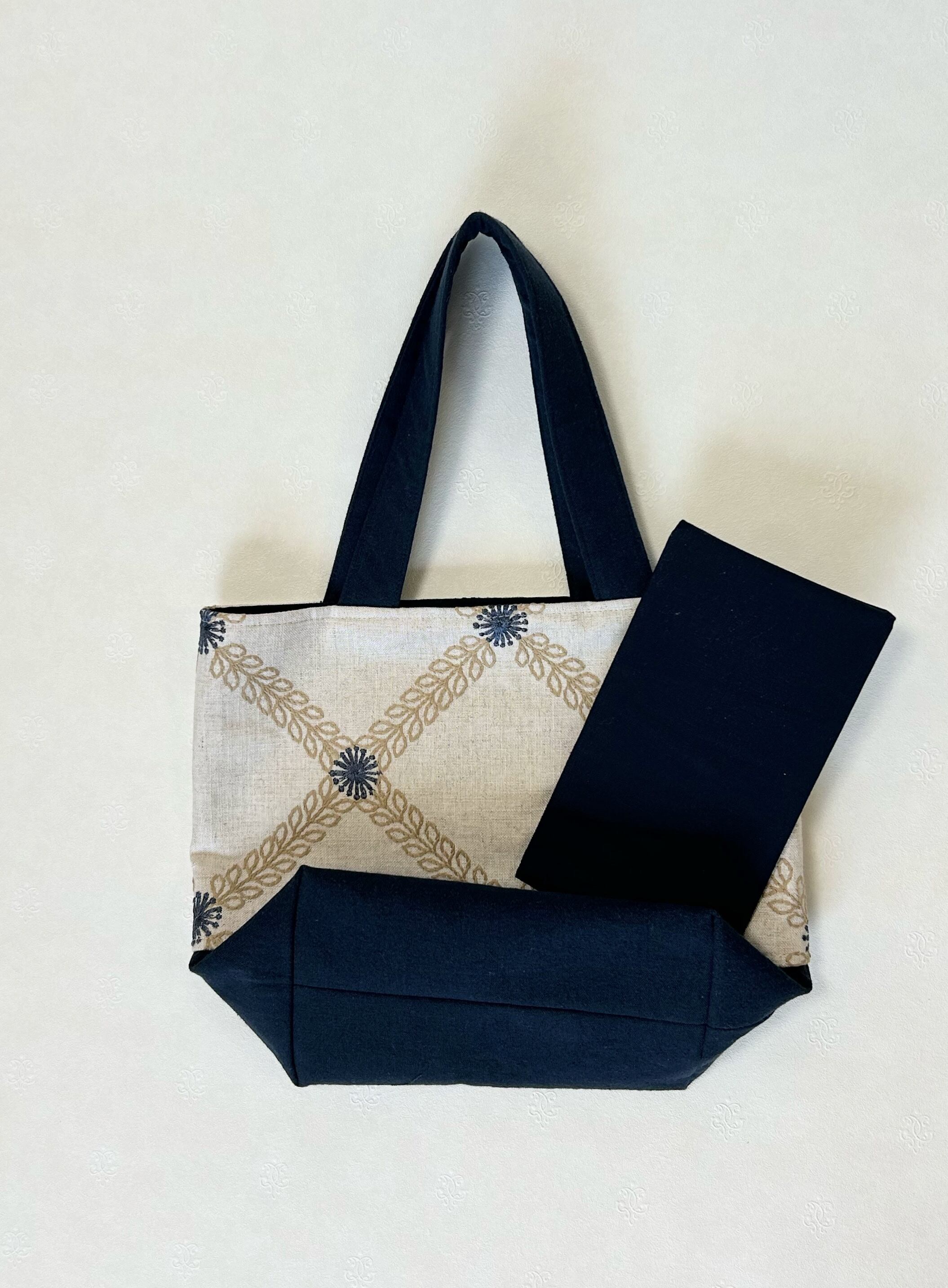 持ち手もツートンカラーと同じ生地で芯を貼り作っています。統一感もあり引き締まった印象になりました。