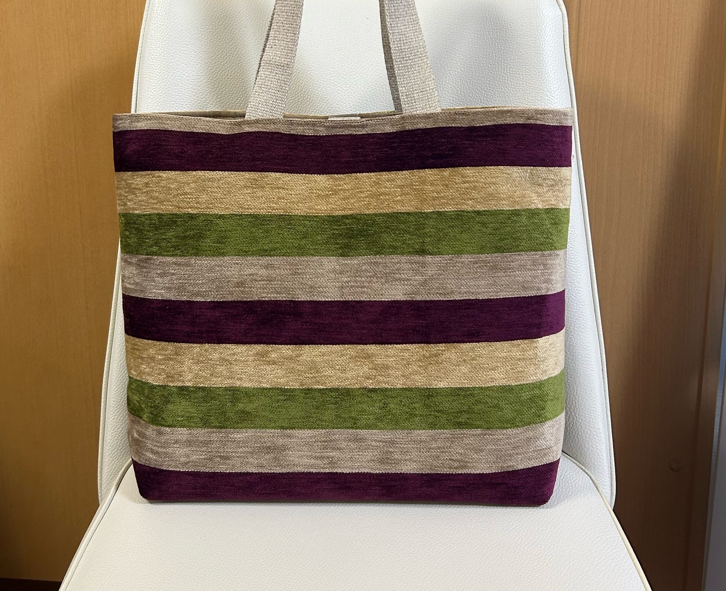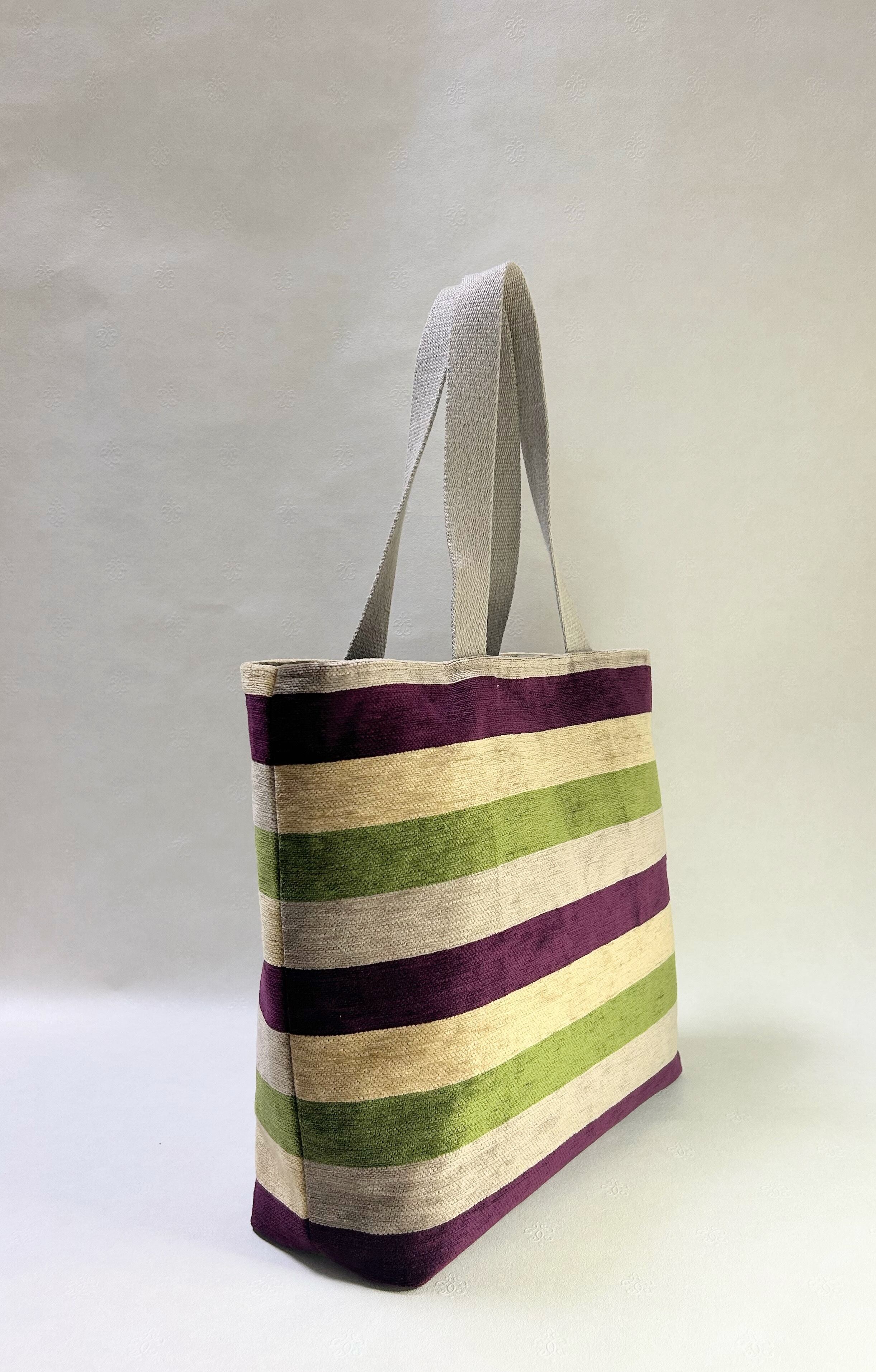 スペインのモールジャガード生地で紫色、緑色、クリーム色、ベージュのオータムカラーのストライプ柄のバックです。