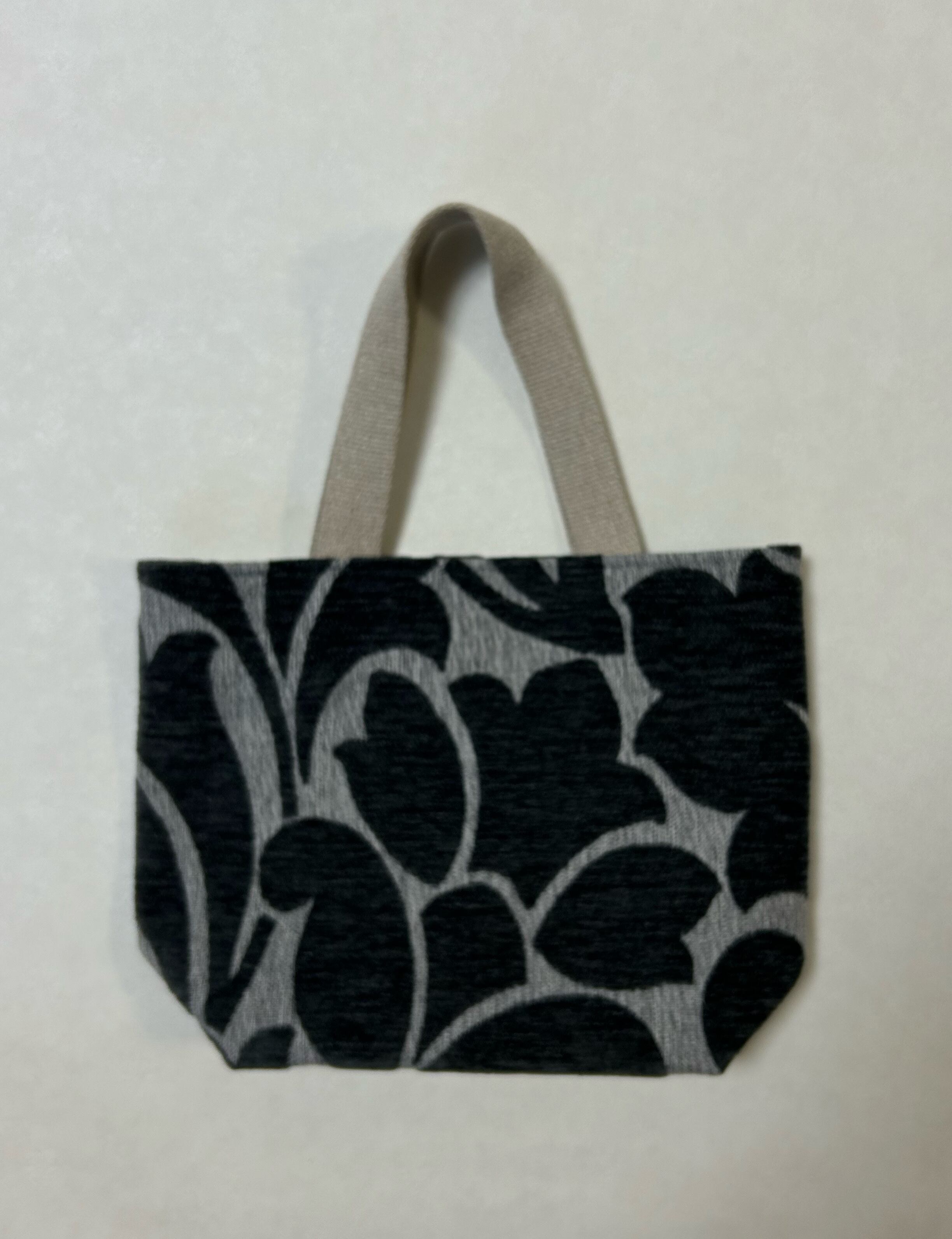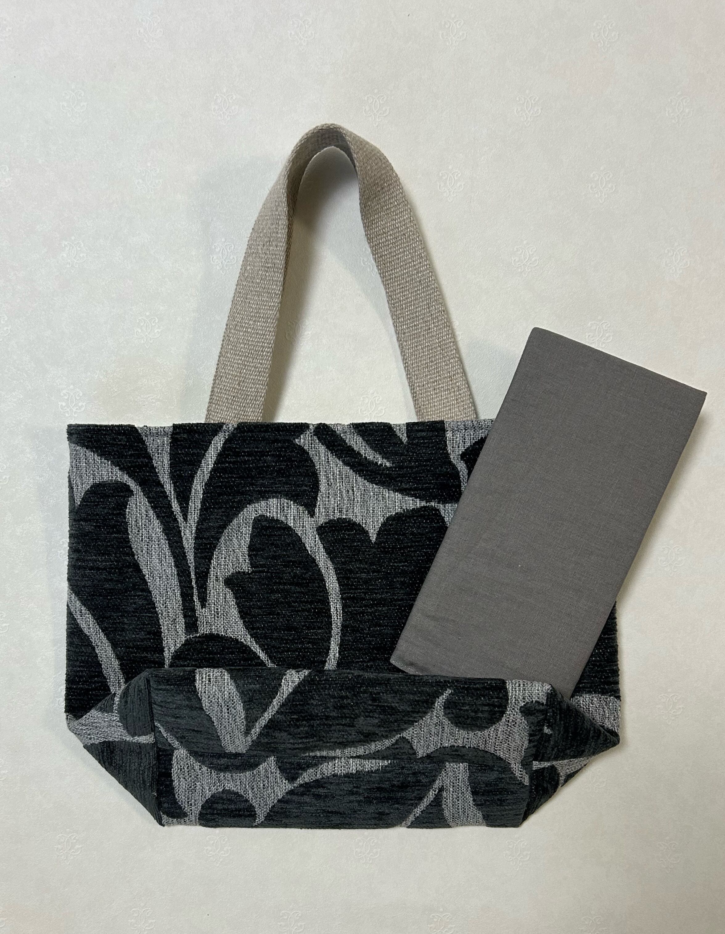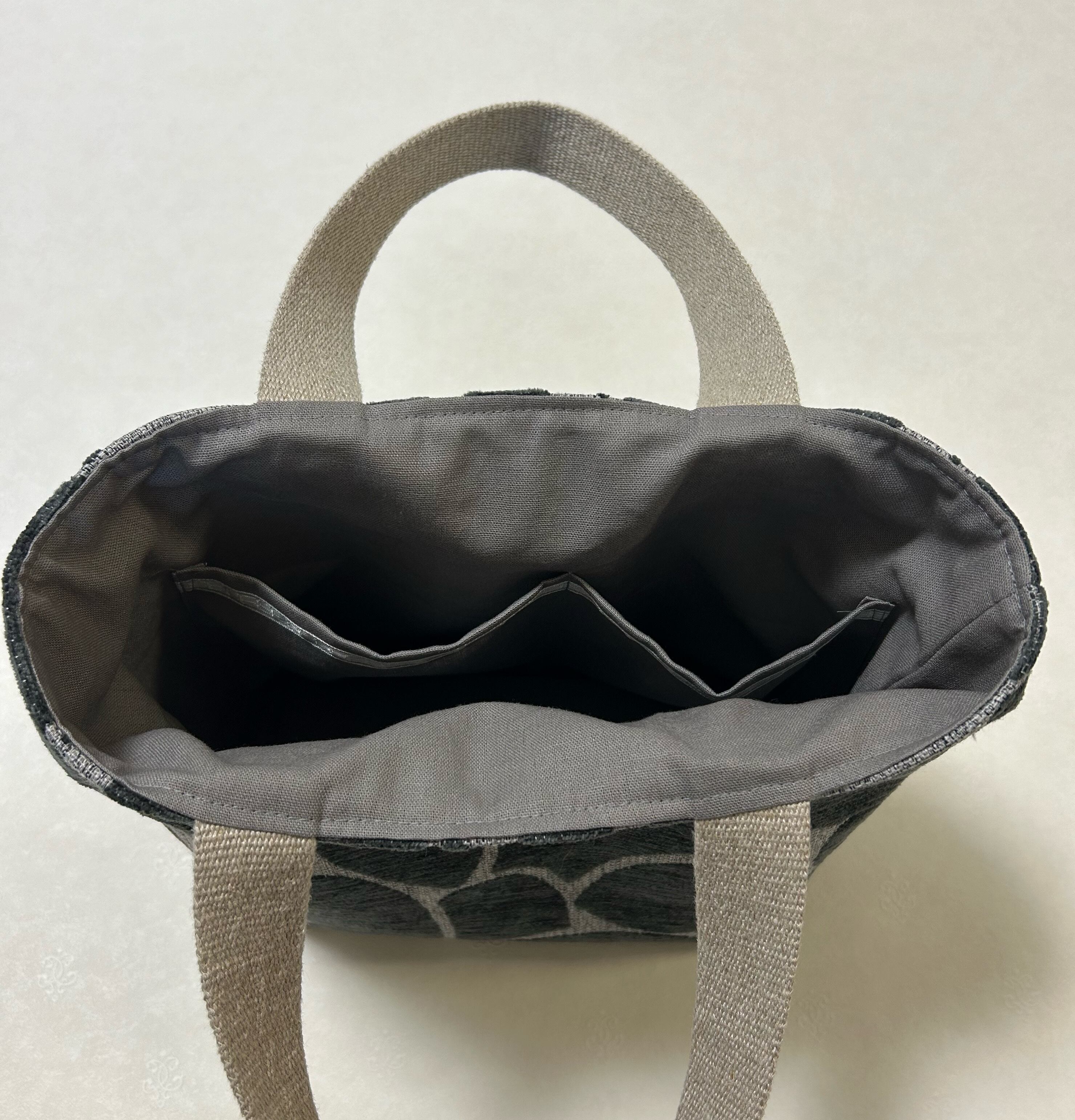 スペインのグレーのモールジャガード生地を使用したトートバッグです。シンプルながらも、微細なジャガード織りで高級感あり手触りも良く、落ち着いた色合いで、どんなスタイルにも合わせやすく、日常使いにピッタリです。しっかりした接着芯を貼っているので自立もします。